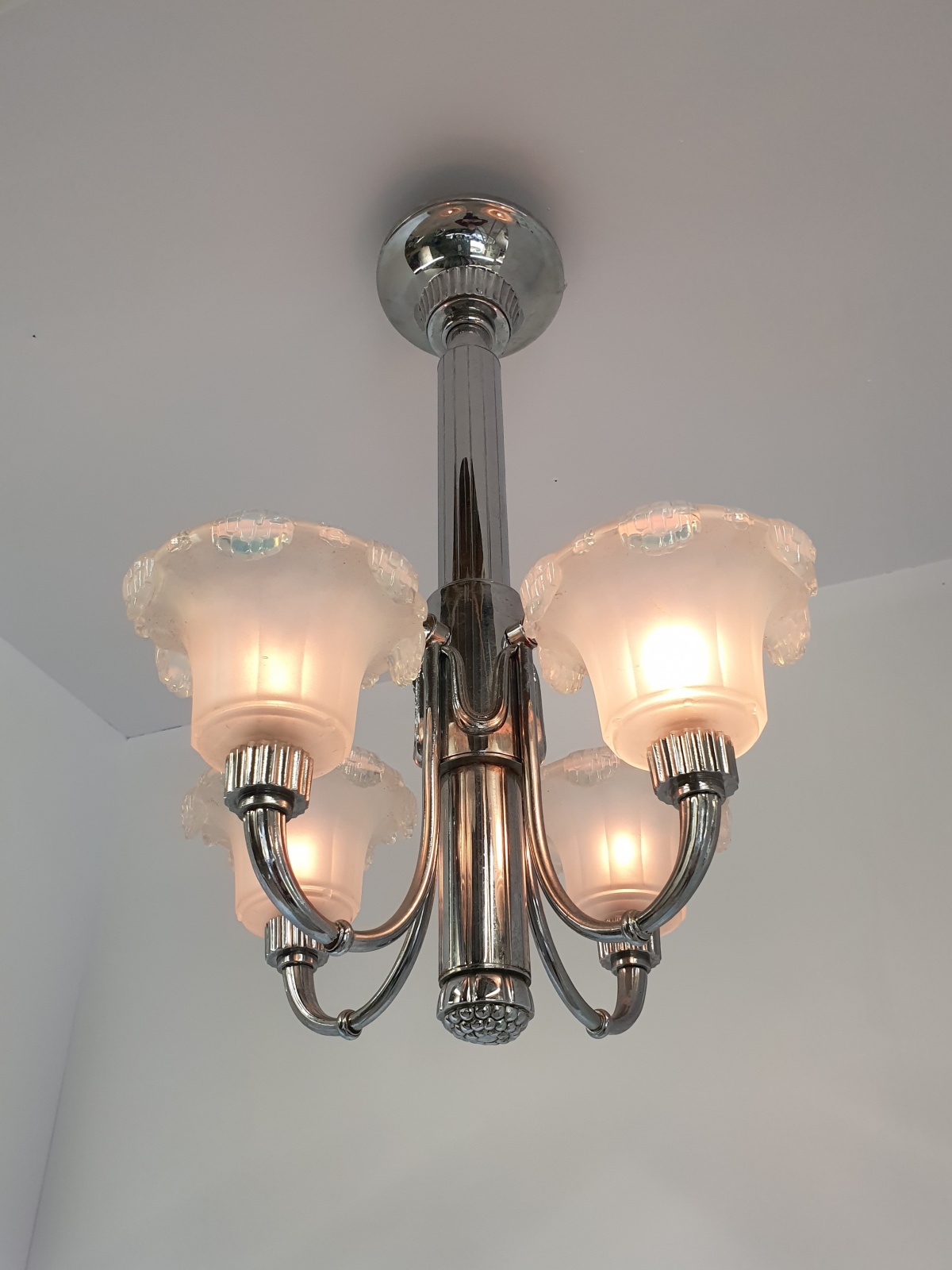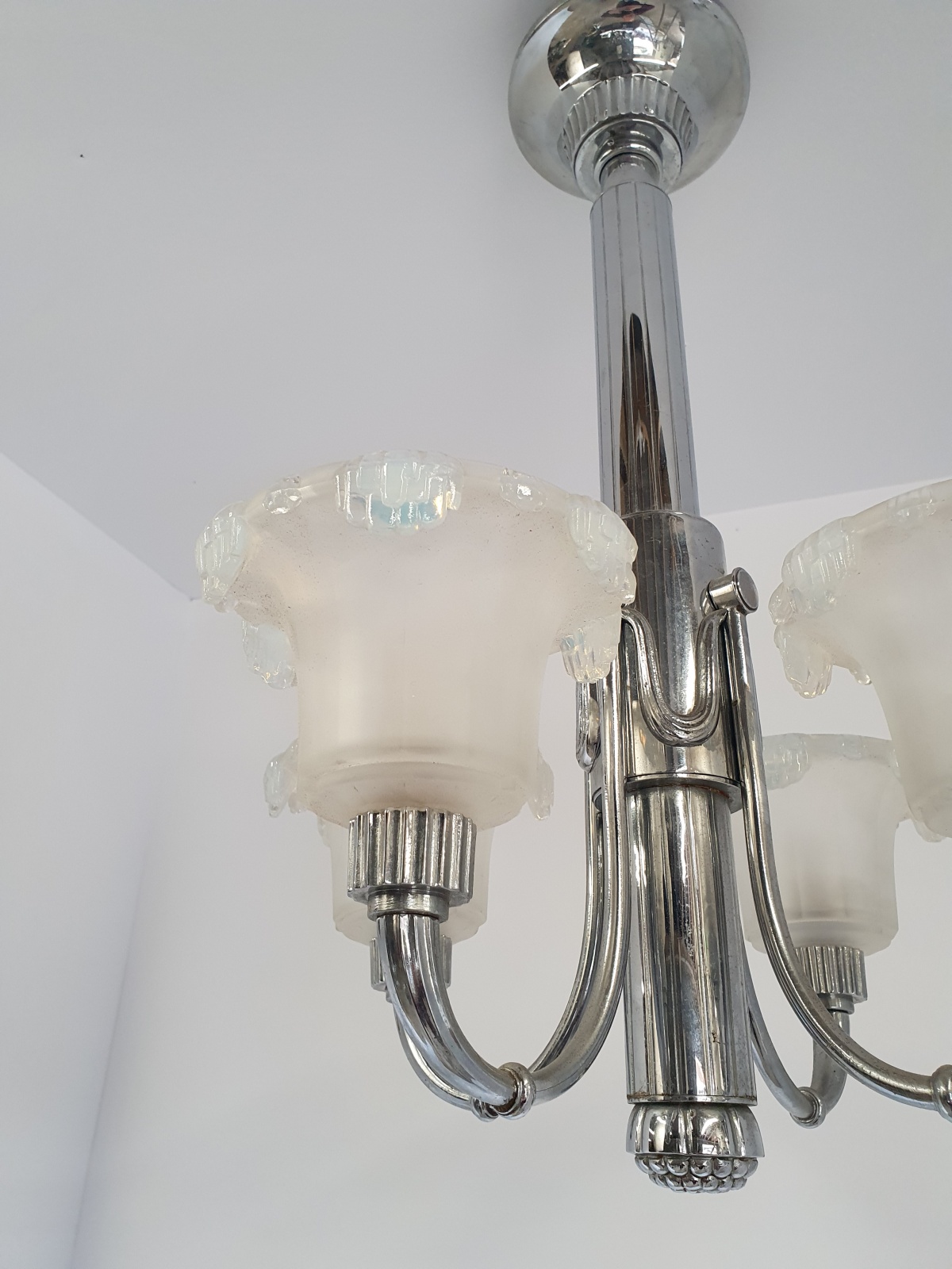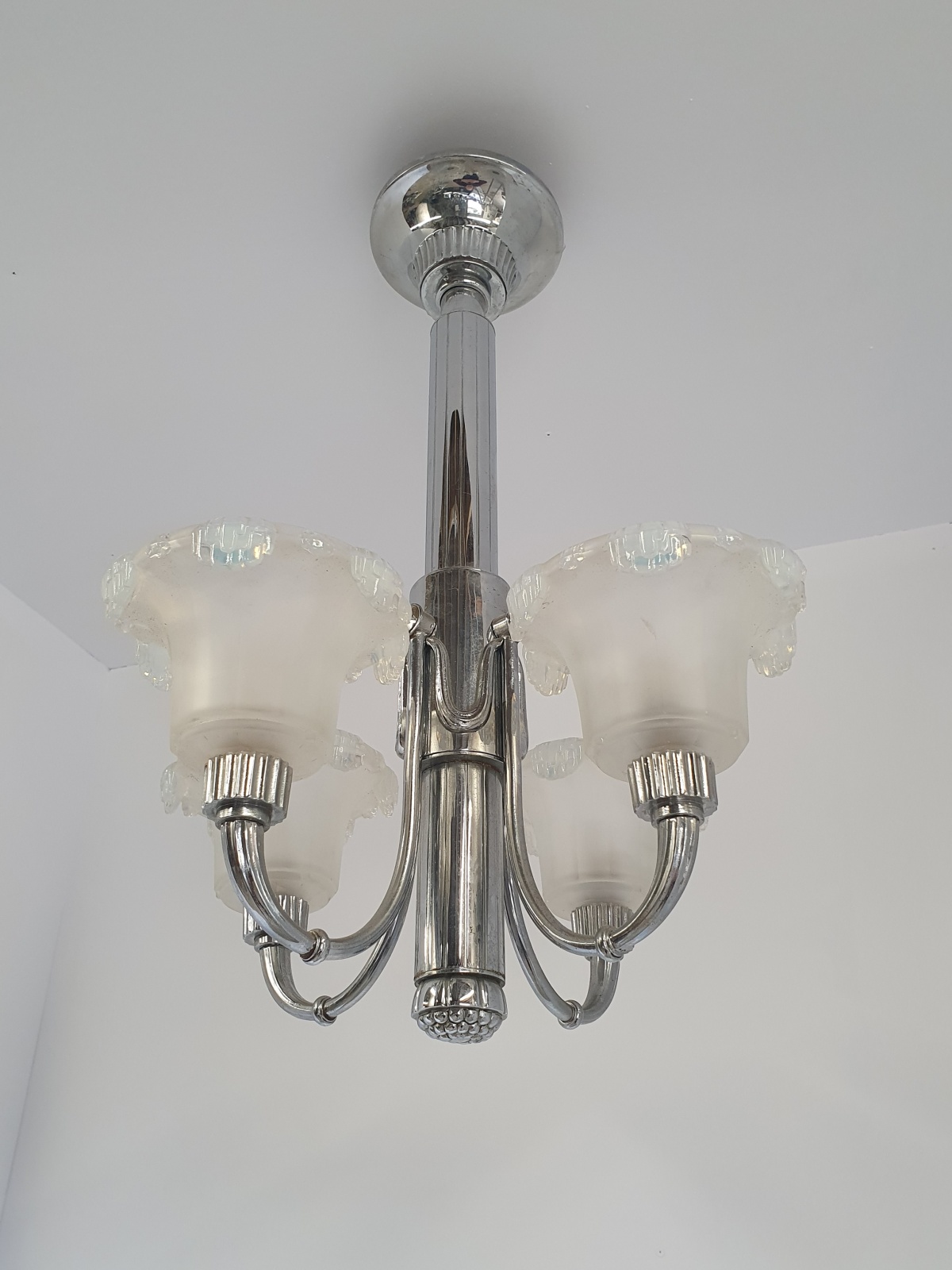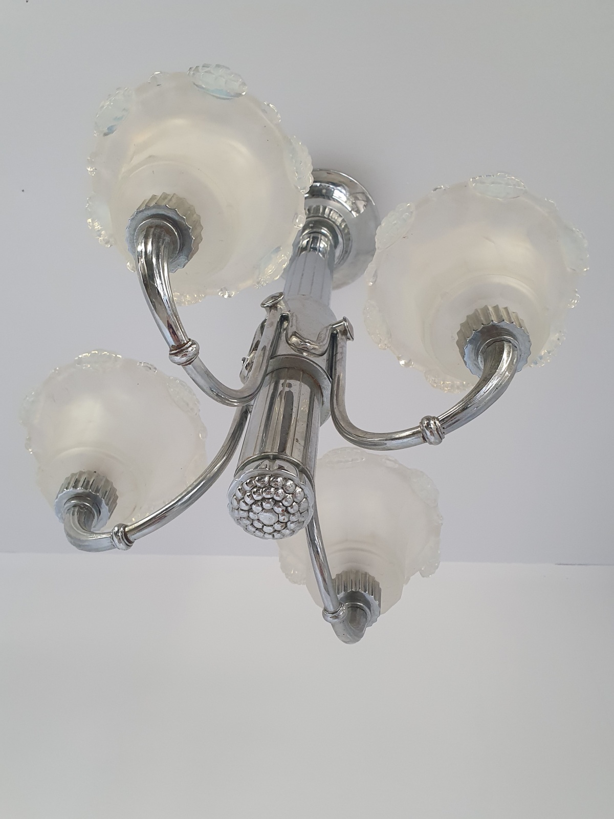Product Code: JAL0127A fabulous quality modernist 4 branch art deco ceiling light certainly by Atelier Petitot but apparently unsigned. The chrome-plated bronze fitment supporting the rare original opalescent glass lampshades by établissement Jean Gauthier (E.J.G), Ezanville(Ezan). France c.1930