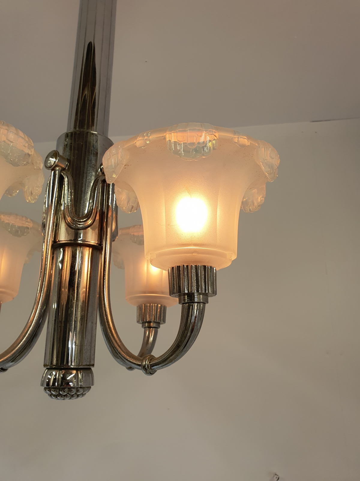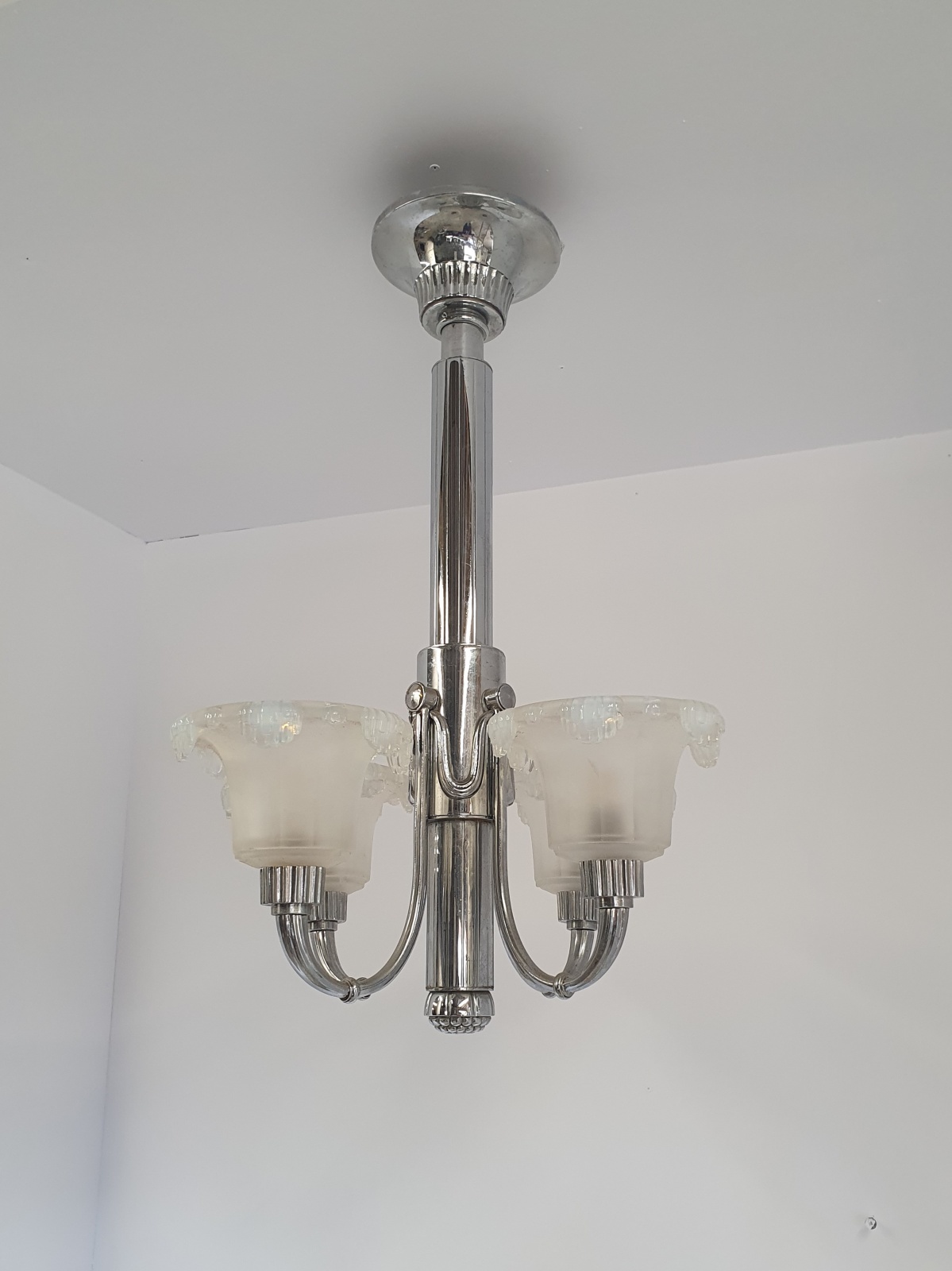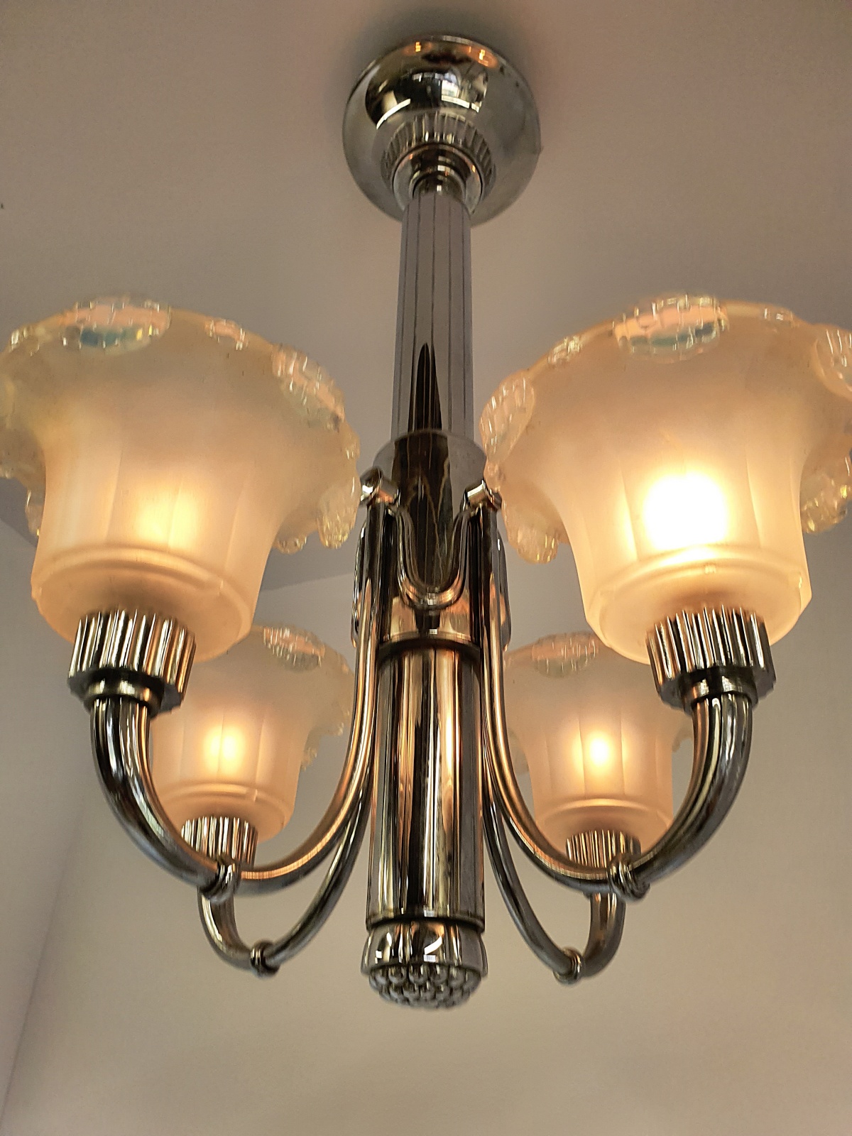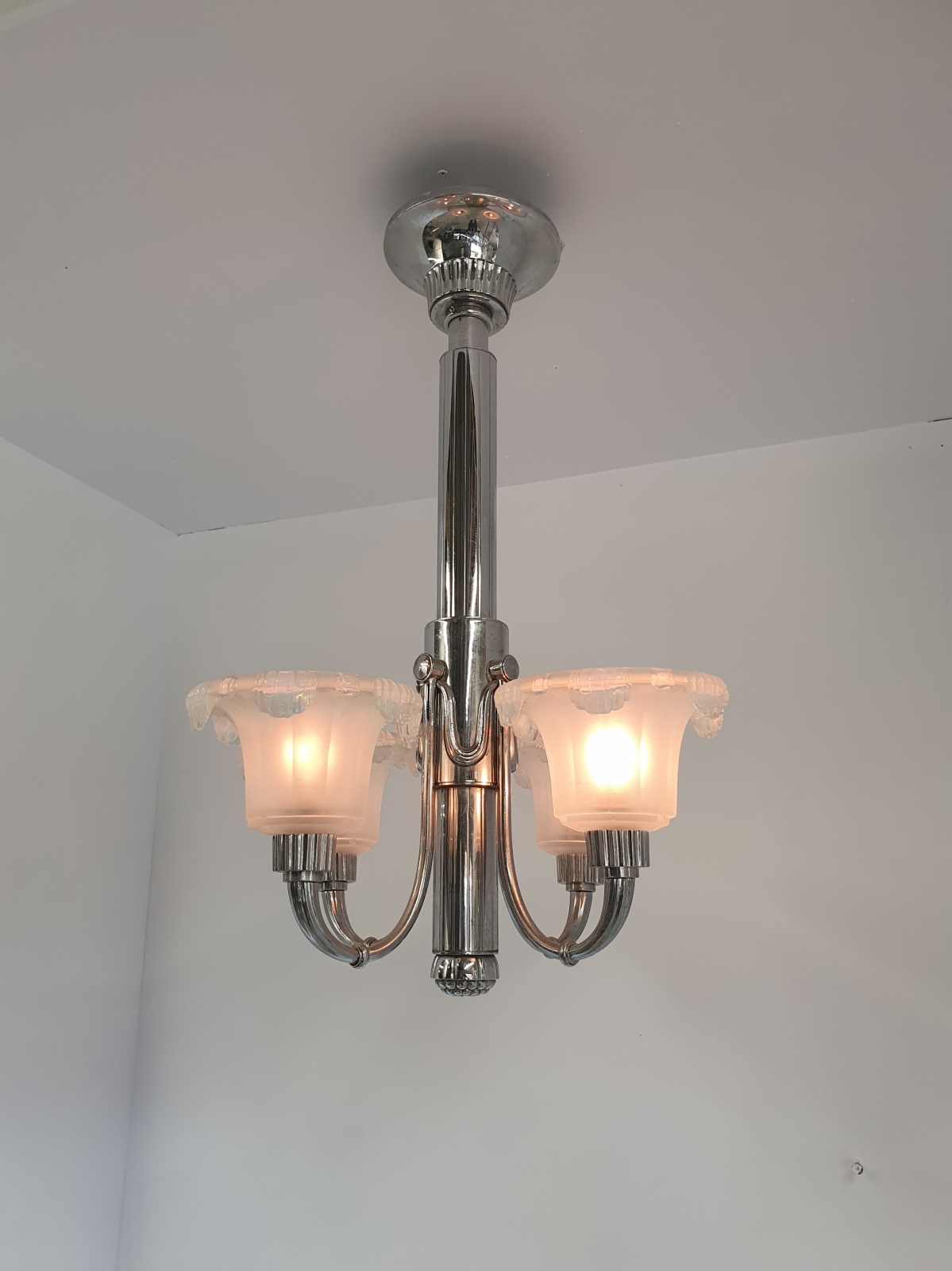 Product Code: JAL0127A fabulous quality modernist 4 branch art deco ceiling light certainly by Atelier Petitot but apparently unsigned. The chrome-plated bronze fitment supporting the rare original opalescent glass lampshades by établissement Jean Gauthier (E.J.G), Ezanville(Ezan). France c.1930