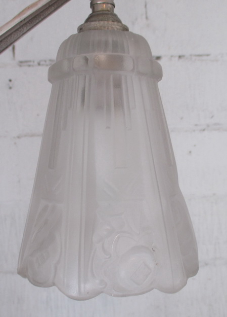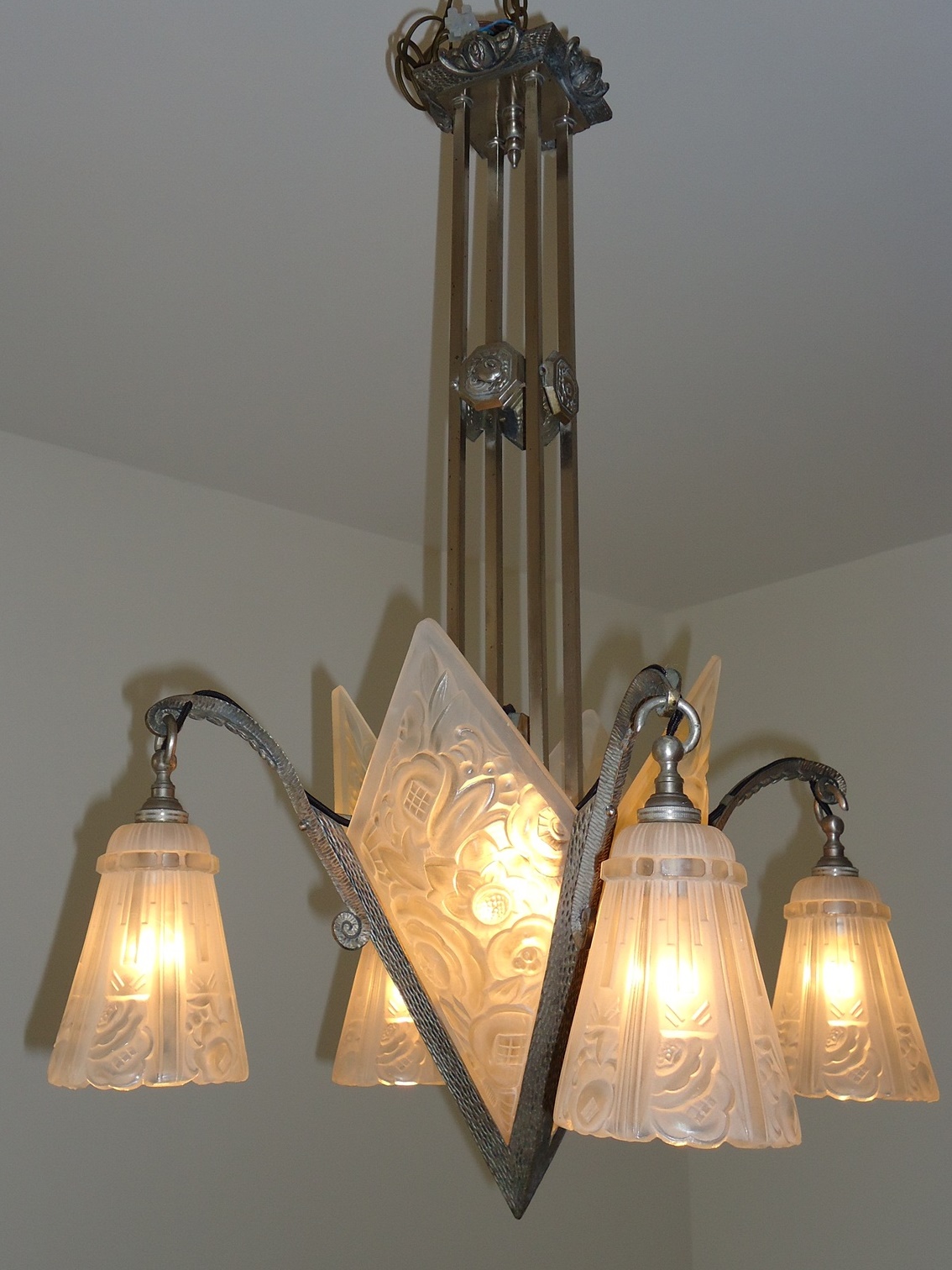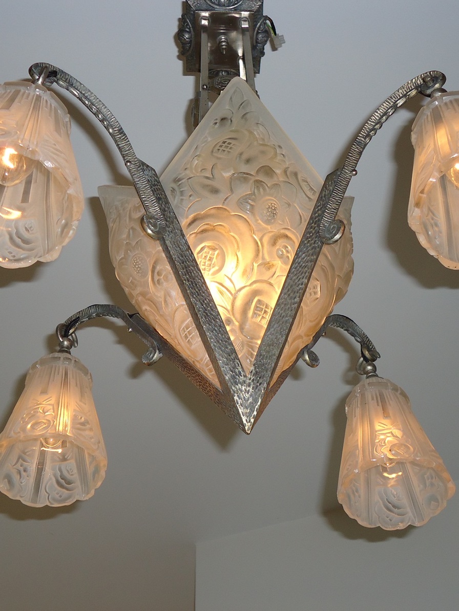 Product Code: JAL0176A good quality art deco chandelier by Etablissement Jean Gauthier (E.J.G), Rue J.Robert Paris. The polished and moulded glass of abstract design set into a nickel-plated bronze frame is apparently unsigned. France c1925