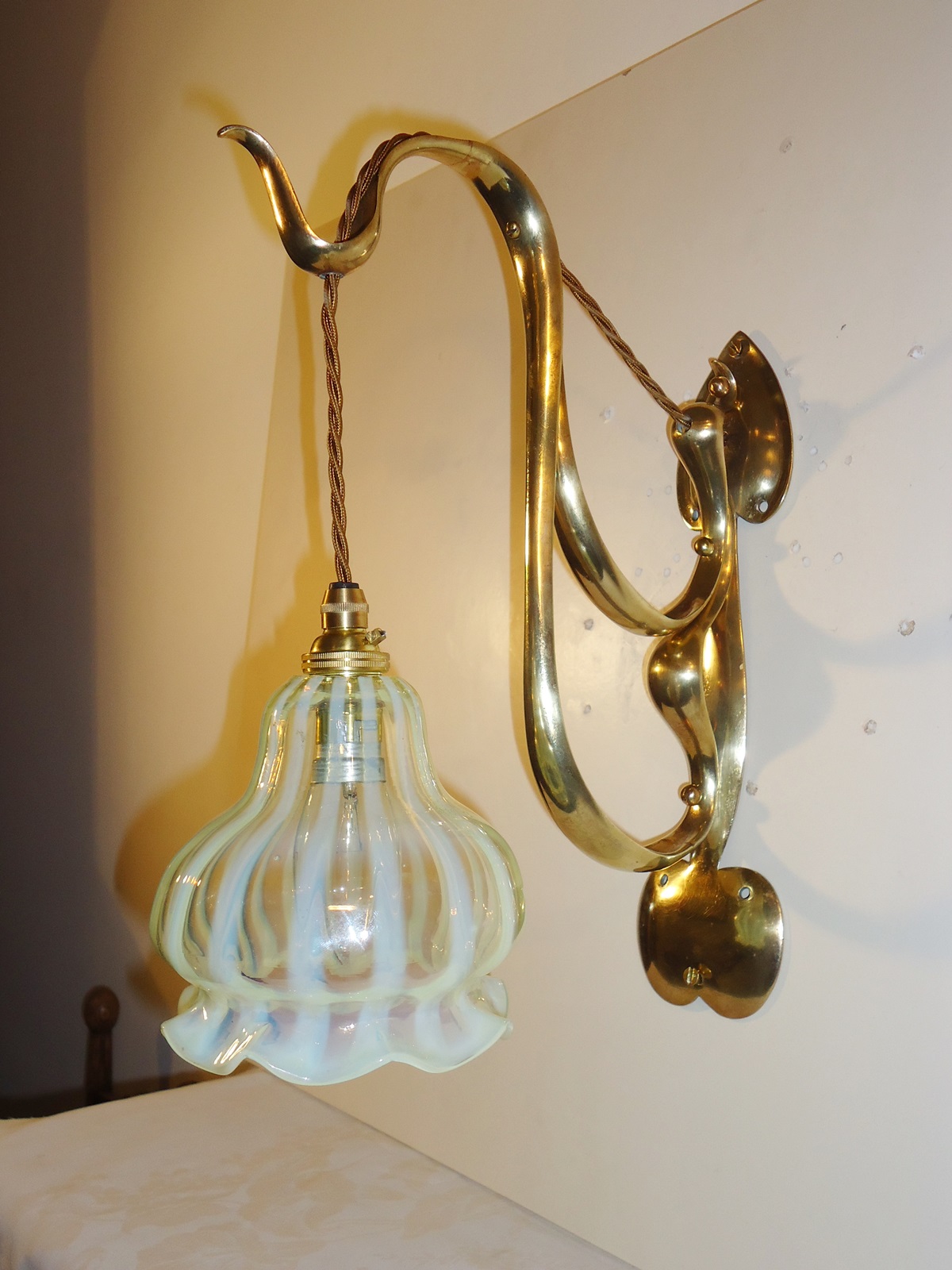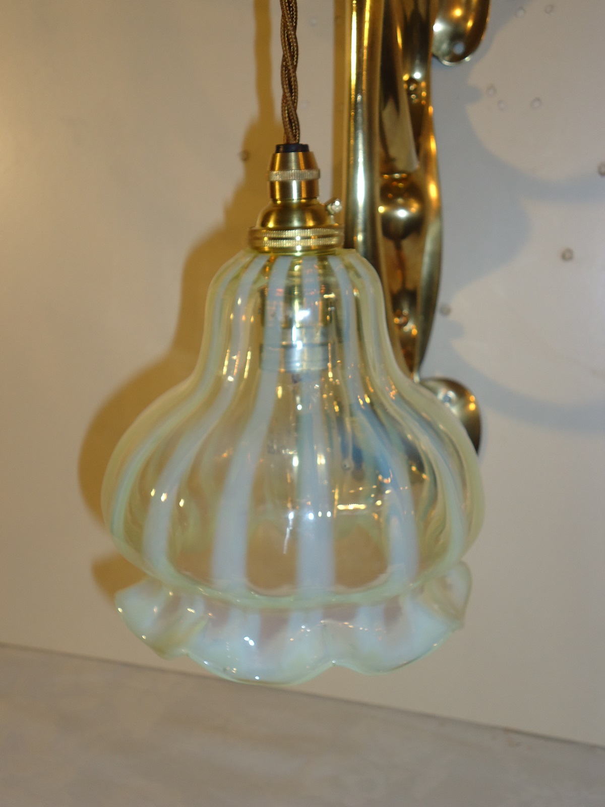 Product Code: JAL0113An impressive pair of cast brass art nouveau wall lights by James Hinks & Son now complimented with a good straw-opalescent vaseline-glass lampshade, England c.1905.