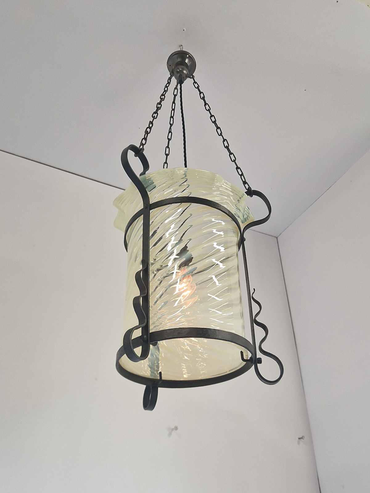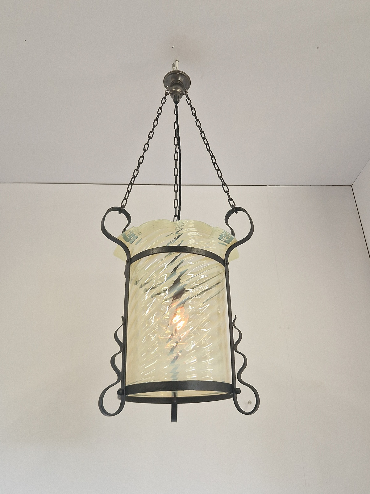 A large and impressive arts and crafts wrought-iron lantern with vaseline glass cylinder of strong opalescence attributed to James Powell & Sons of Whitefriars Glassworks c.1895.
