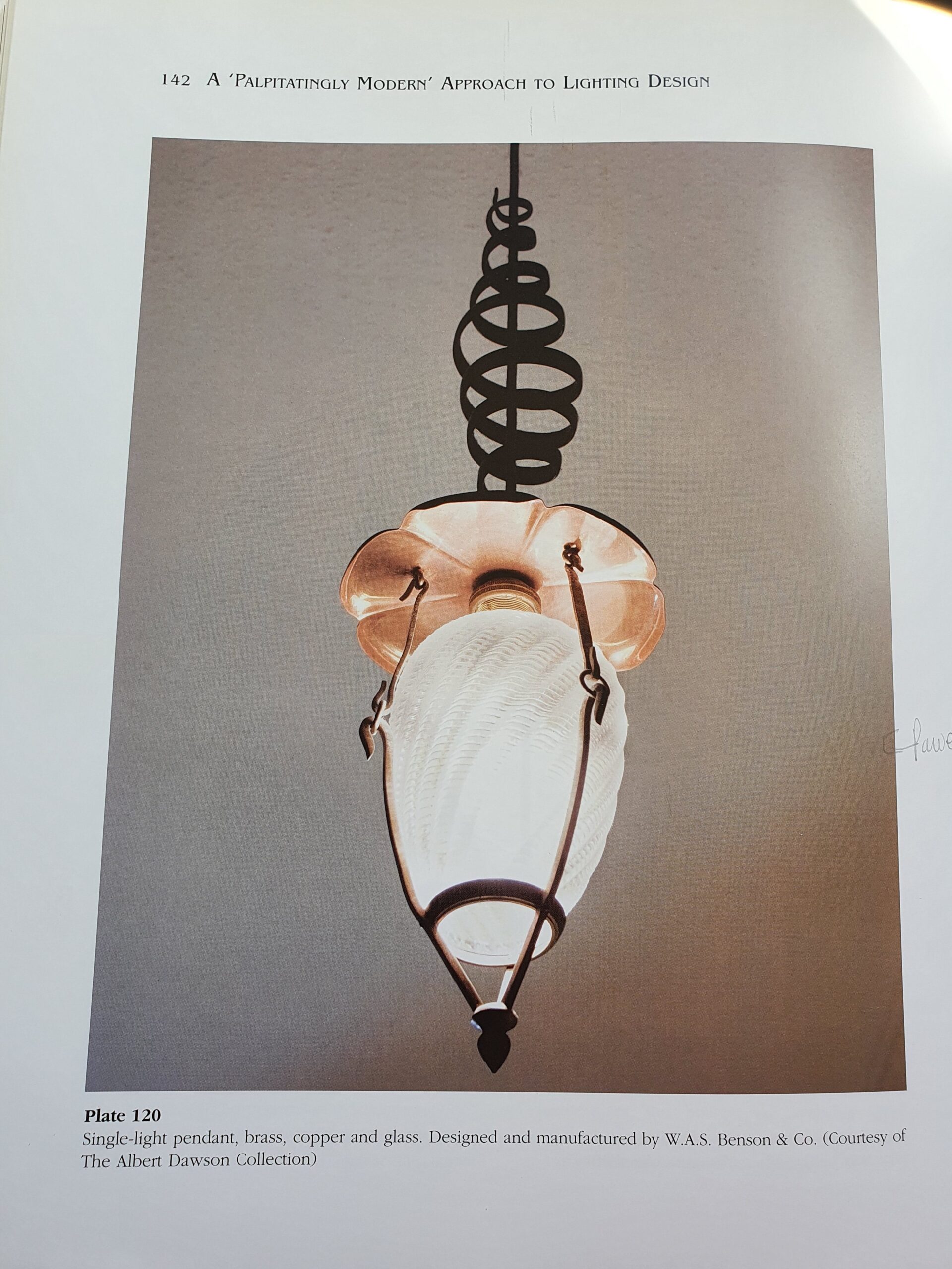 - W.A.S Benson, Ian Hamerton, P.142, Plate 120 matching James Powell design “flint”-glass lampshade on W.A.S Benson light.