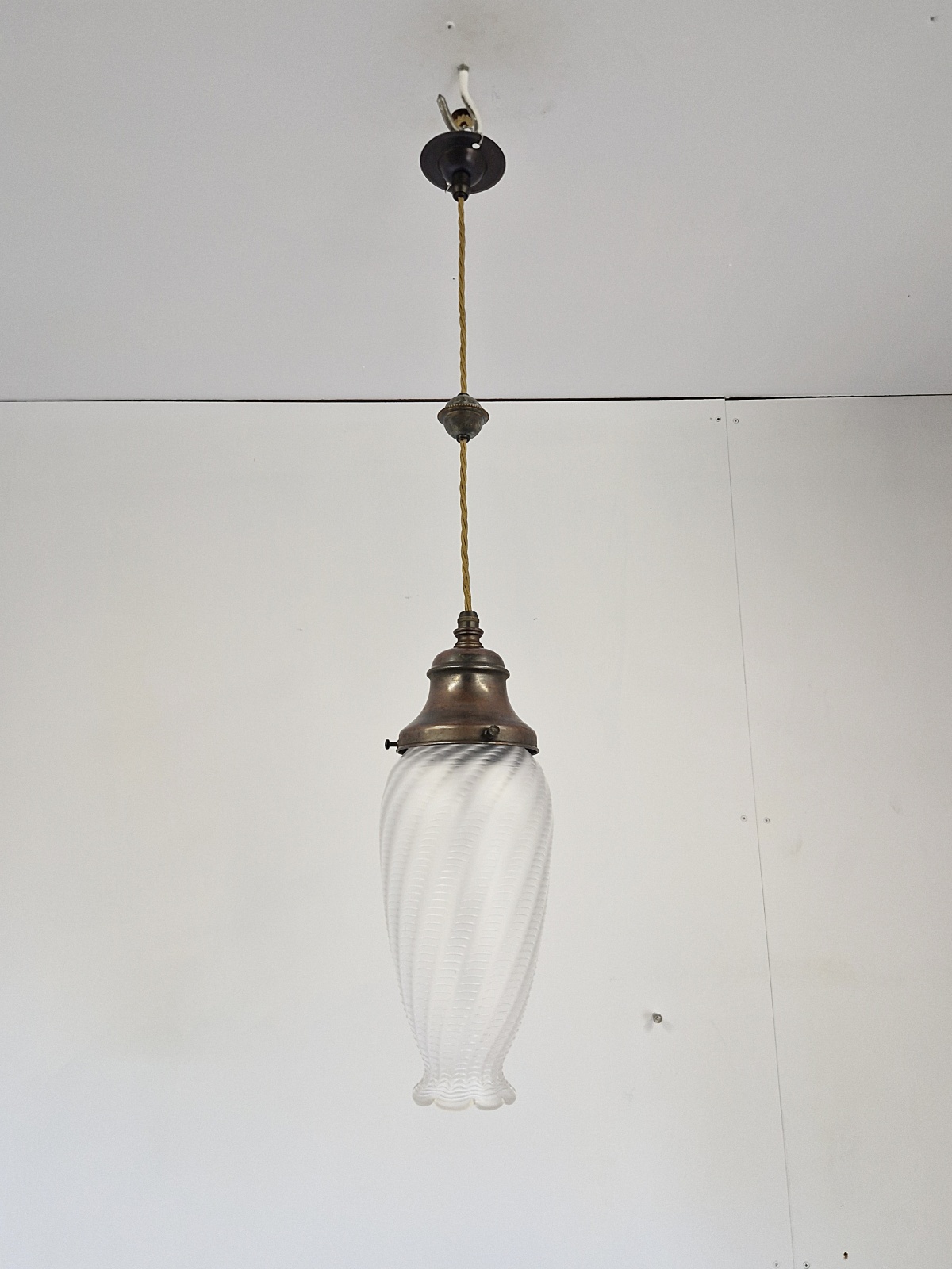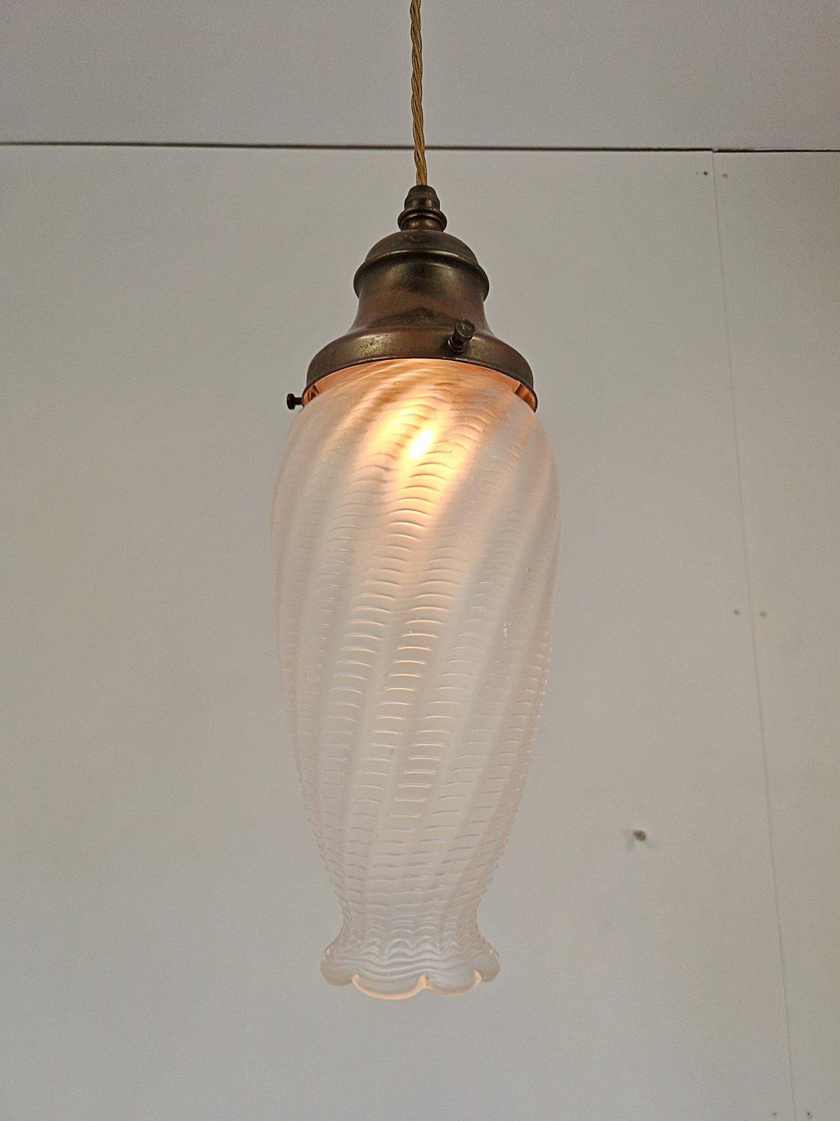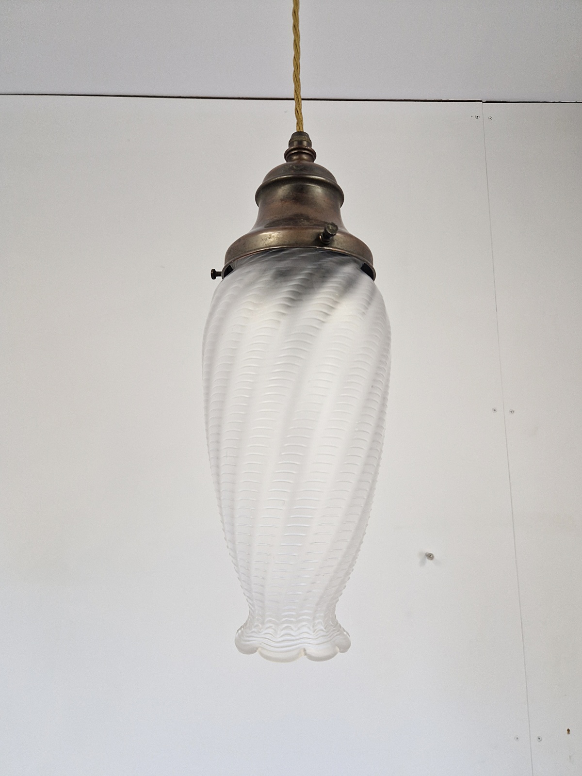 Product Code: JAL0171A large rare satin-glass arts and crafts lantern. The glass in the distinctive “flint” pattern of James Powell & Sons (Whitefriars Glassworks). Displayed with original bronze gallery and flex spacer with replacement ceiiling rose for suspension. England c1900