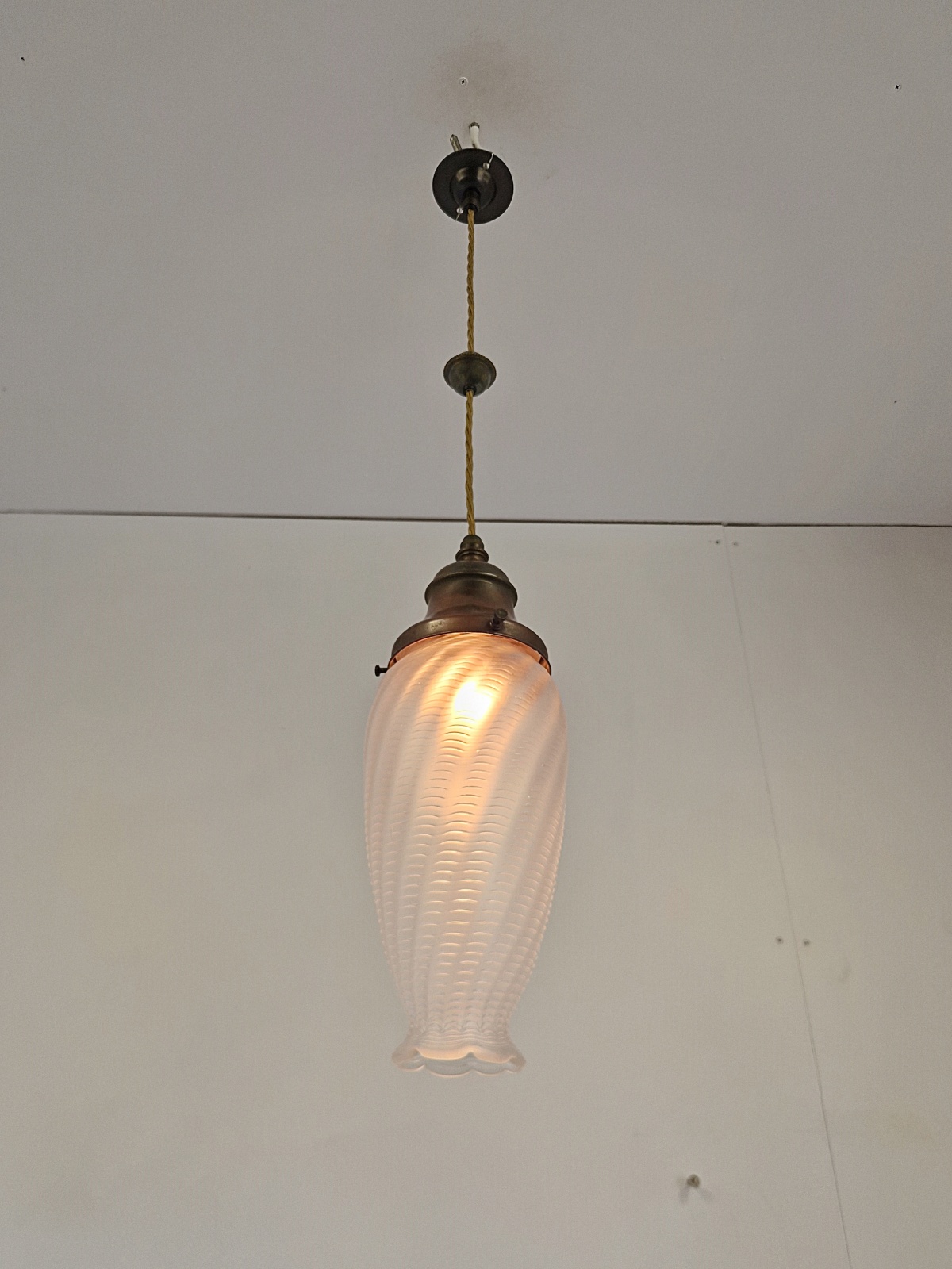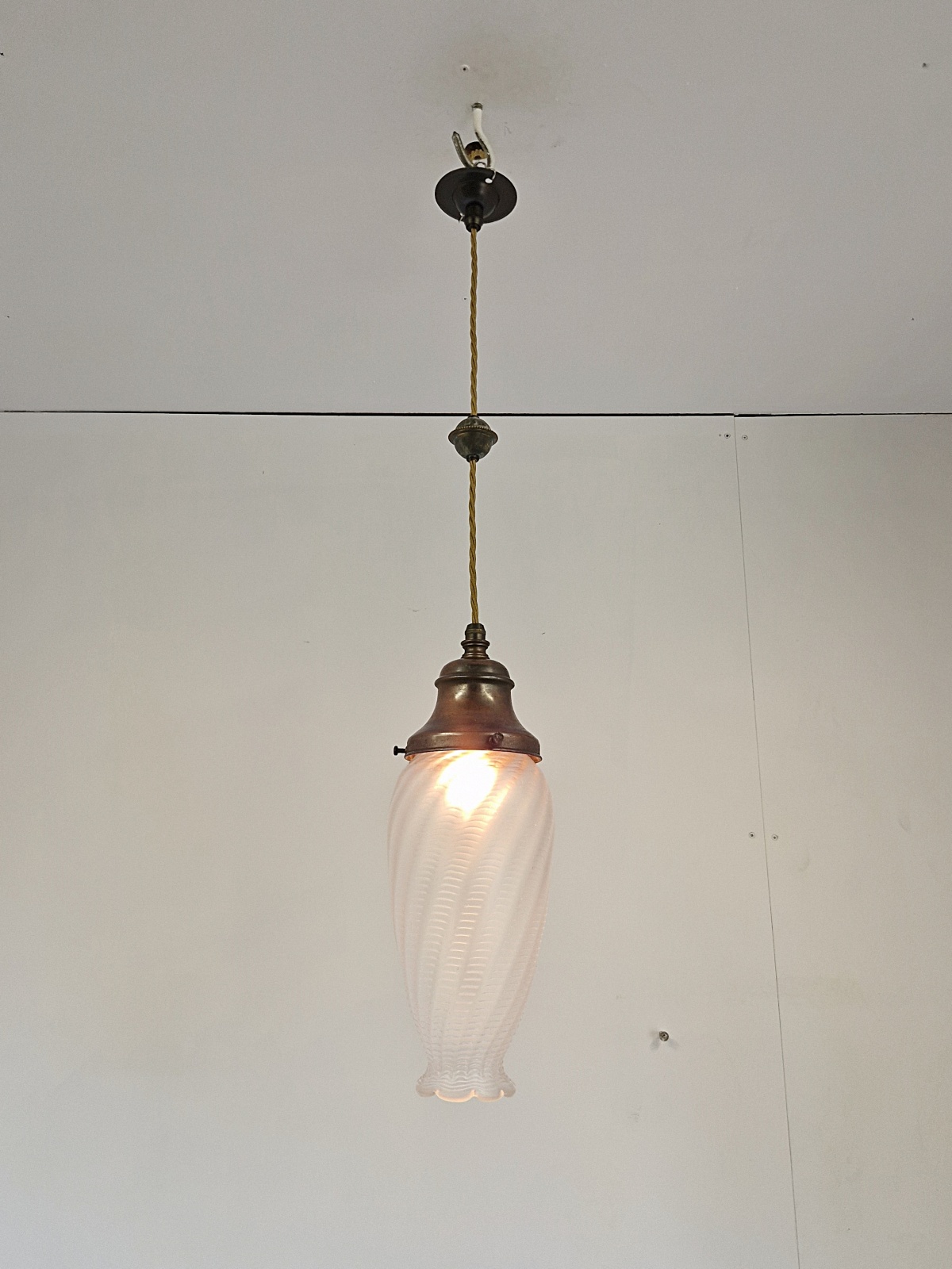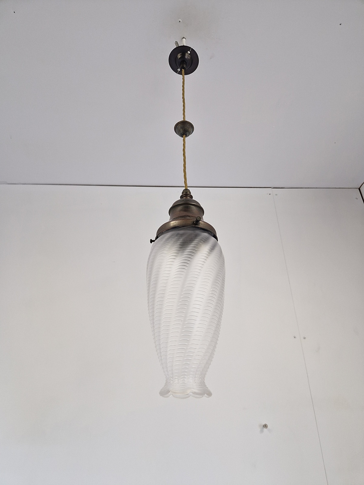Product Code: JAL0171A large rare satin-glass arts and crafts lantern. The glass in the distinctive “flint” pattern of James Powell & Sons (Whitefriars Glassworks). Displayed with original bronze gallery and flex spacer with replacement ceiiling rose for suspension. England c1900