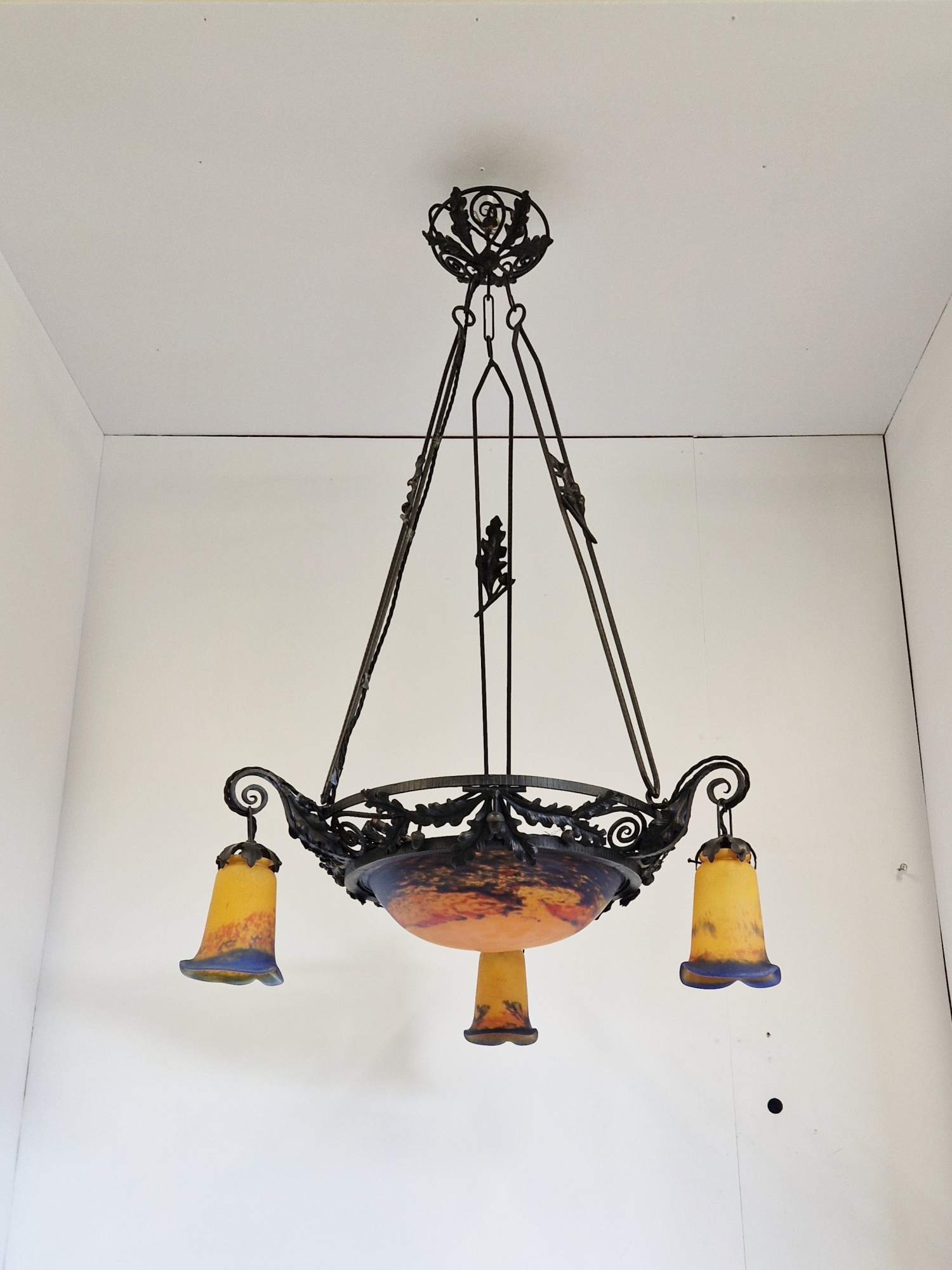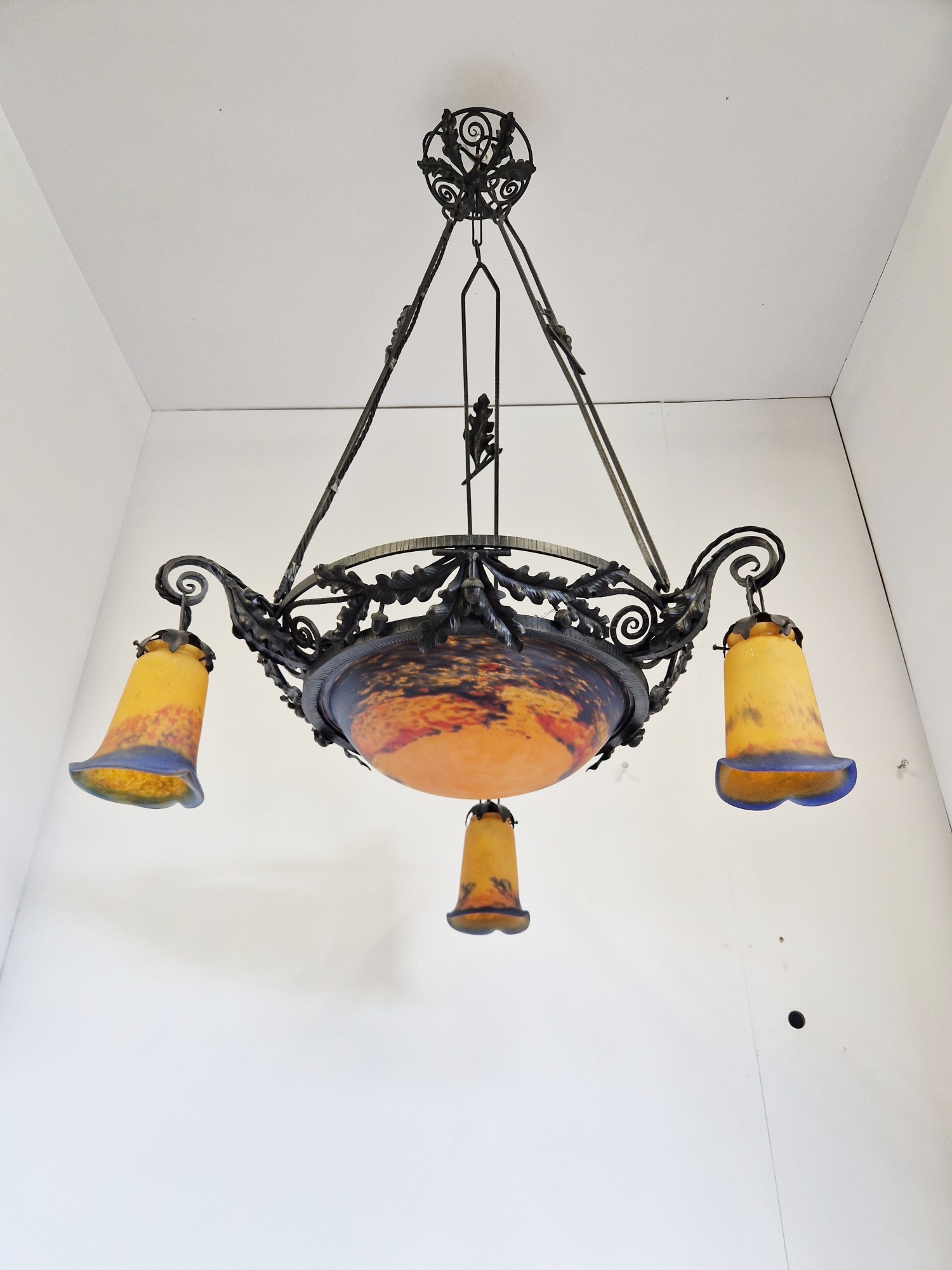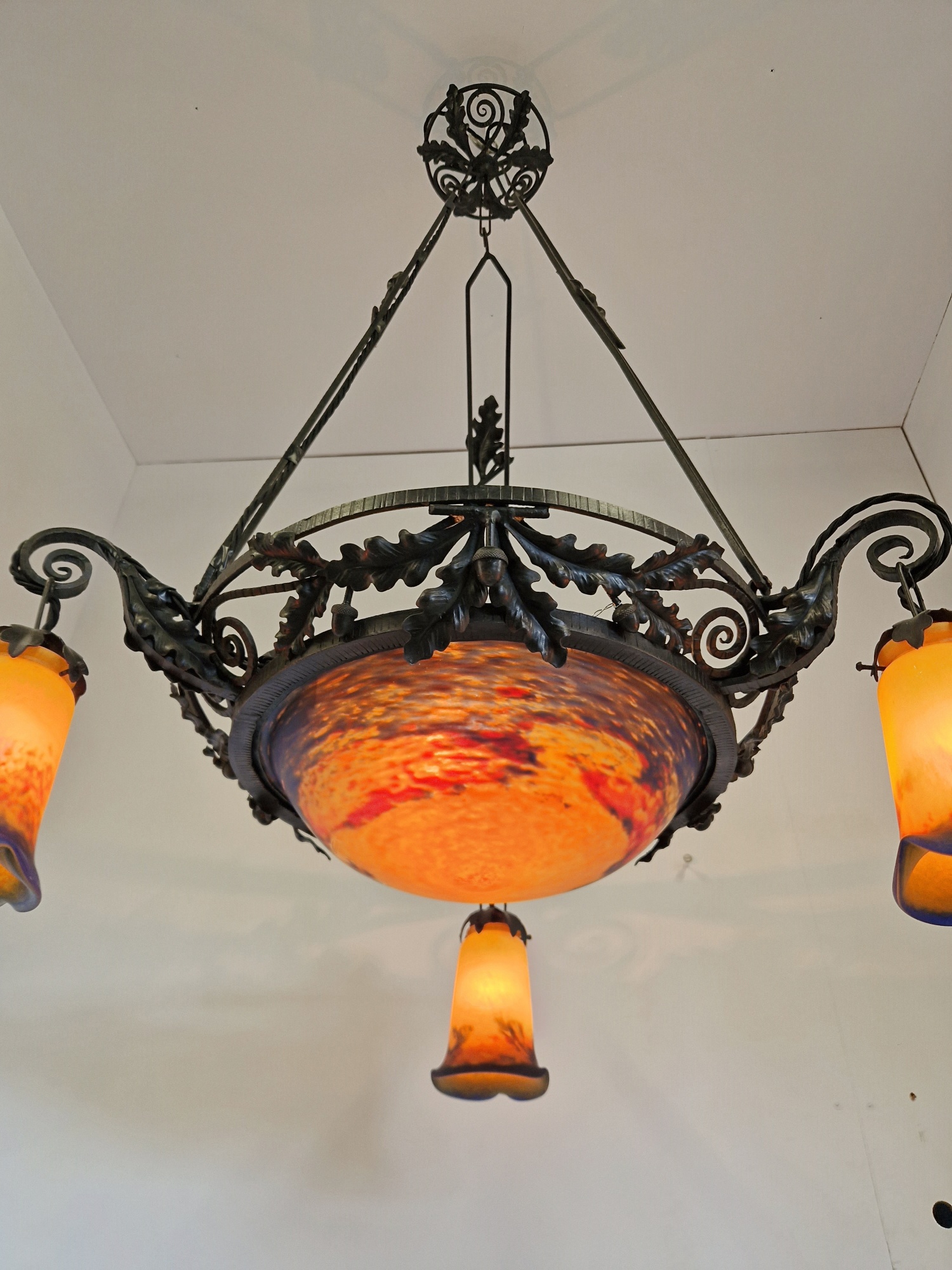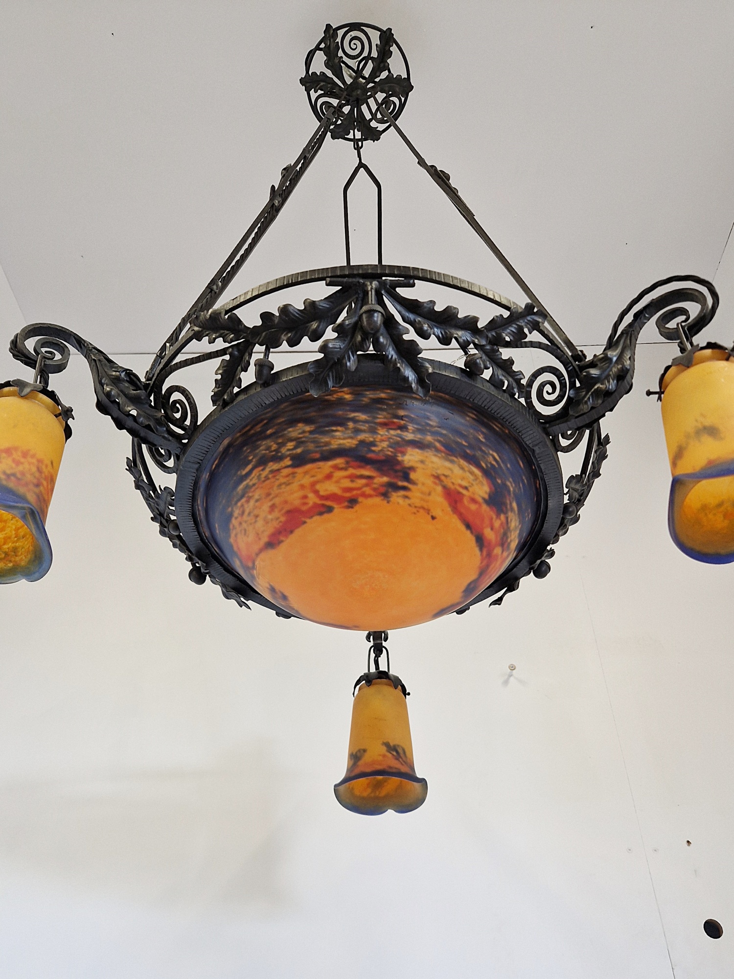 Product Code: LG699A Jean Noverdy wrought-iron chandelier designed with oak leaves & acorns. The pate-de-verre central plafonnier and 3 satellite lampshades in deep tones of orange and blue and all signed with acid-stencilled signature “Noverdy”. France, c.1920