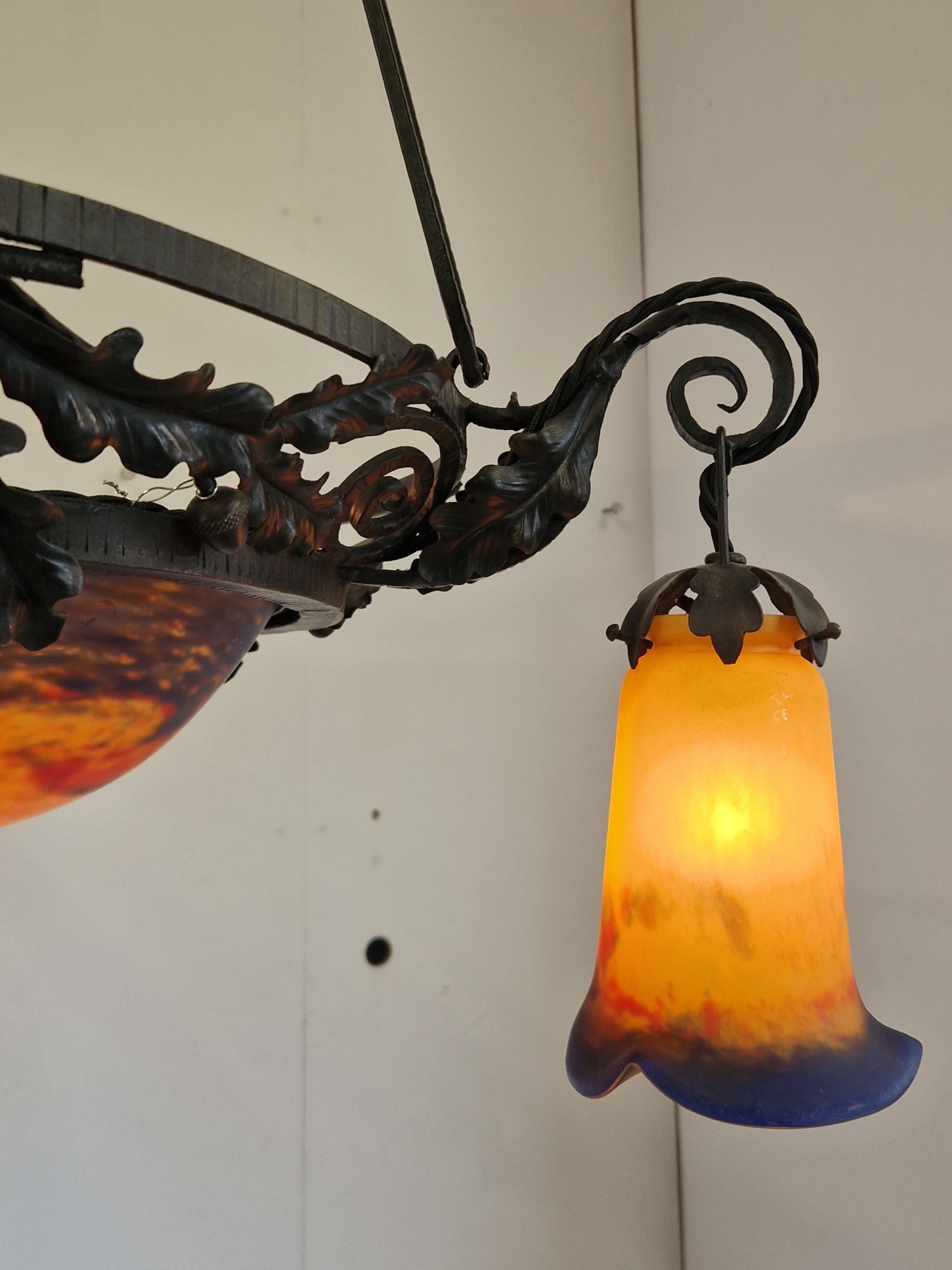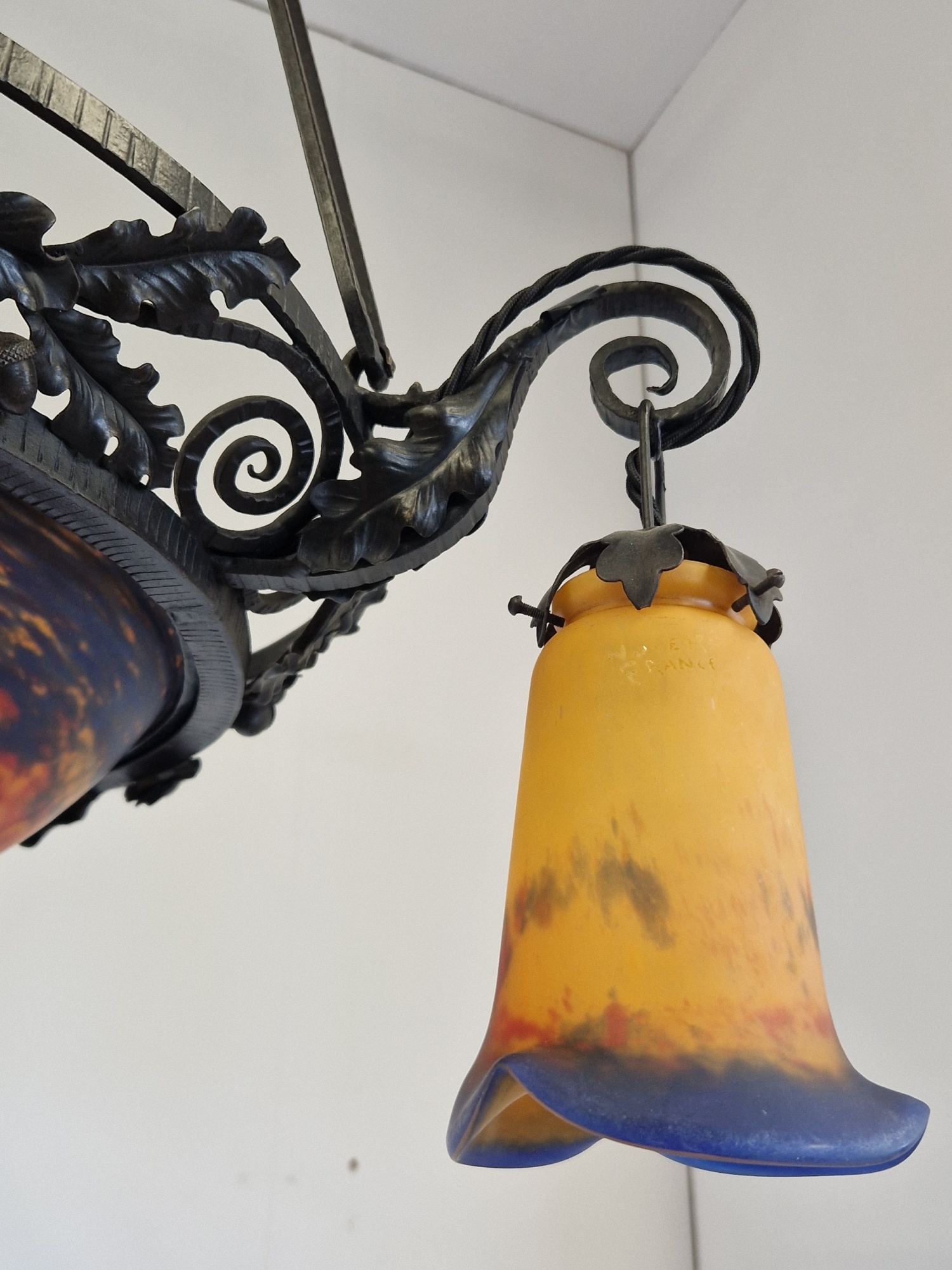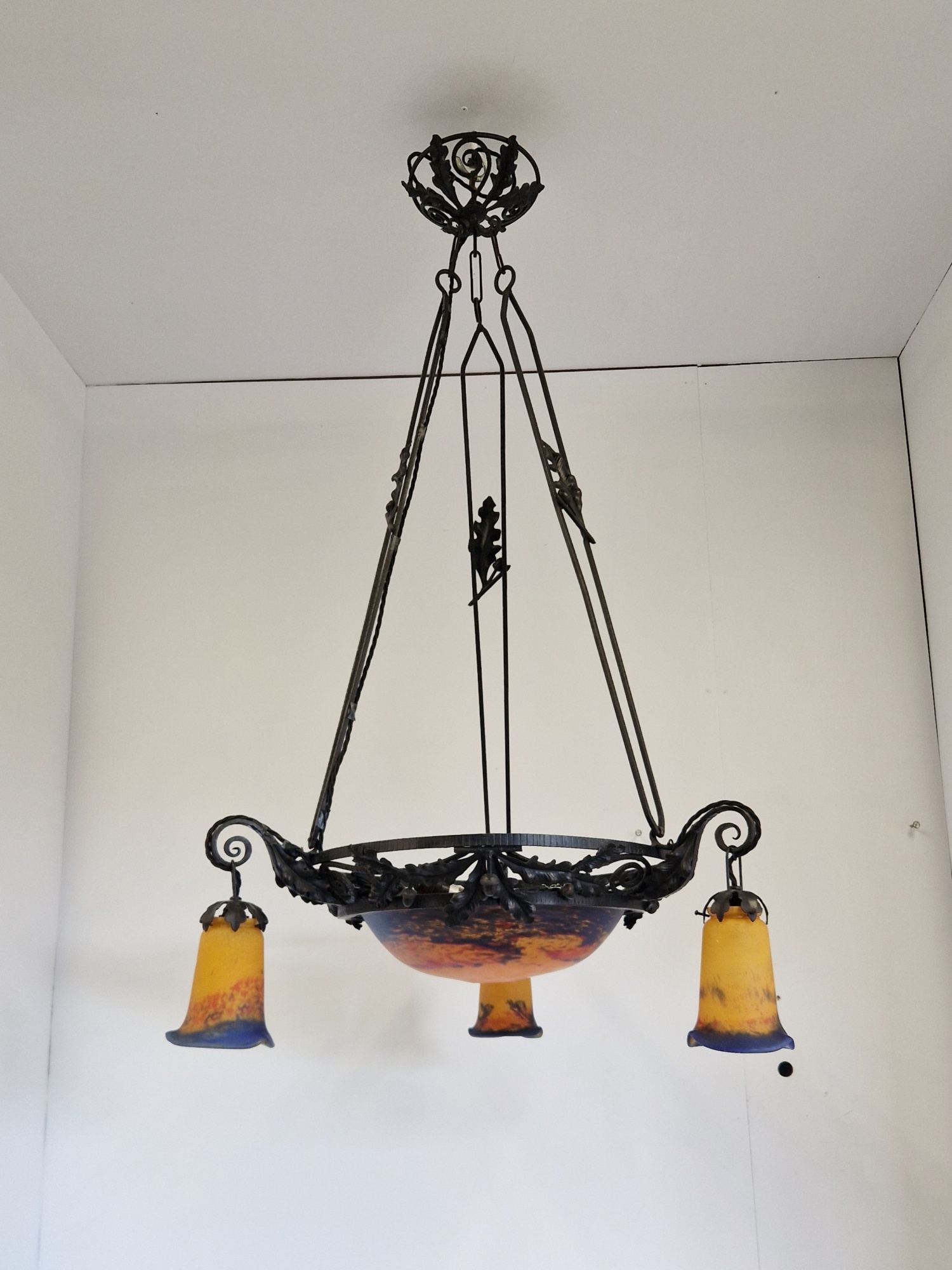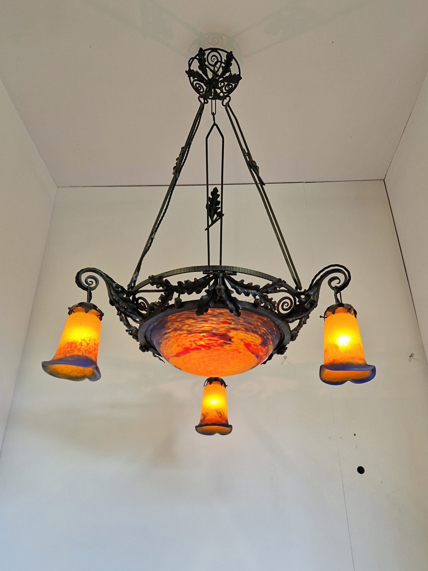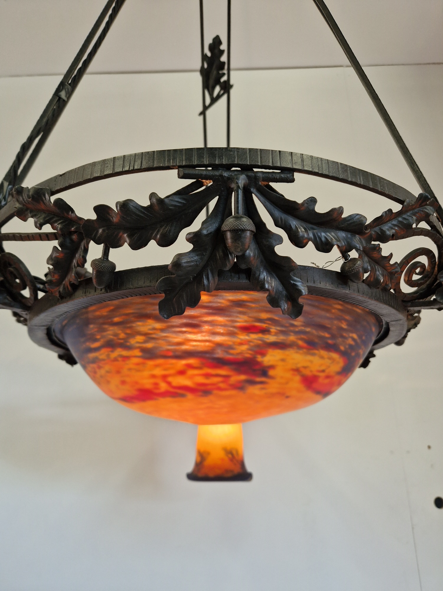 Product Code: LG699A Jean Noverdy wrought-iron chandelier designed with oak leaves & acorns. The pate-de-verre central plafonnier and 3 satellite lampshades in deep tones of orange and blue and all signed with acid-stencilled signature “Noverdy”. France, c.1920
