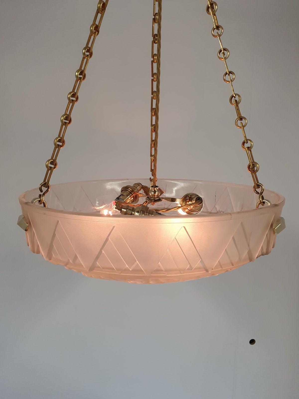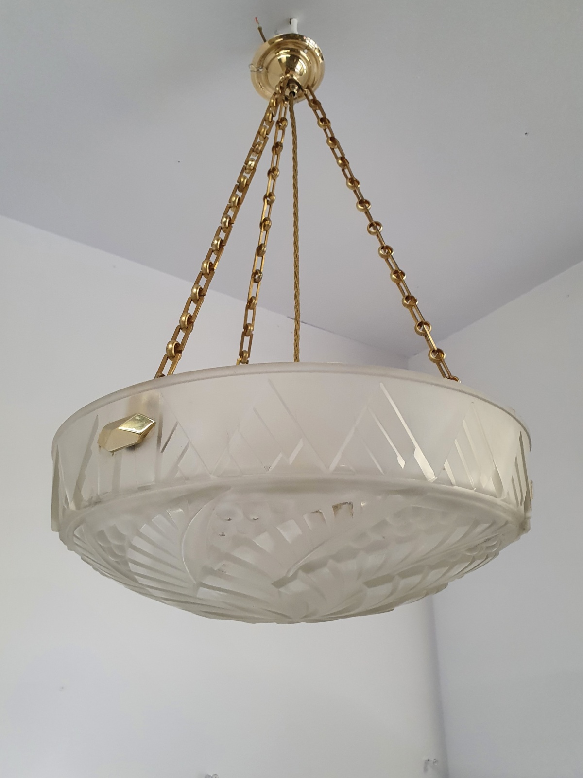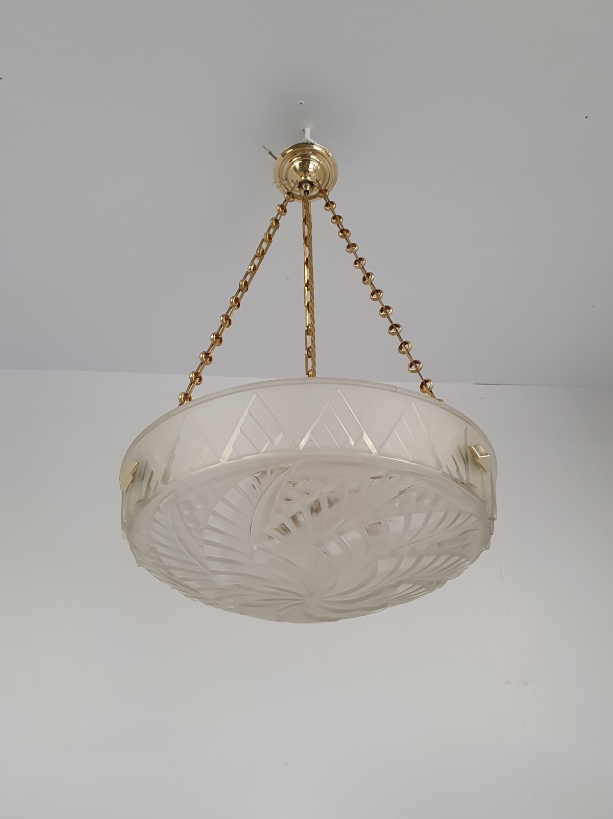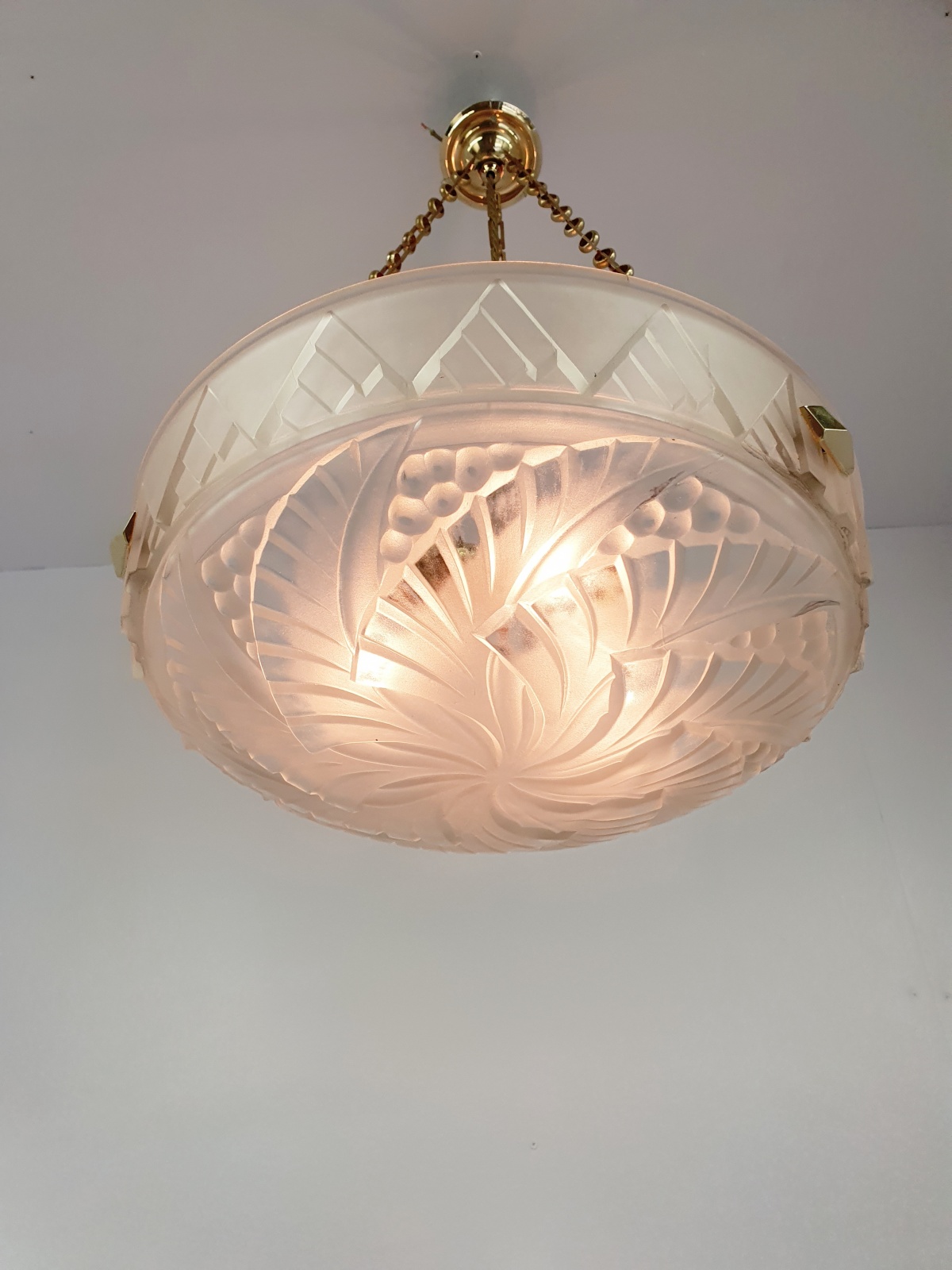 A good quality frosted-white art deco plafonnier signed in the glass Noverdy. The glass bowl moulded with an abstract pattern of berries and fronds and hangs pendant with original brass deco bowl-hooks and chain for suspension. France c.1925