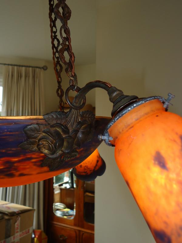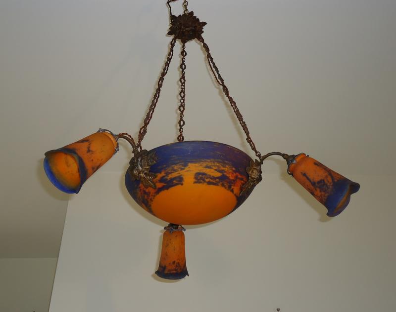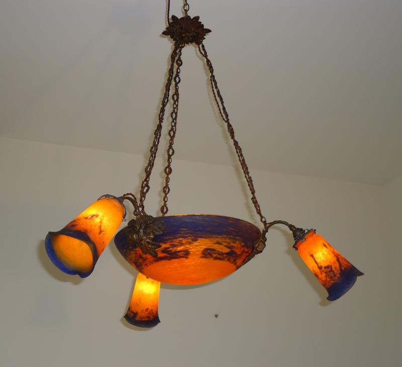 Product Code: LG298A Jean Noverdy bronzed-metal and coloured glass “pate-de-verre” three branch electrolier; one lampshade with acid-stencilled signature “Noverdy”. France, c.1900.