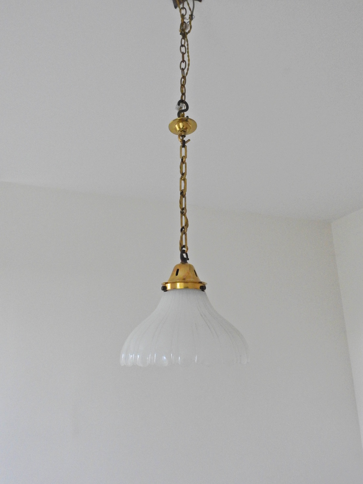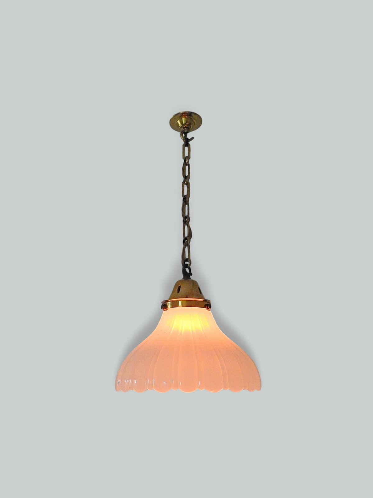Product Code: JAL1024A pair of large indentical size “moonstone” pendant lampshades, 1 signed by Jefferson & Co, Canada the other signed “British made”, both with matching original brass gallery and antique chain for suspension. c.1920-30