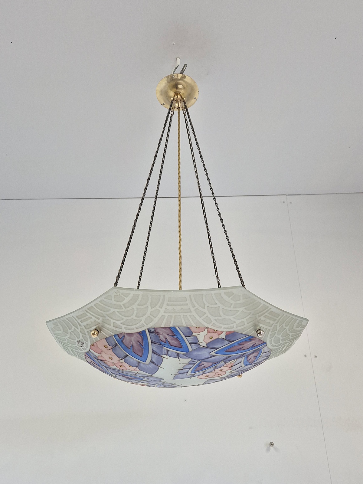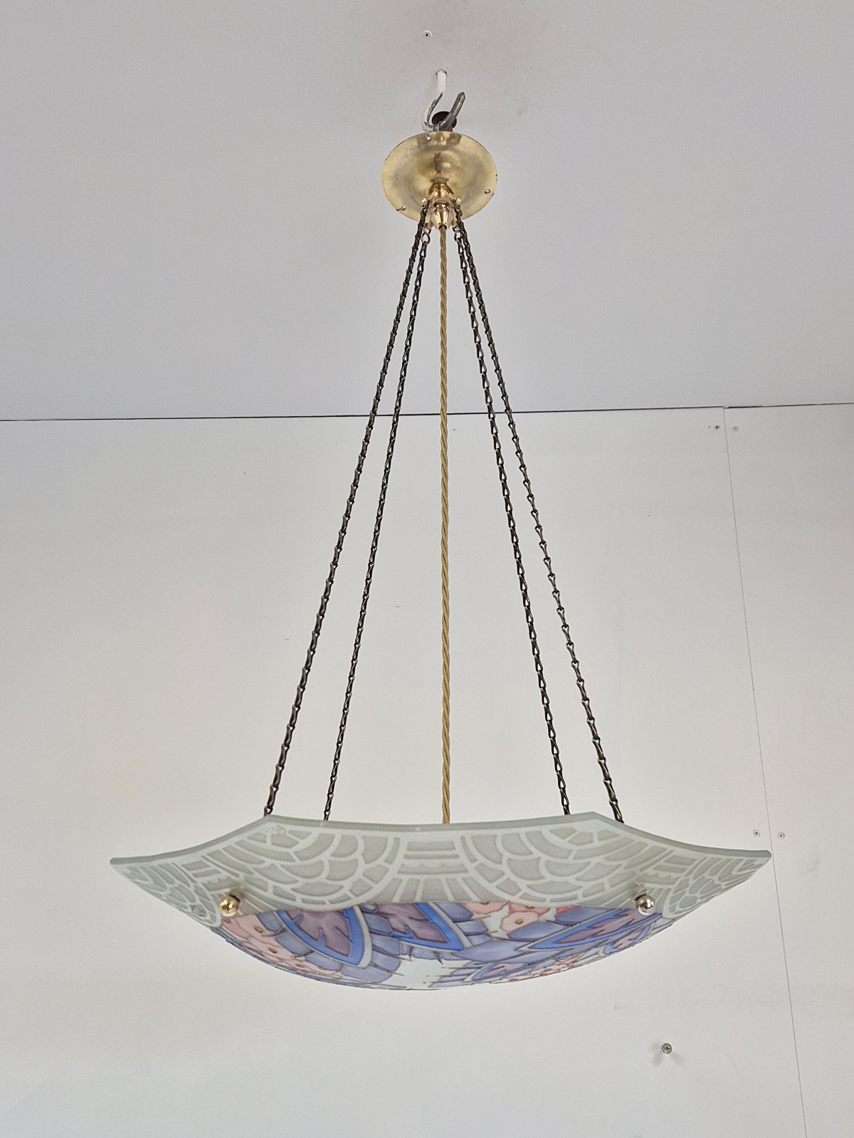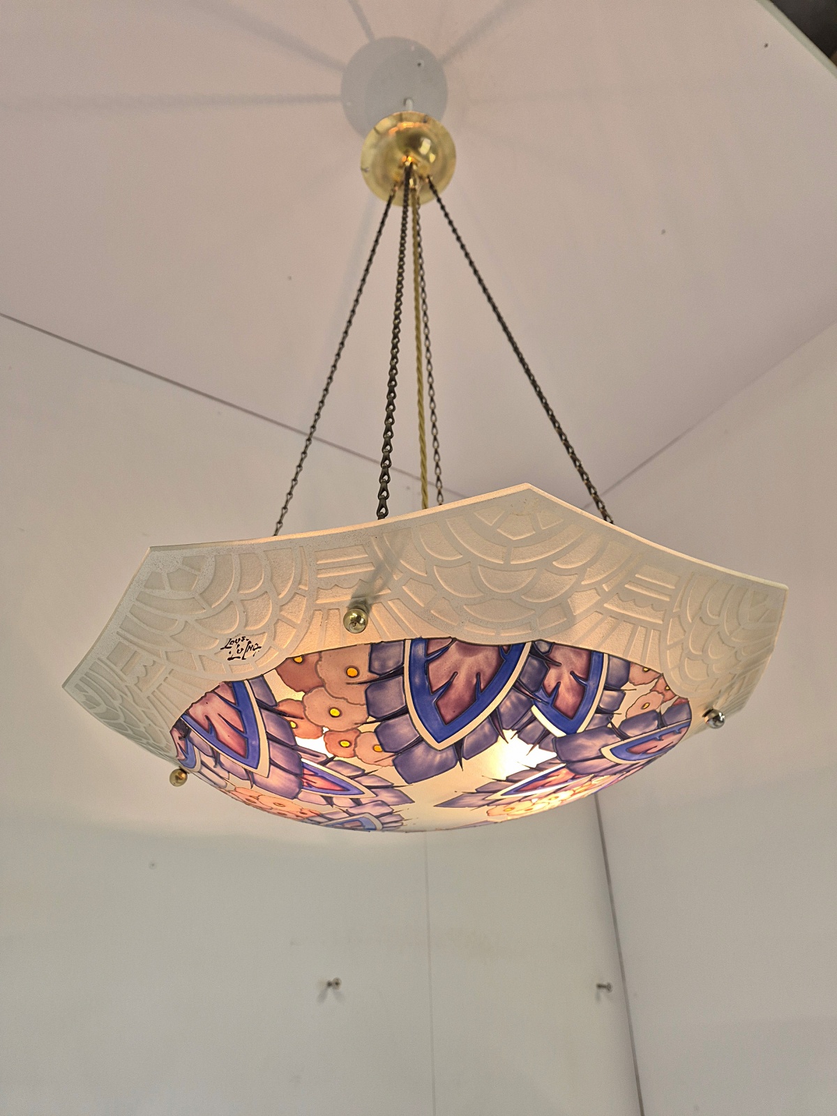 Product Code: LG782A very good and attractive polychrome-enamelled plafonnier suspended with delicate chains and replacement 4-way ceiling hook. Designed with stylised ferns and flowers. Enamelled maker’s mark “Loys Lucha”. France c.1930