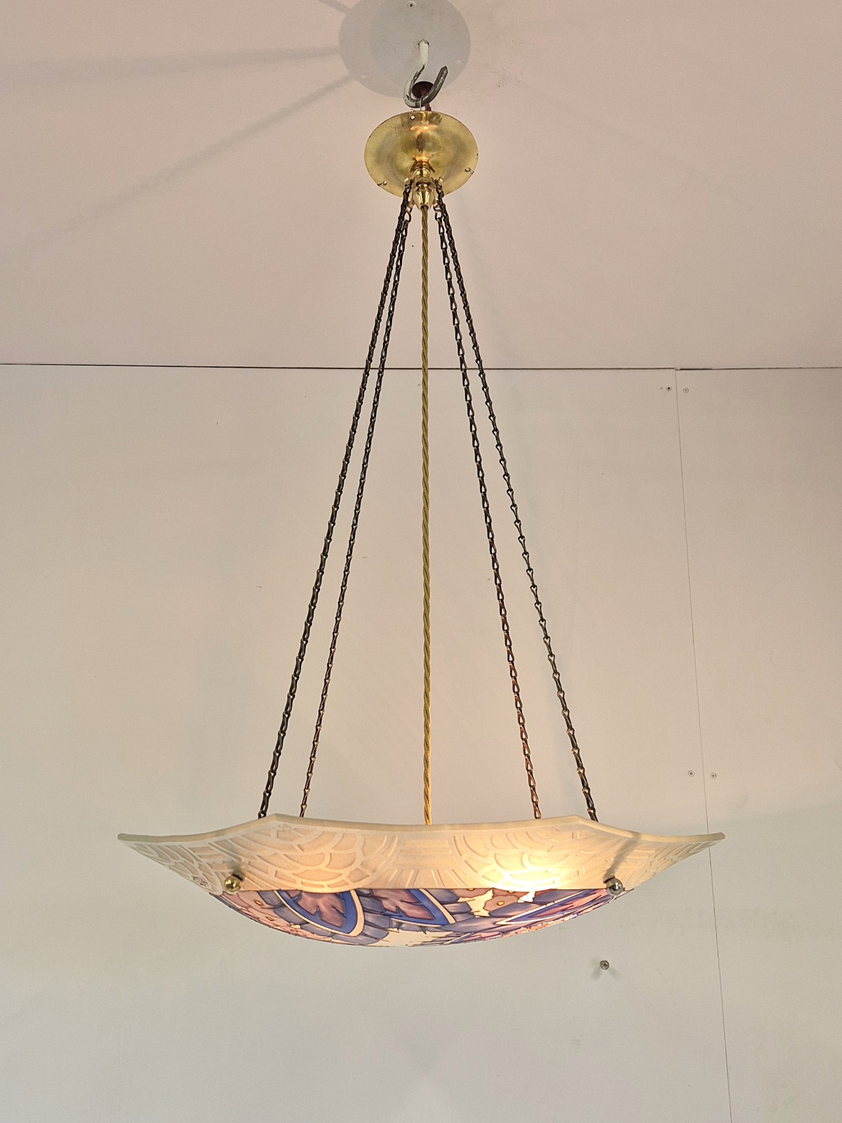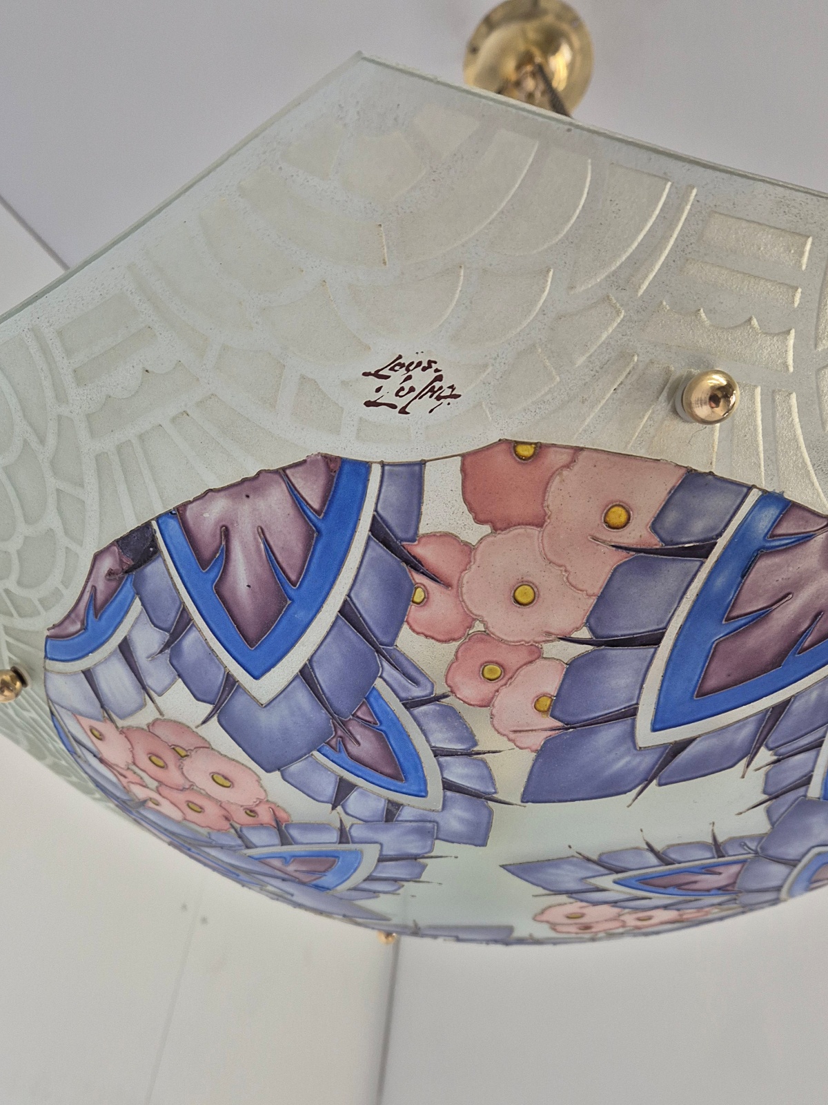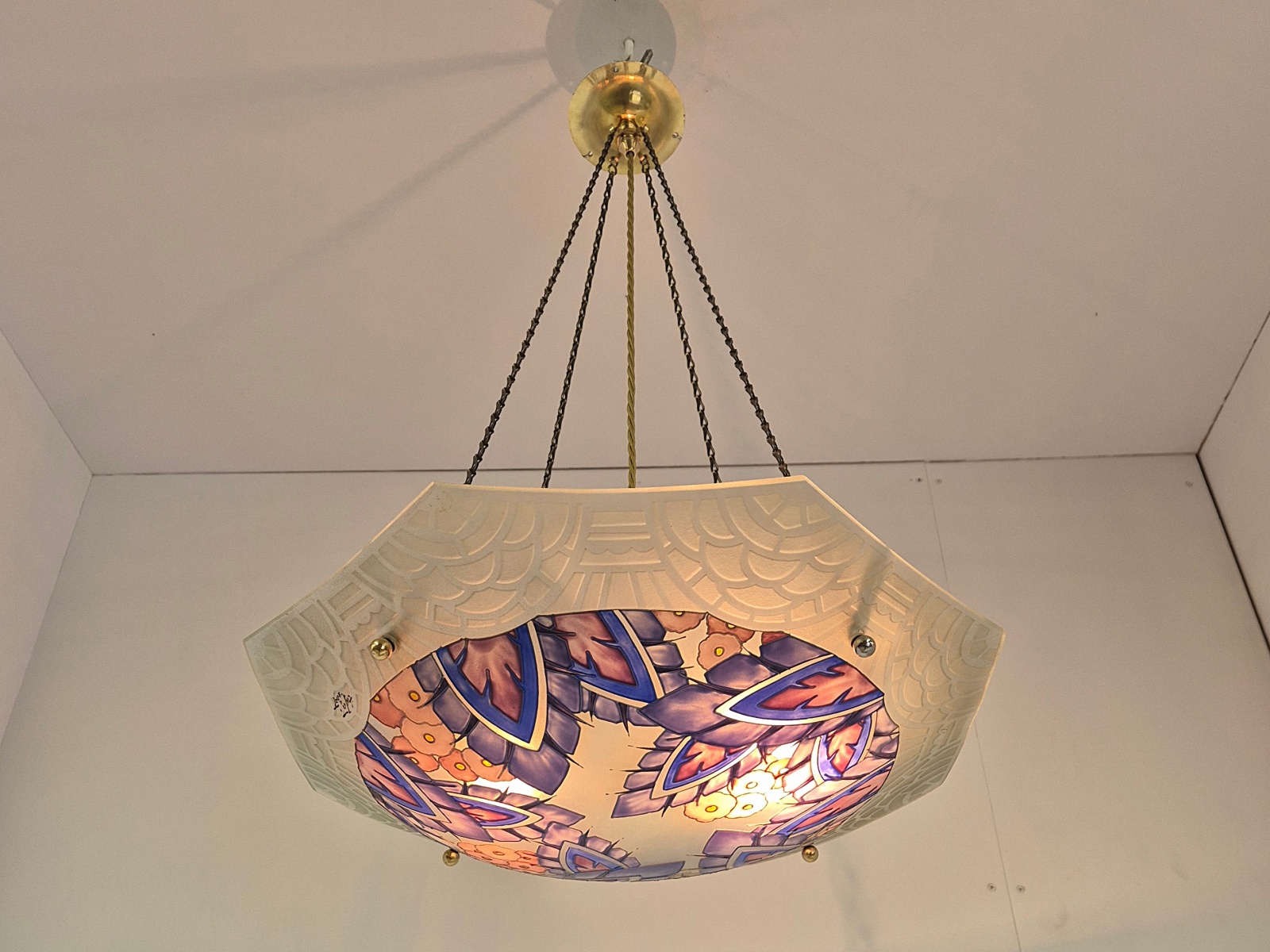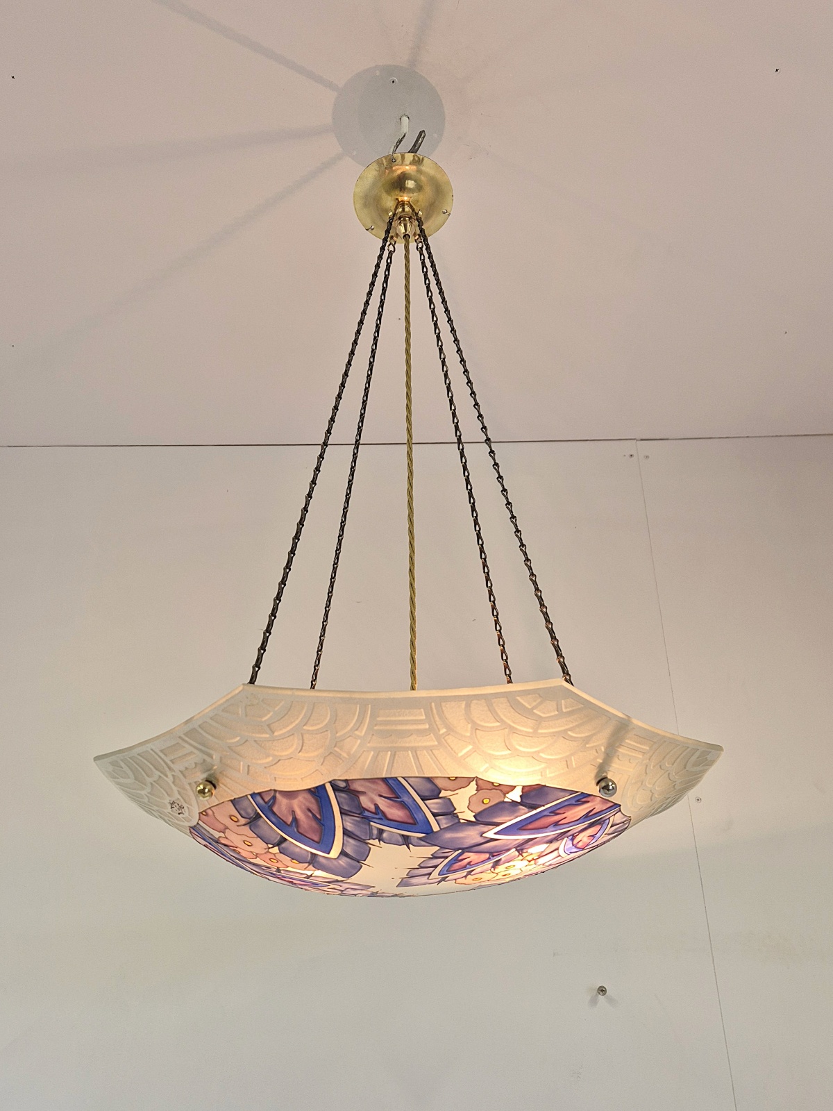 Product Code: LG782A very good and attractive polychrome-enamelled plafonnier suspended with delicate chains and replacement 4-way ceiling hook. Designed with stylised ferns and flowers. Enamelled maker’s mark “Loys Lucha”. France c.1930