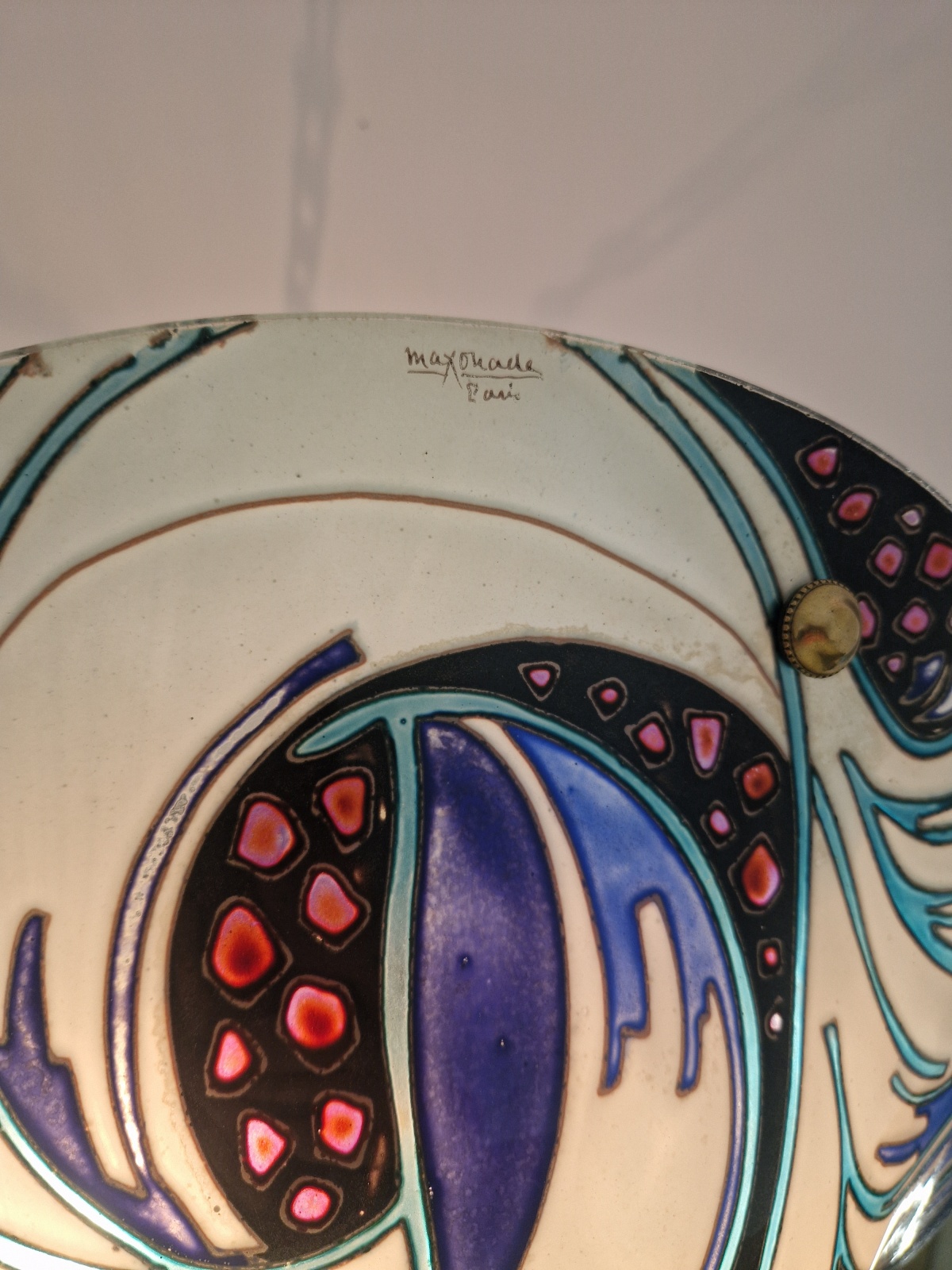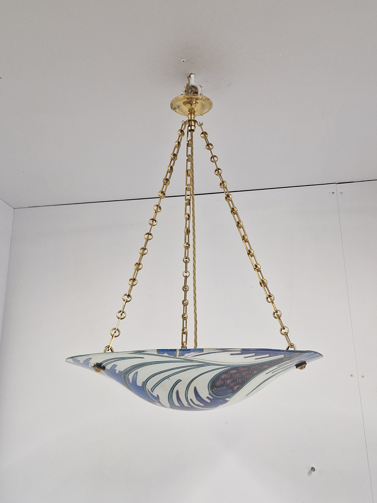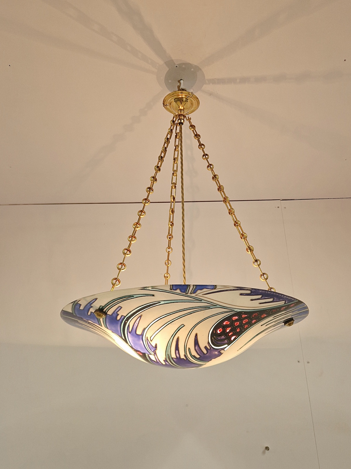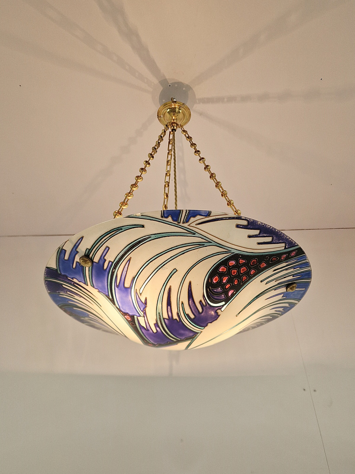 A fabulous and rare Maxonade art deco plafonnier, tube-lined and enamelled in an abstract wave design in white,blue,turquoise,black and red. With brass chain and fitments for suspension. France c.1930