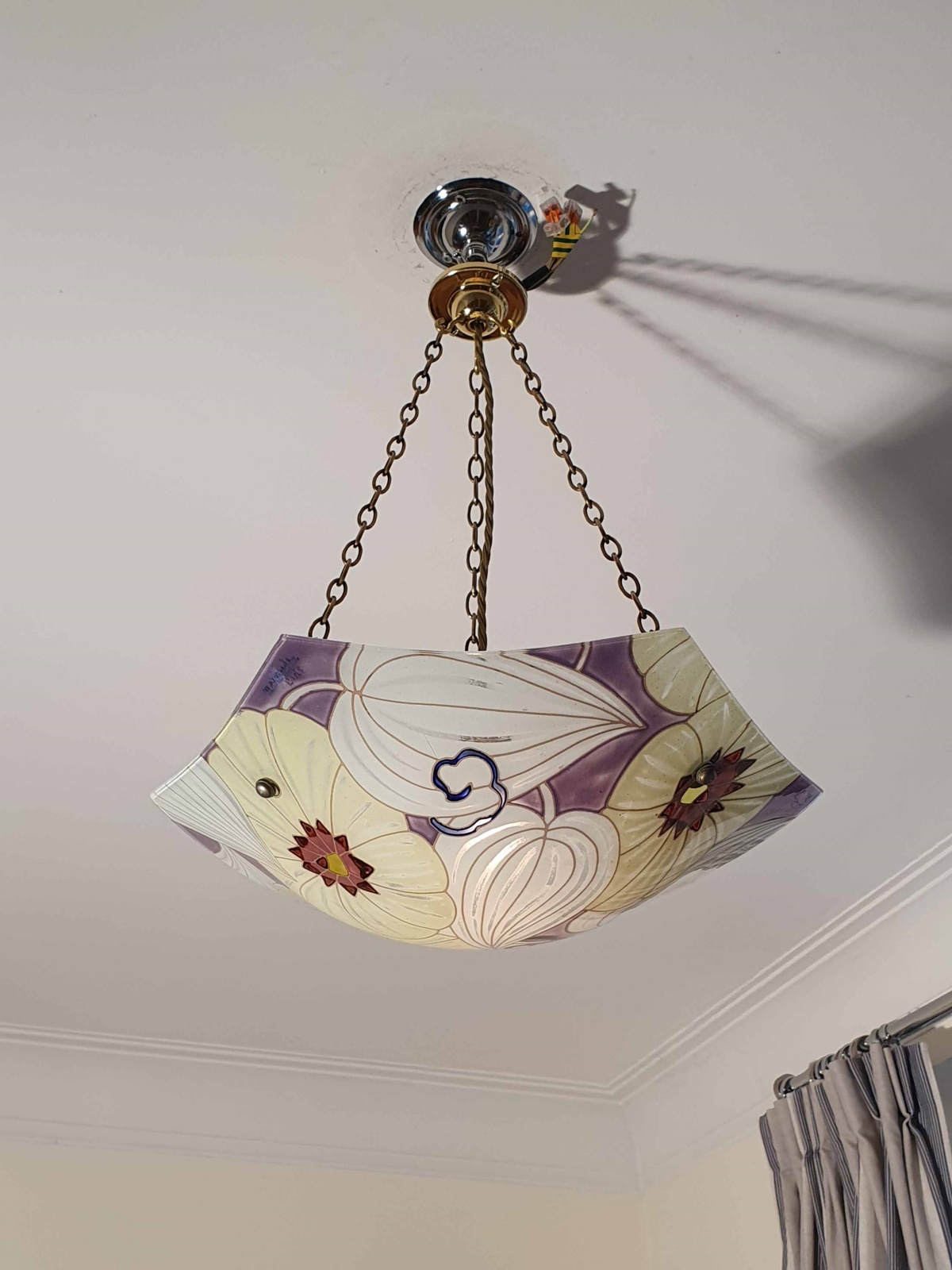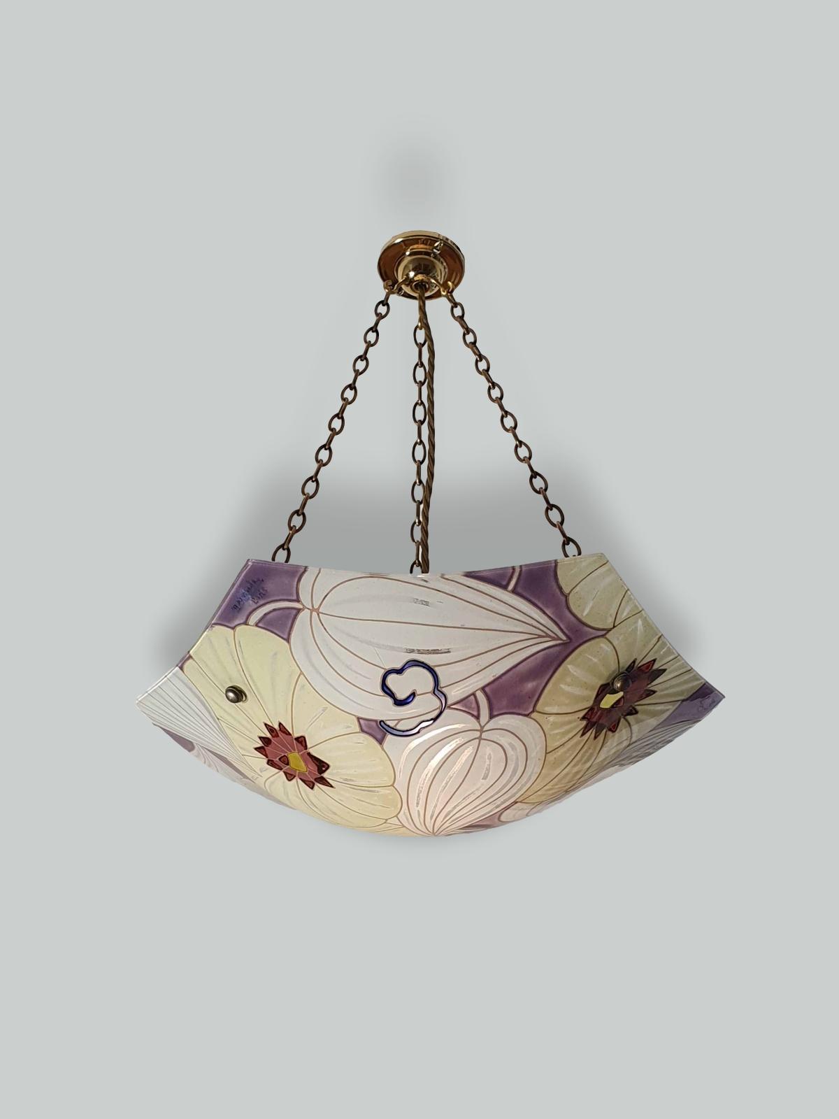 Product Code: LG532A stylish and delicate art deco plafonnier by Maxonade Verrier D’Art, Paris. The design of summer flowers and seed pods with leaves in soft tones of yellow and violet. Displayed with replacement brass fitments for suspension. Signed Maxonade France c.1935