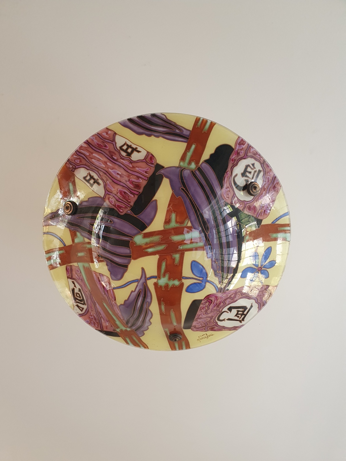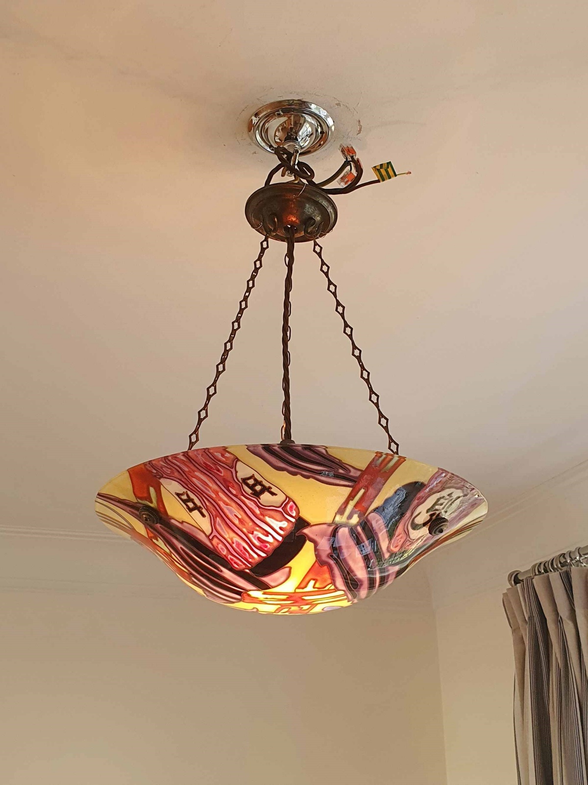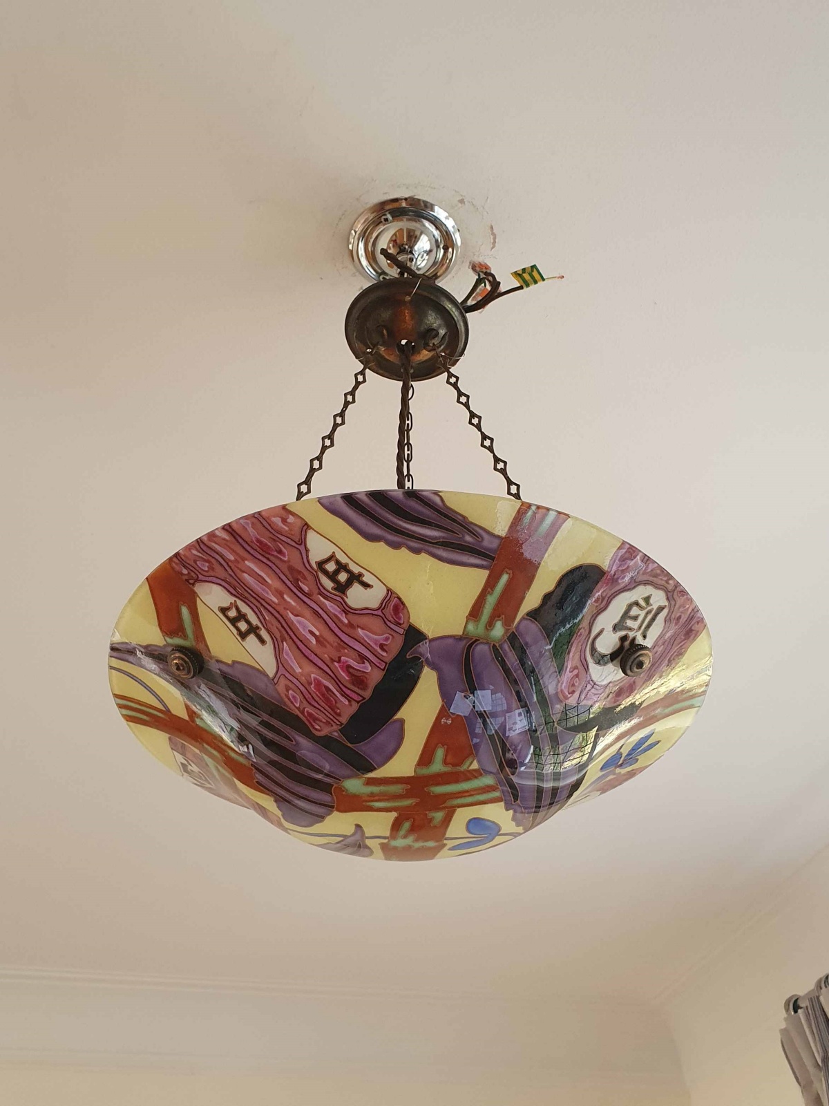 Product Code: GJ44A rare polychrome-enamelled glass plafonnier. Tube-lined with a design of oriental lanterns and supplied with period chains and ceiling hook for suspension. Signed “Maxonade, paris” France c.1935