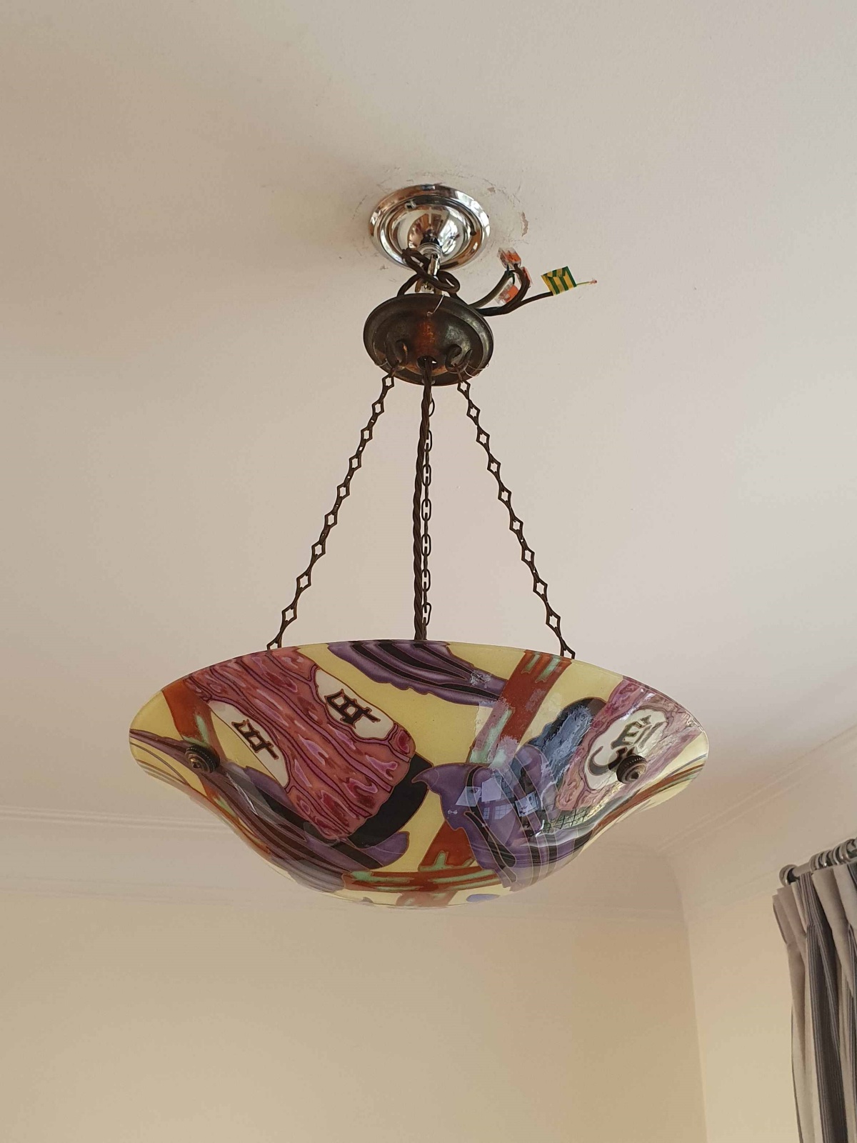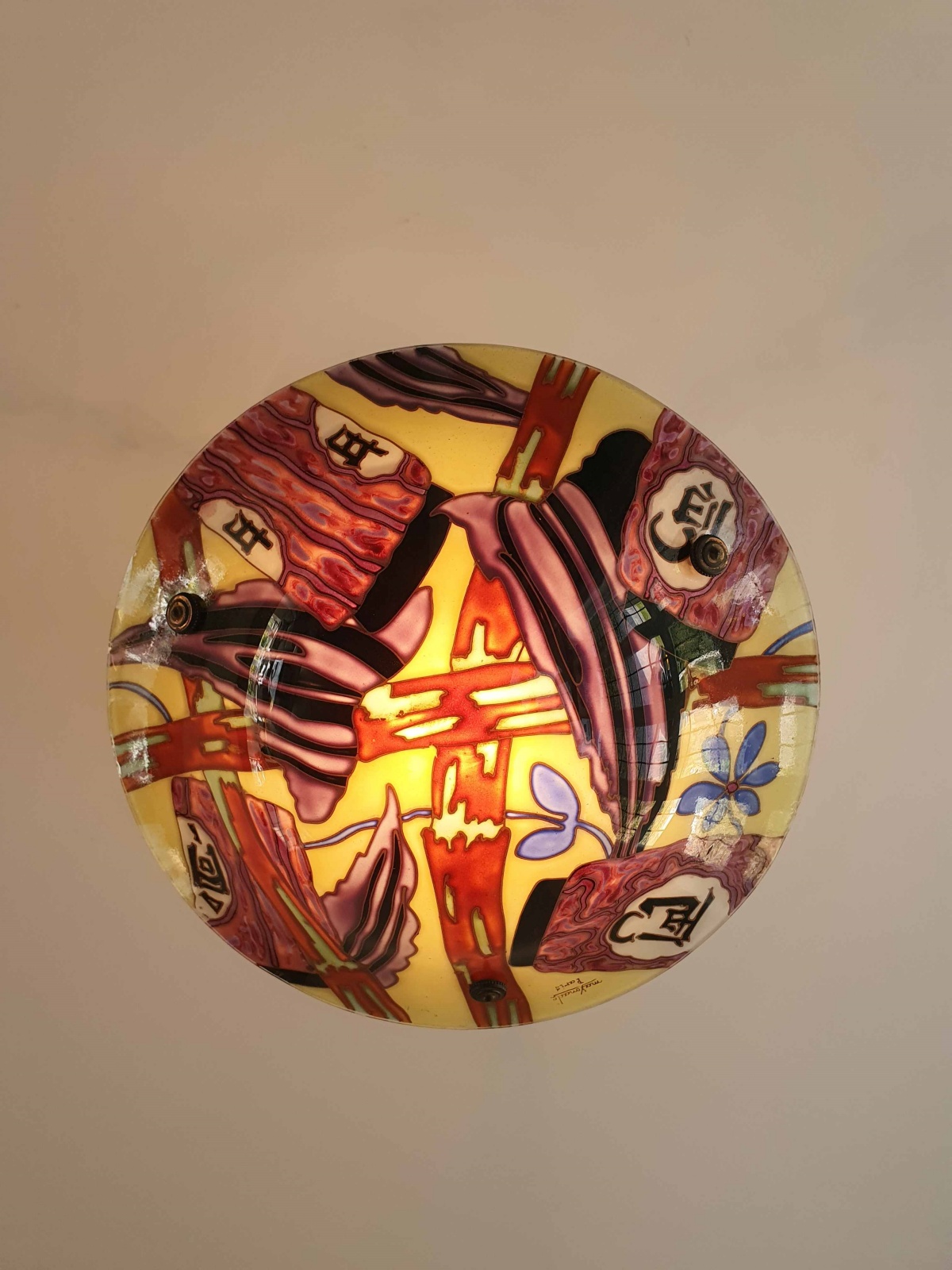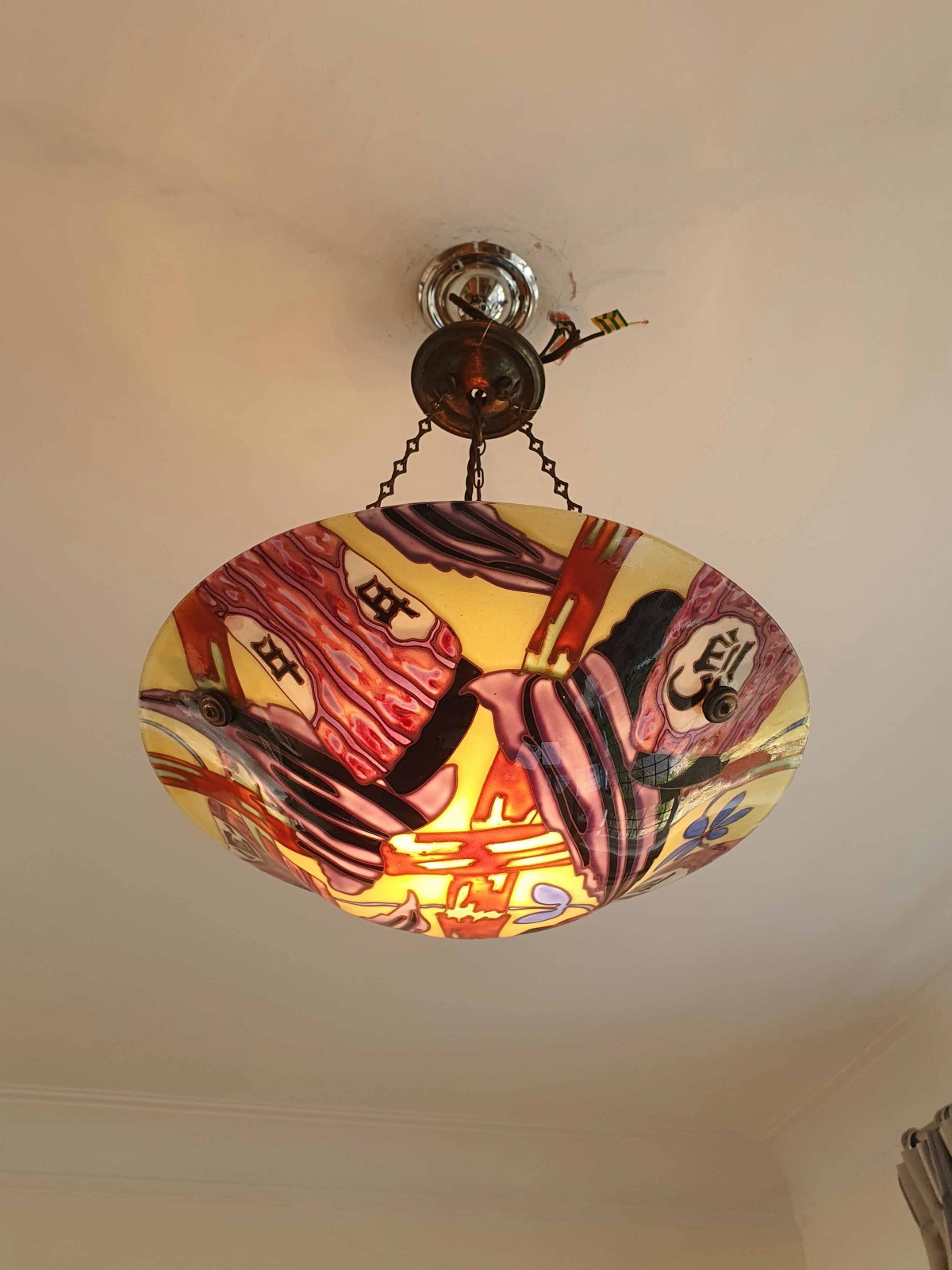 Product Code: GJ44A rare polychrome-enamelled glass plafonnier. Tube-lined with a design of oriental lanterns and supplied with period chains and ceiling hook for suspension. Signed “Maxonade, paris” France c.1935