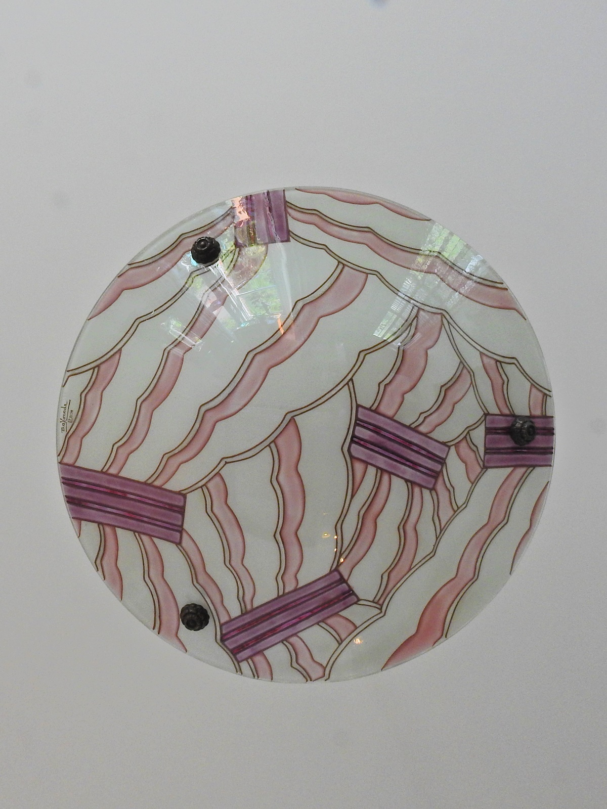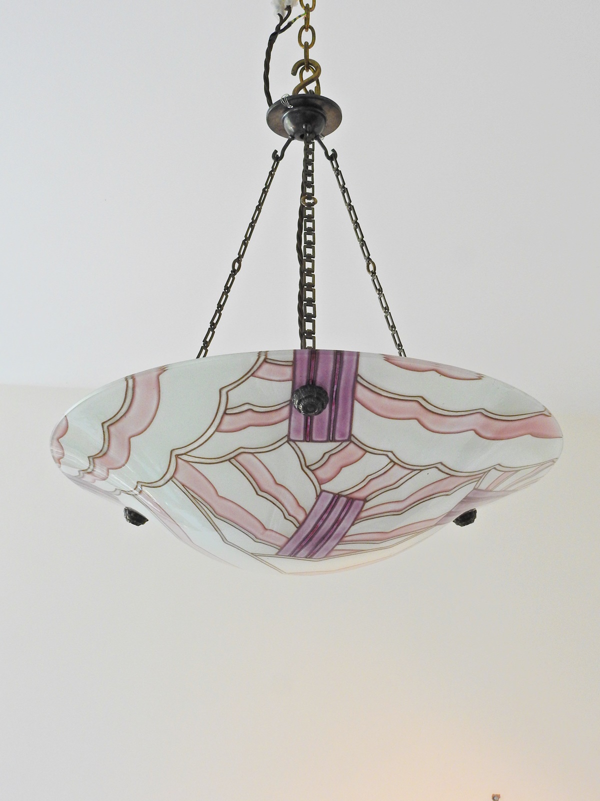 Product Code: LG411A Maxonade art deco plafonnier, tube-lined and enamelled in white and pink with abstract geometric design. With period bronzed chain and finials for suspension. France c9135