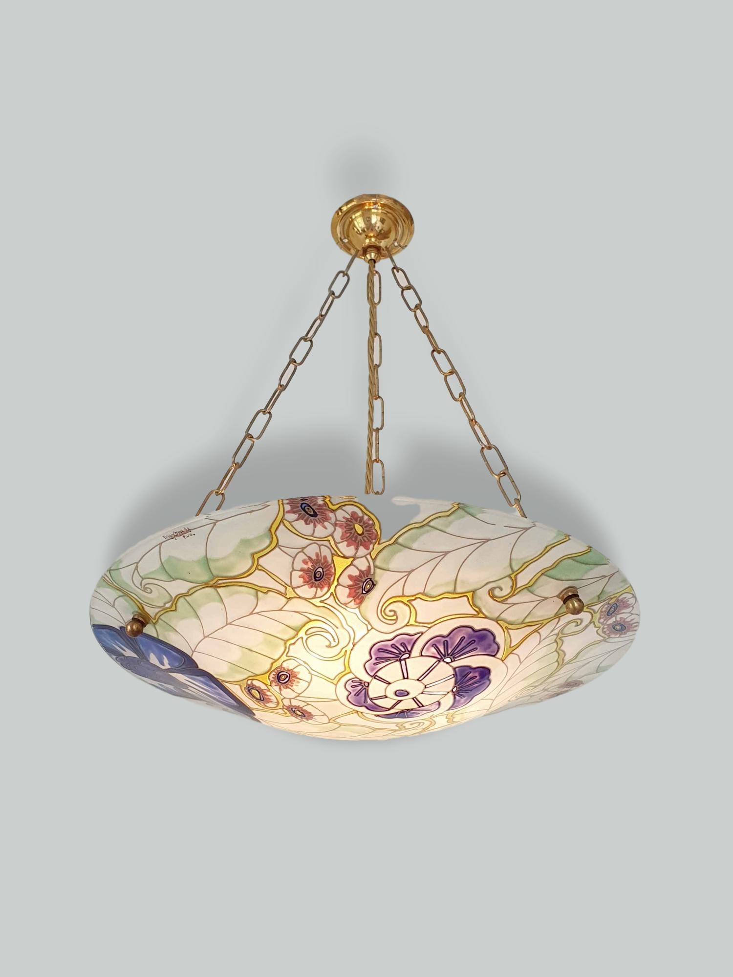 Product Code: LG512A large Art Deco polychrome-enamelled plafonnier designed with fronds and stylised flower-heads. Signed in the glass Maxonade, Paris. France c.1935