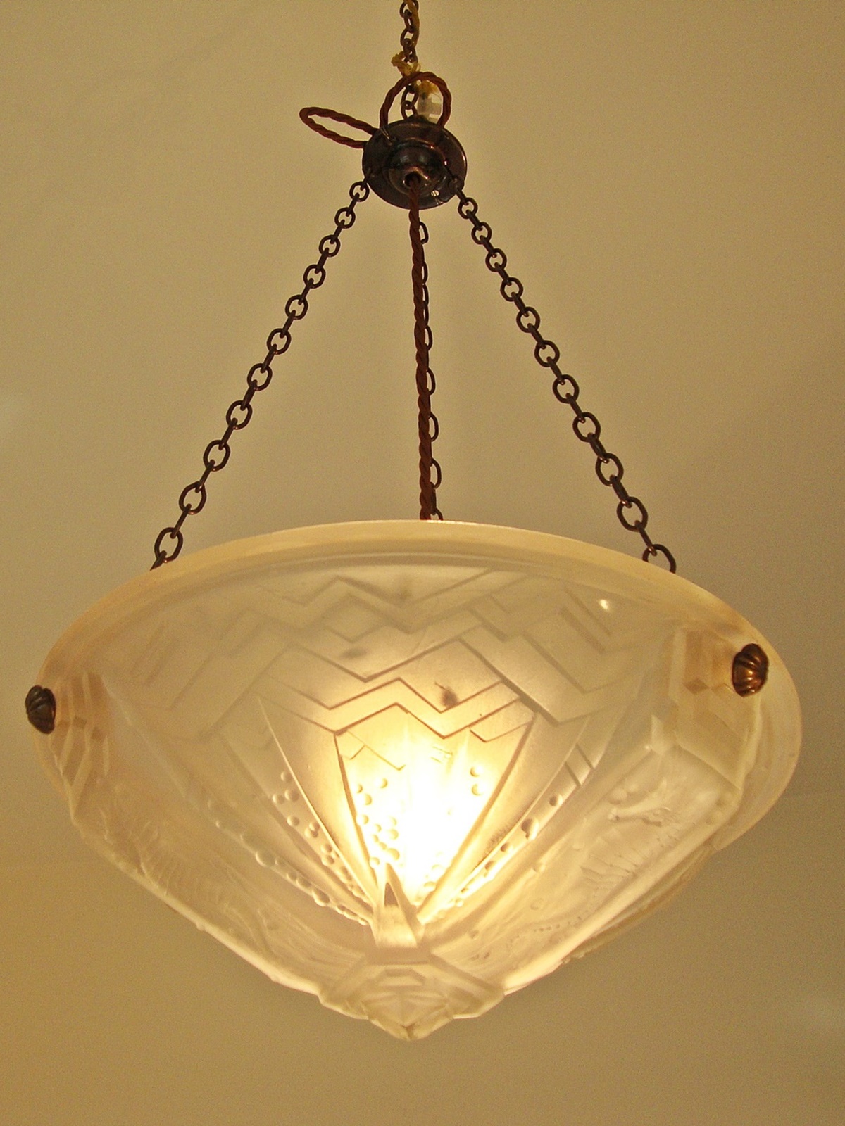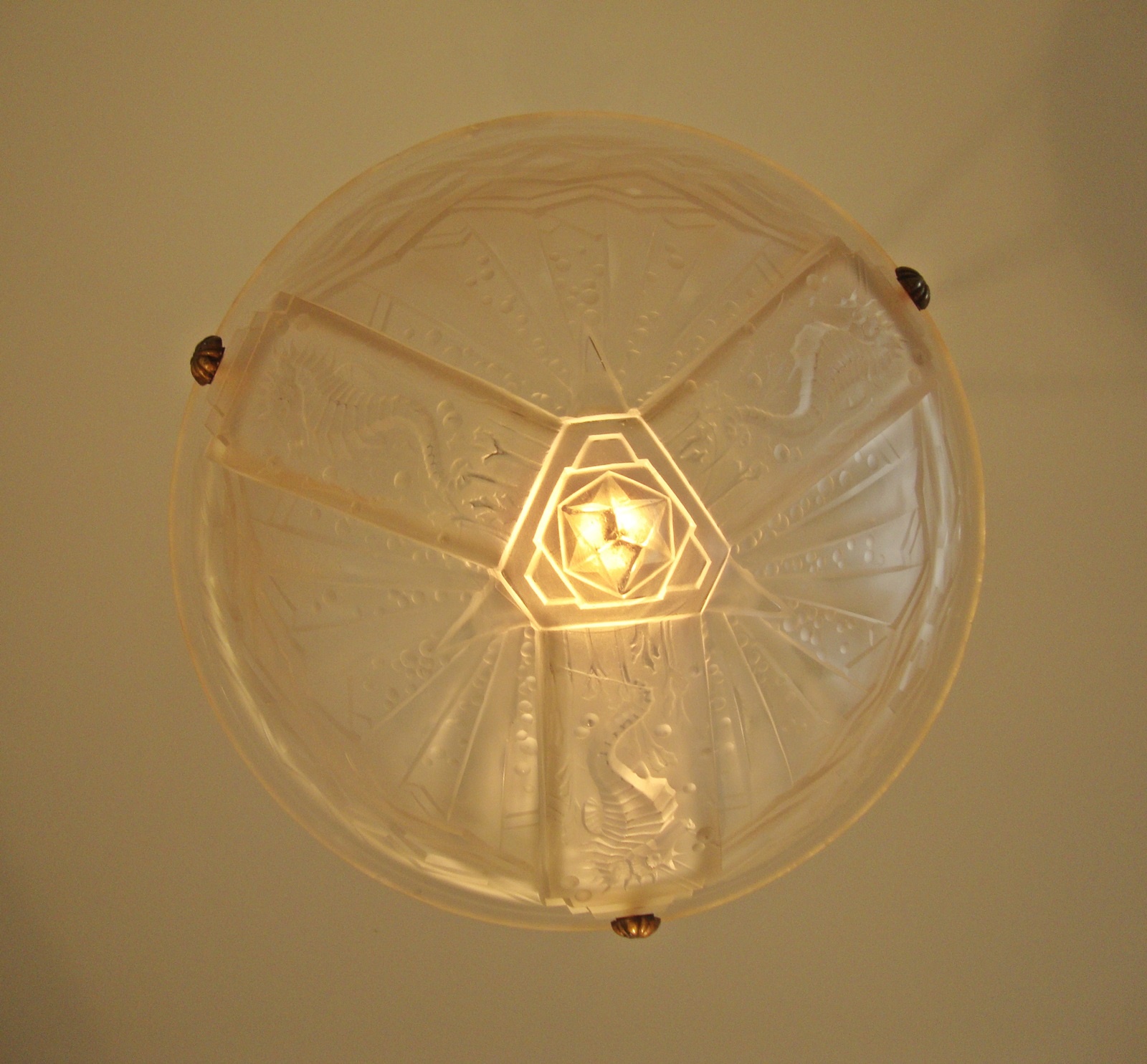 Product Code: LG319A frosted and polished glass art deco plafonnier of geometric design including a frieze of sea horses and bubbles. Signed in the glass “Muller Fres, Luneville”; with original finials and replacement fitments for suspension. France, c.1930.