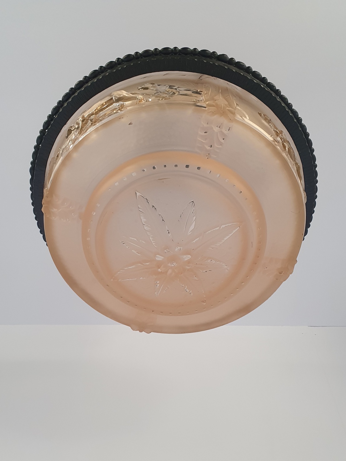 Product Code: LG659A rare and very good quality peach art deco plafonnier by Muller Frères in the “Les Panthères” design. The heavily moulded coupe set into the original designed hand-crafted wrought-iron fitment attributed to Marcel Vasseur; moulded maker’s mark in the glass “Muller Freres, Luneville”. France c.1930