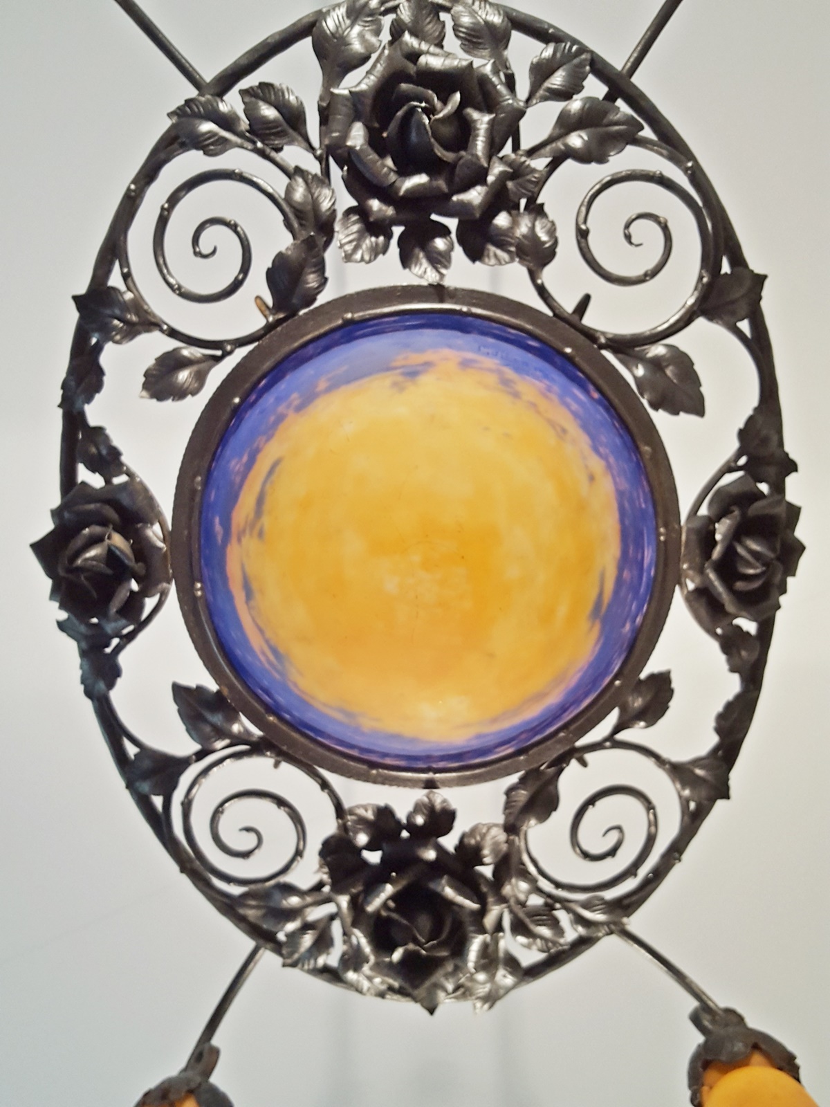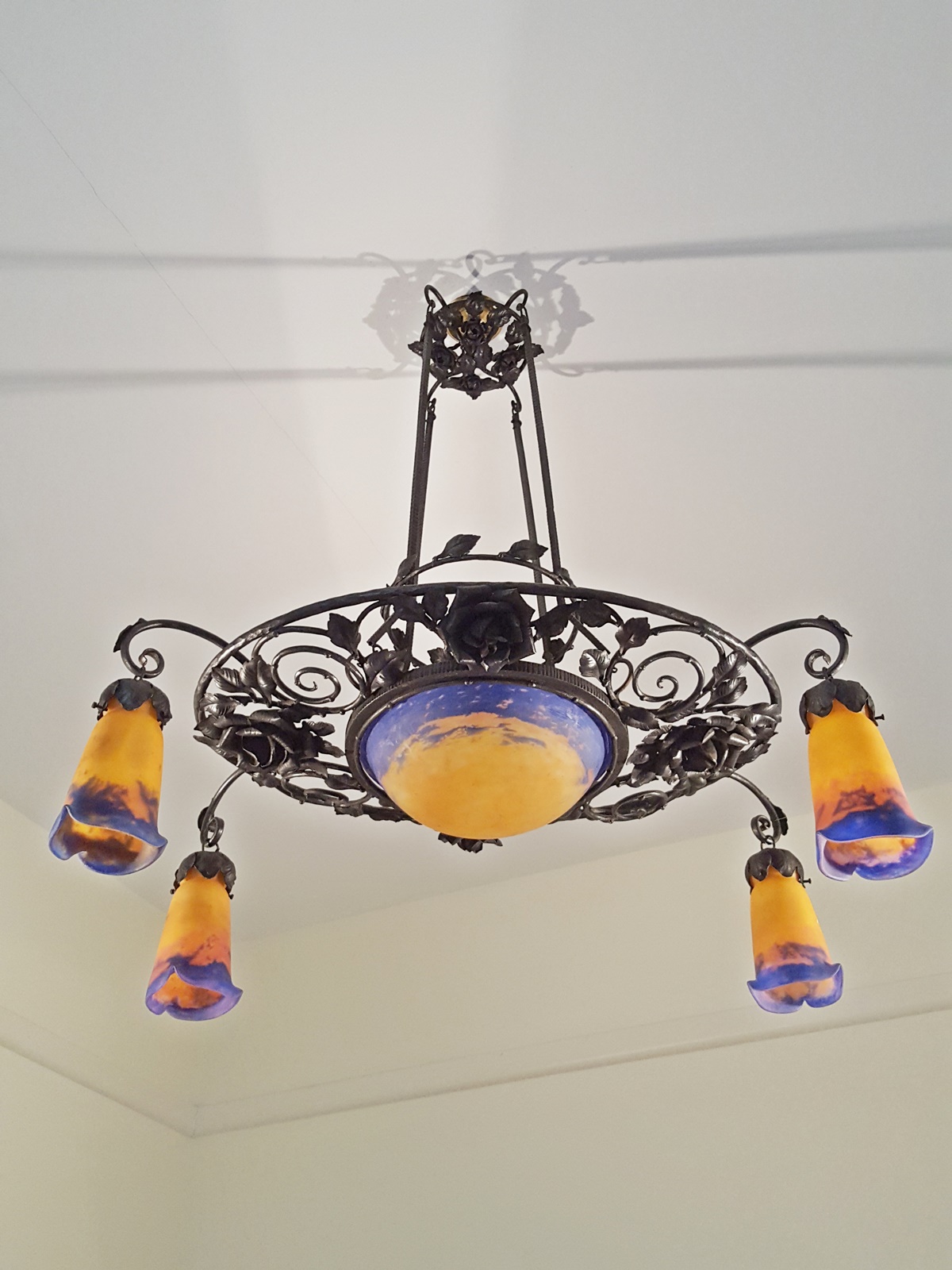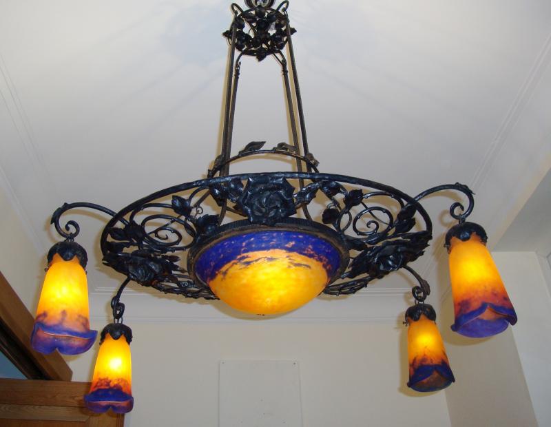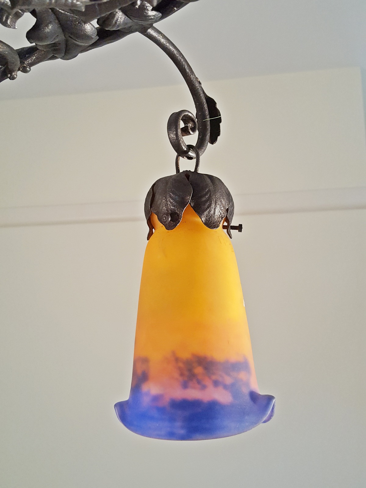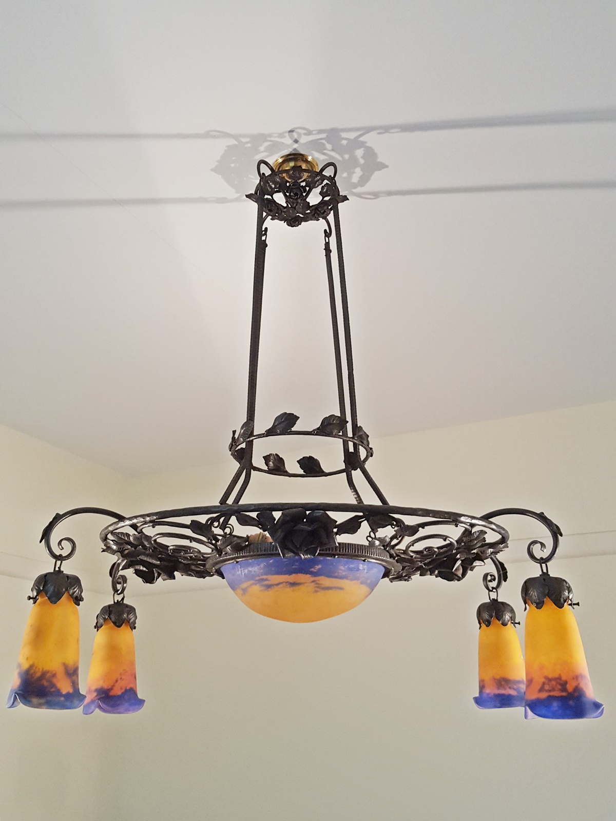 Product Code: JAL0105A good and impressive wrought iron four-arm chandelier, the metalwork designed with rose leaves and flowers with an orange and blue “pate-de-verre” central plafonnier and four matching satellite shades all signed with acid-stencilled mark “Muller Fres, Luneville” France c1925