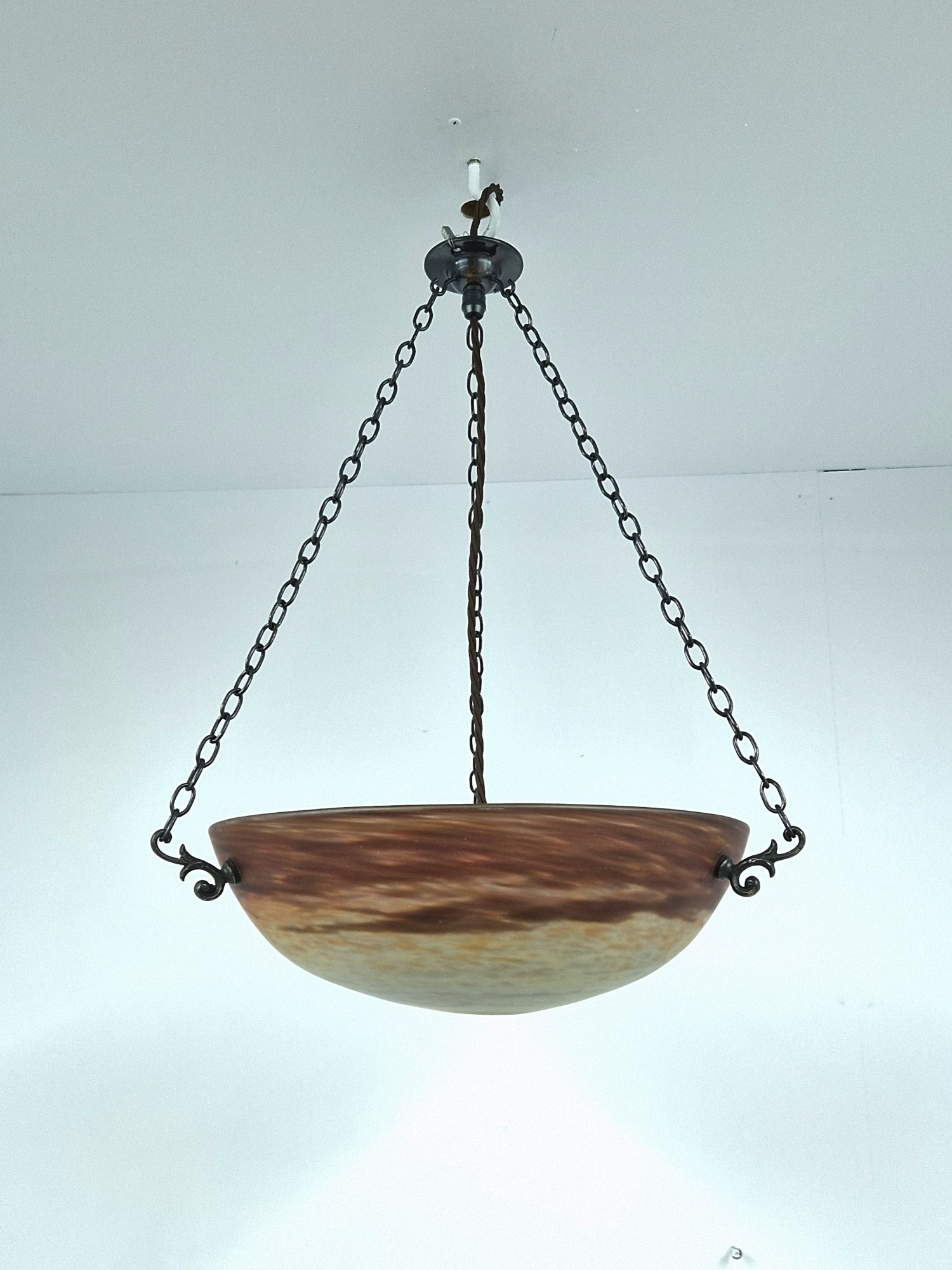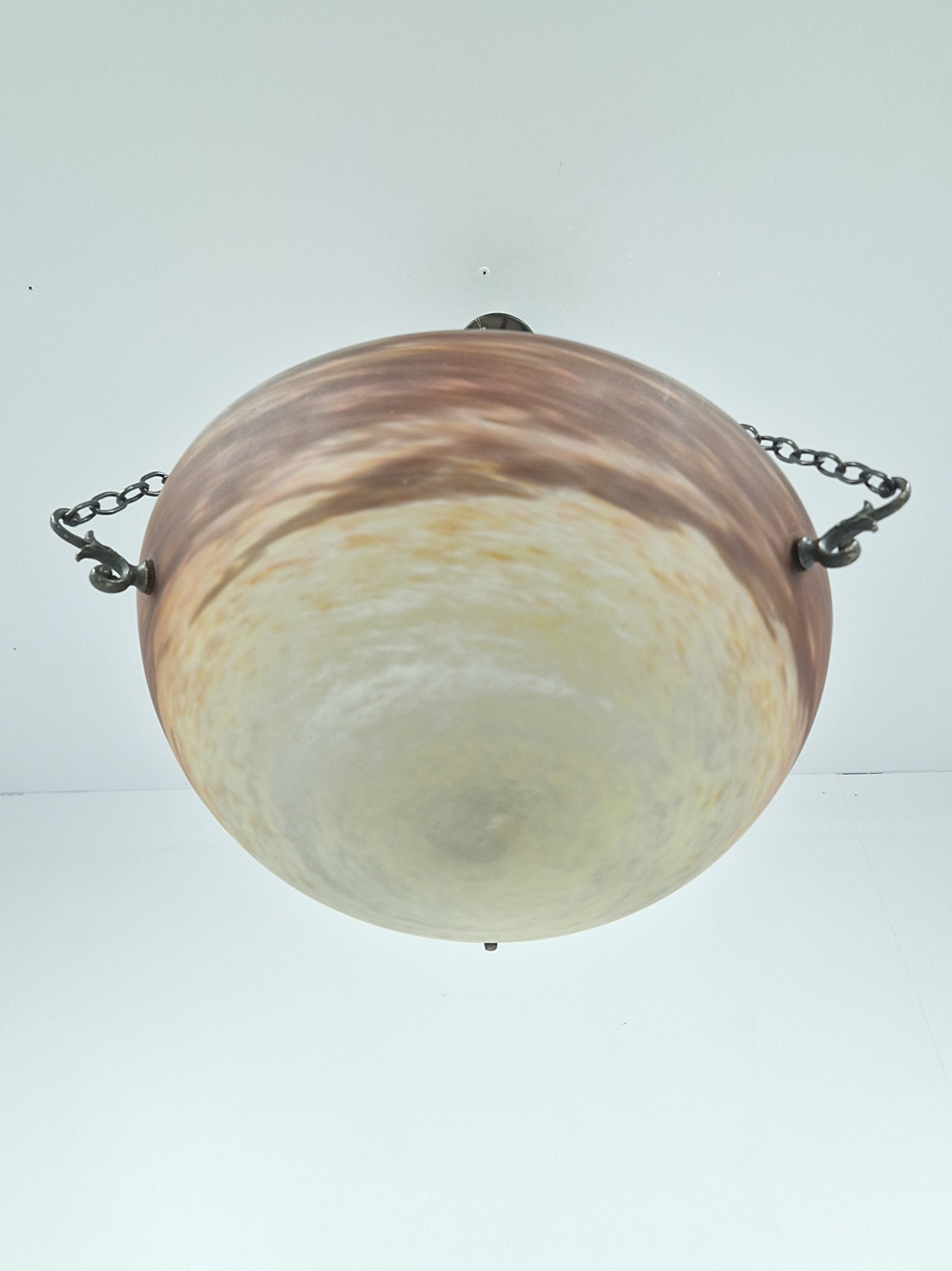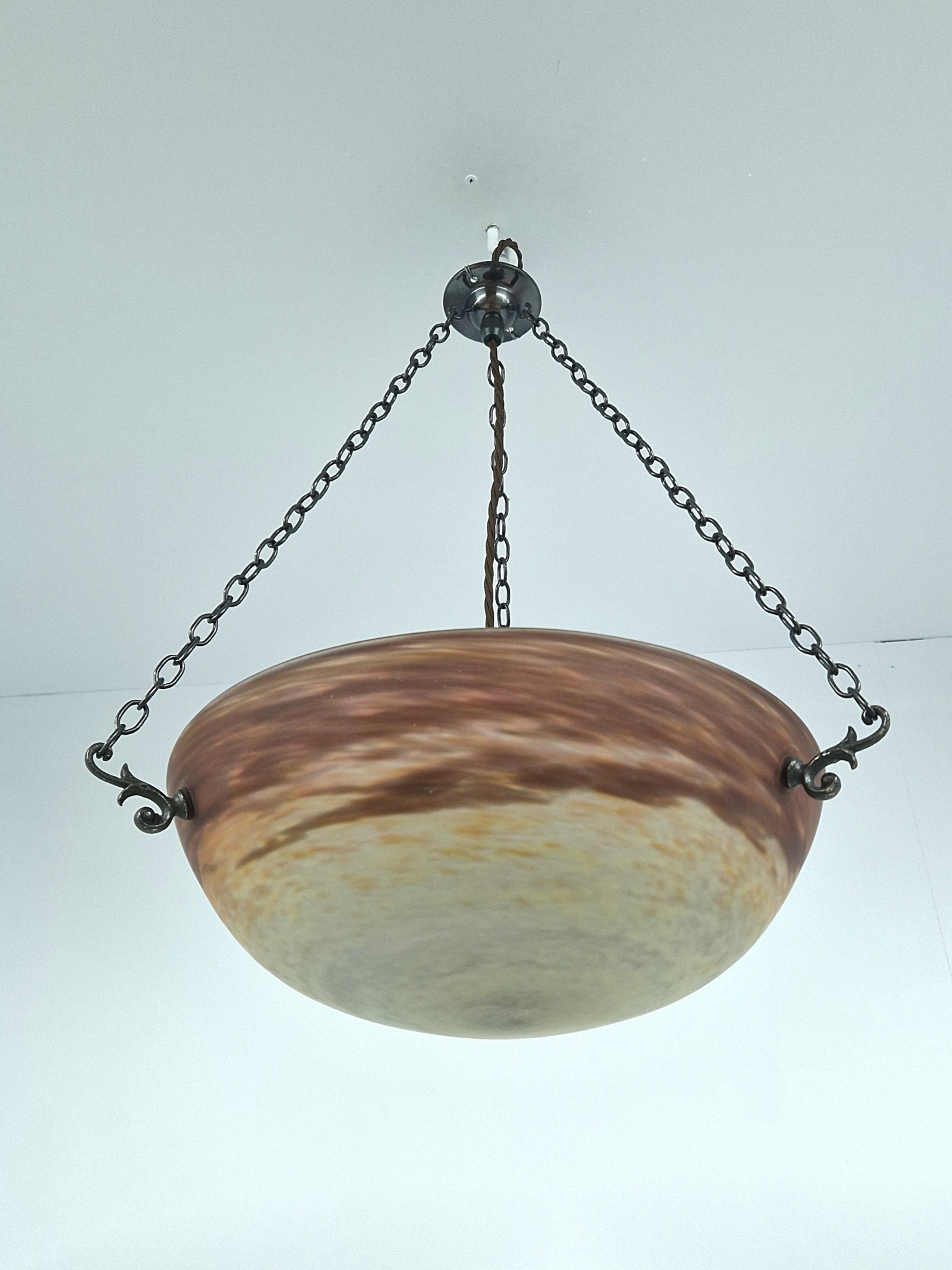 Product Code: LG678A good quality coloured-glass “pate-de-verre” plafonnier in tones of aubergine and signed Muller Frères, Luneville with original antique-brass bowl hooks, chain and replacement ceiling rose for suspension. France c.1925