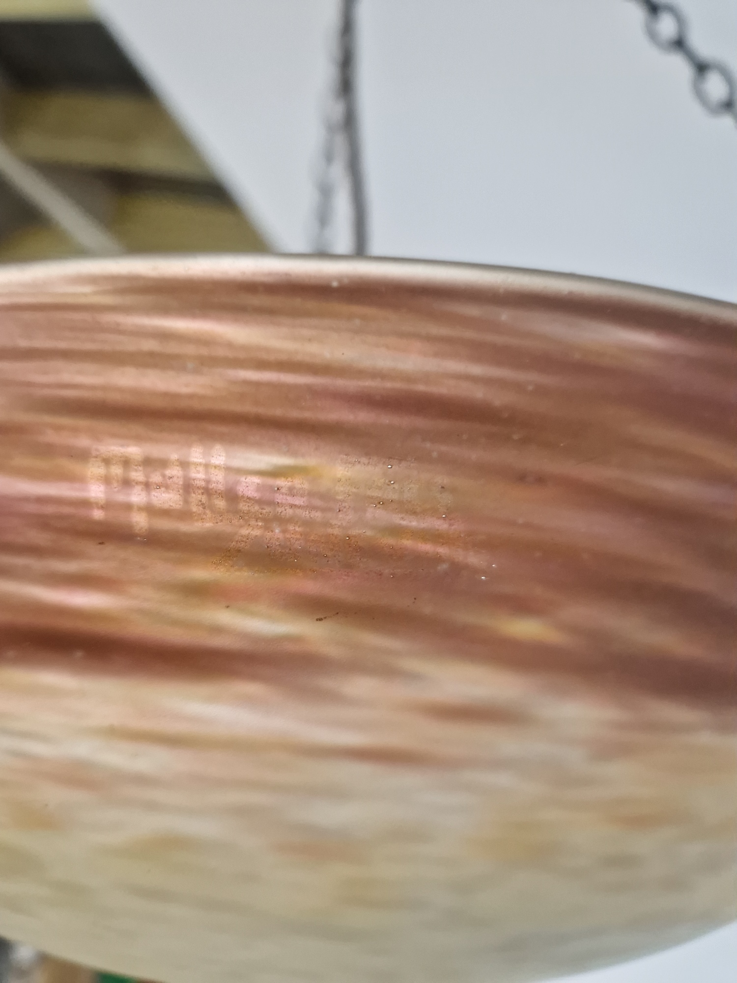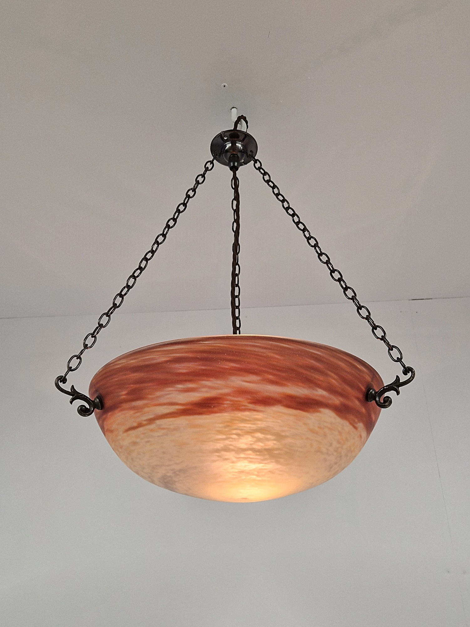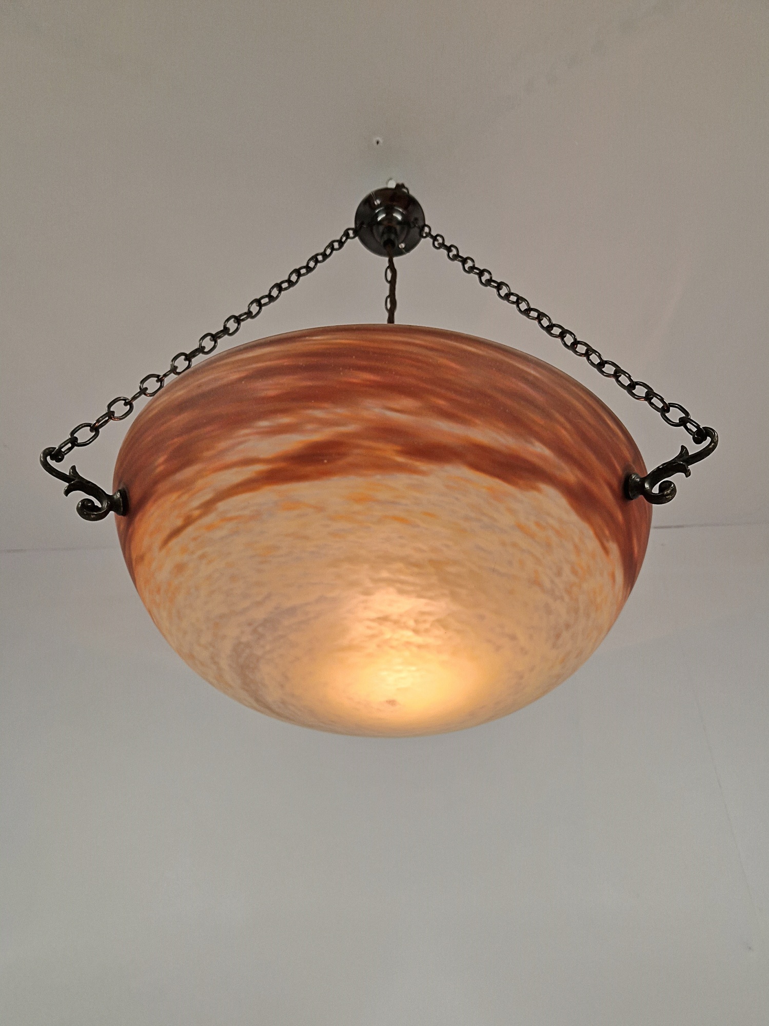 Product Code: LG678A good quality coloured-glass “pate-de-verre” plafonnier in tones of aubergine and signed Muller Frères, Luneville with original antique-brass bowl hooks, chain and replacement ceiling rose for suspension. France c.1925