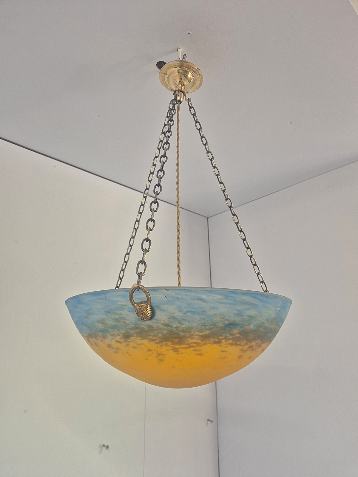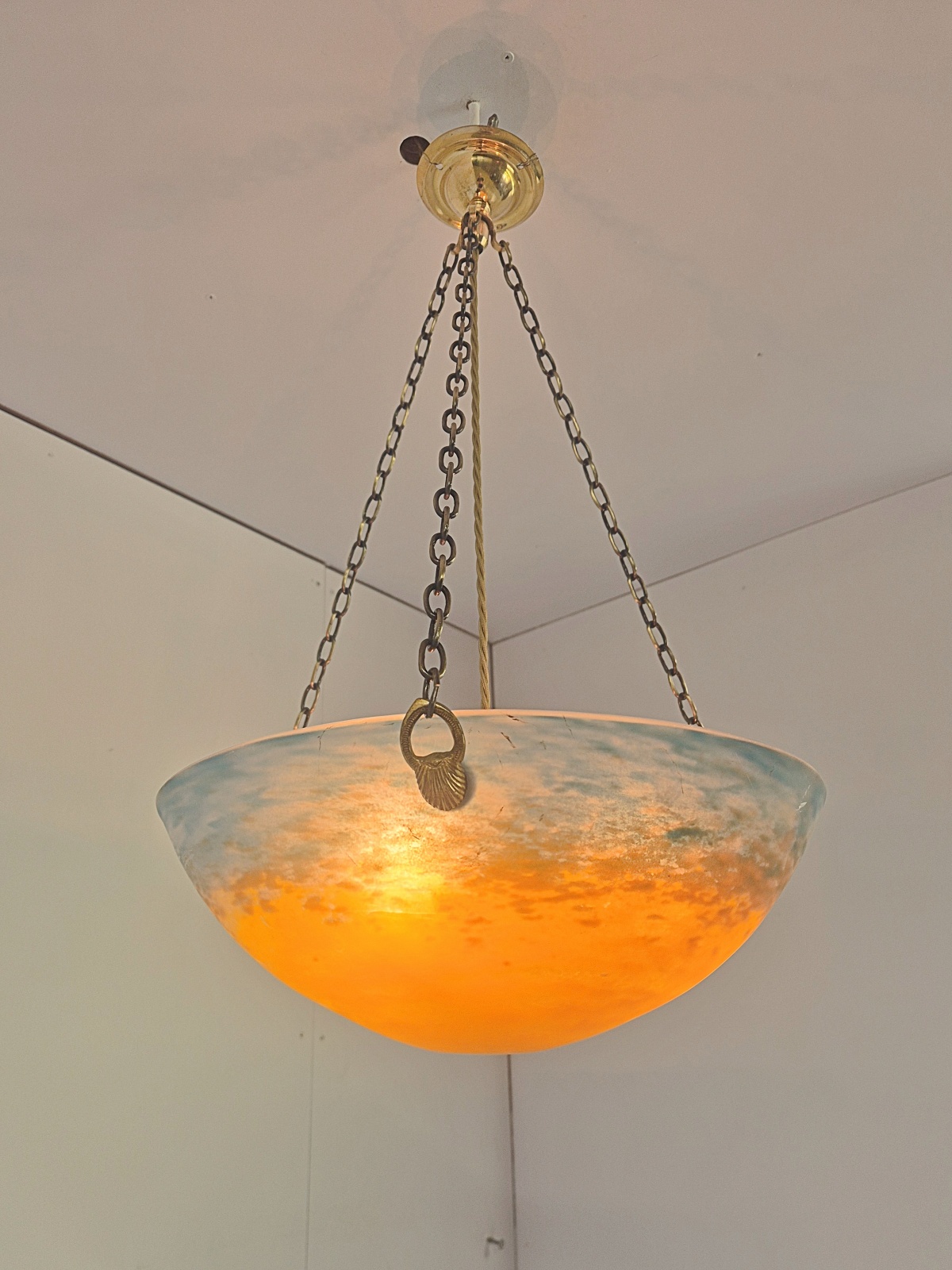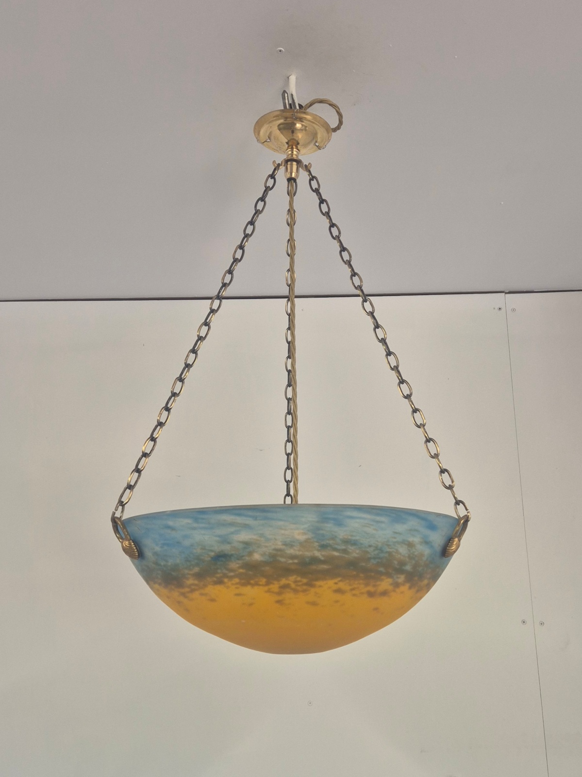 A decorative pate-de-verre plafonnier by Muller Fréres, Luneville, the glass designed in mottled shades of orange,aubergine and blue. Complimented with original good quality bowl hooks and replacement chain and ceiling hook for suspension. France c.1930