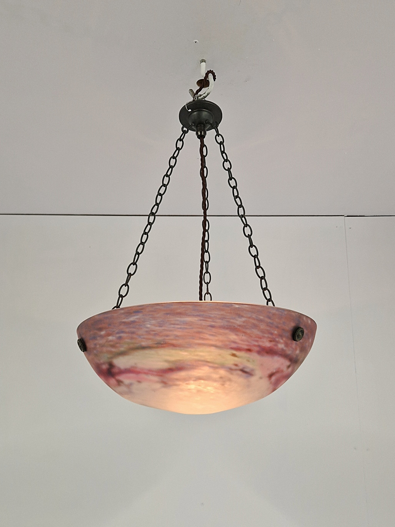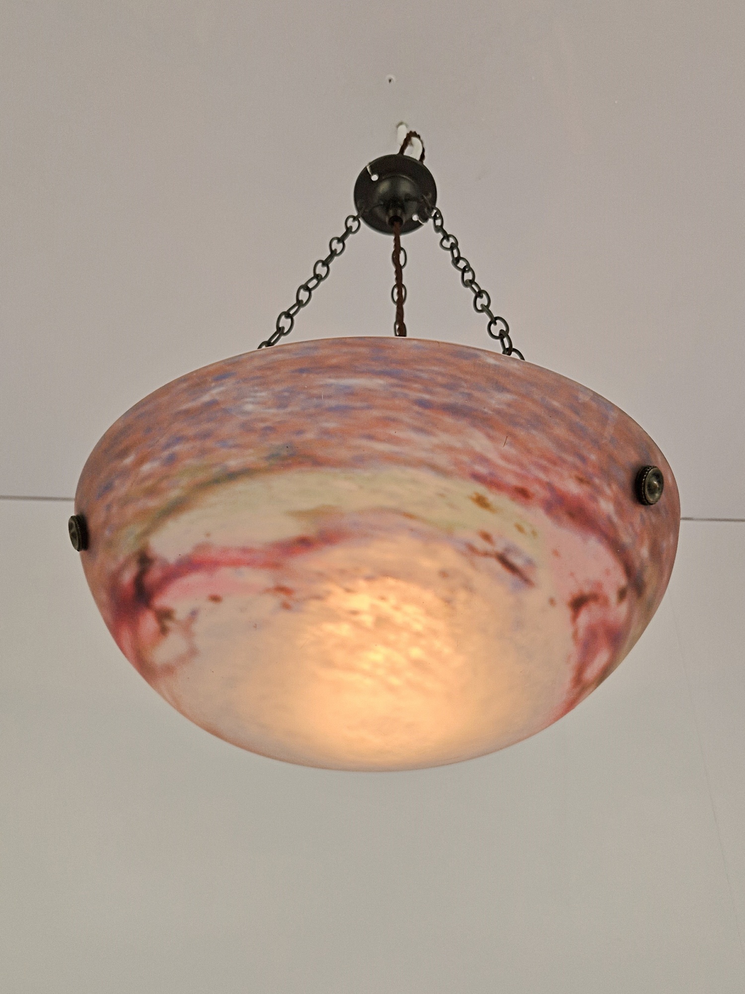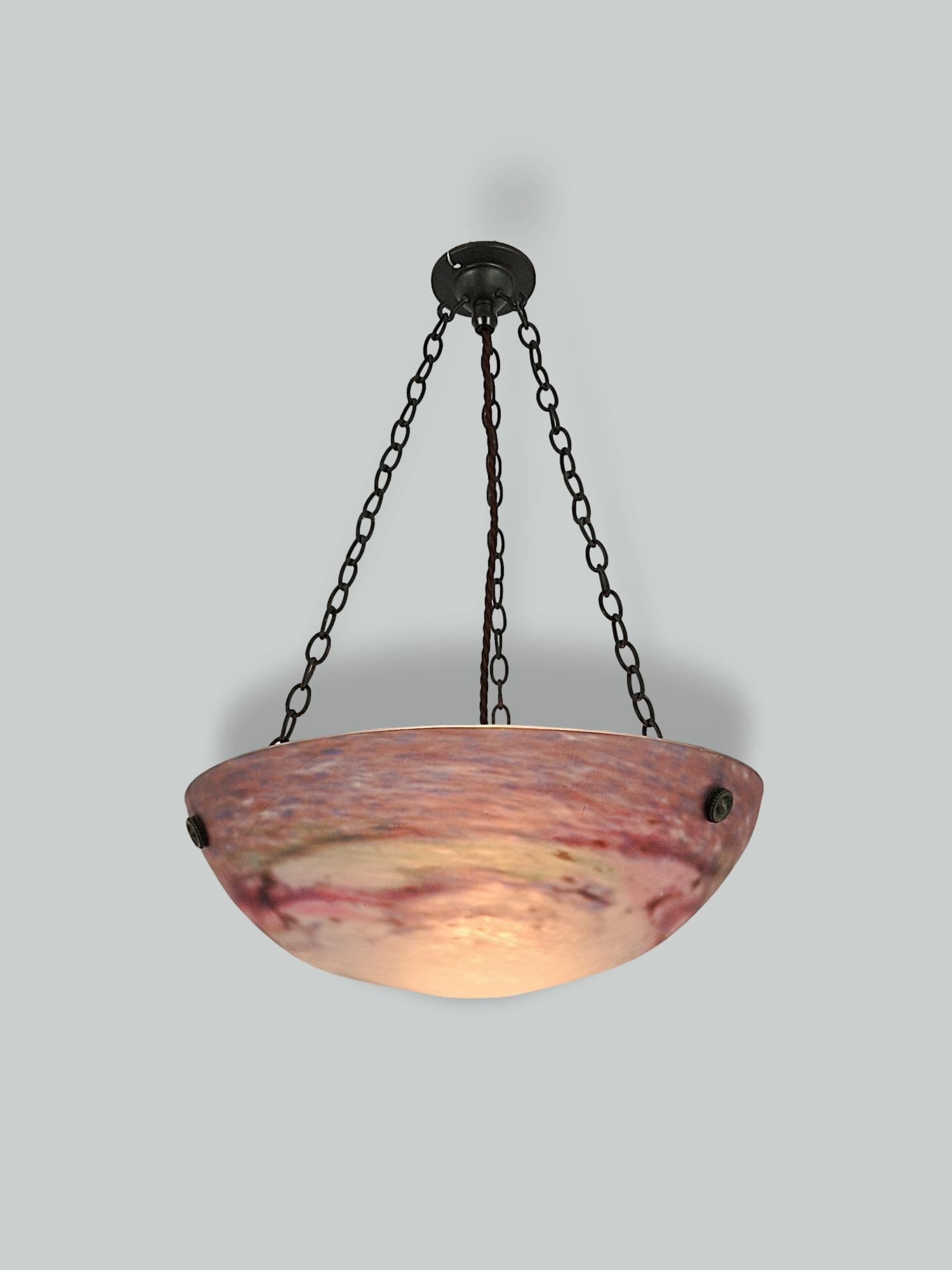 Product Code: LG6942 similar good quality coloured-glass “pate-de-verre” plafonnier in tones of aubergine and signed Muller Frères, Luneville with original dark bronze bowl hooks, replacement chain and ceiling rose for suspension. 1 coupe with a white mottling to the center (main photo) and 1 in light pink mottling (see final photo) France c.1925