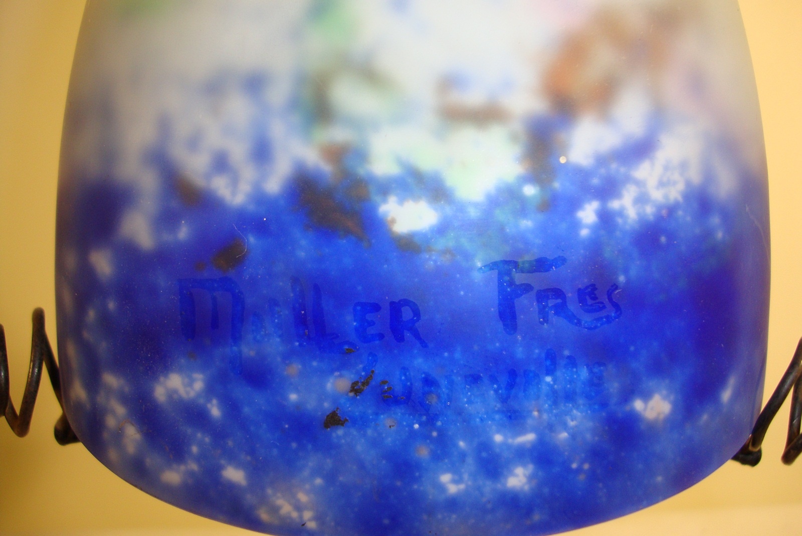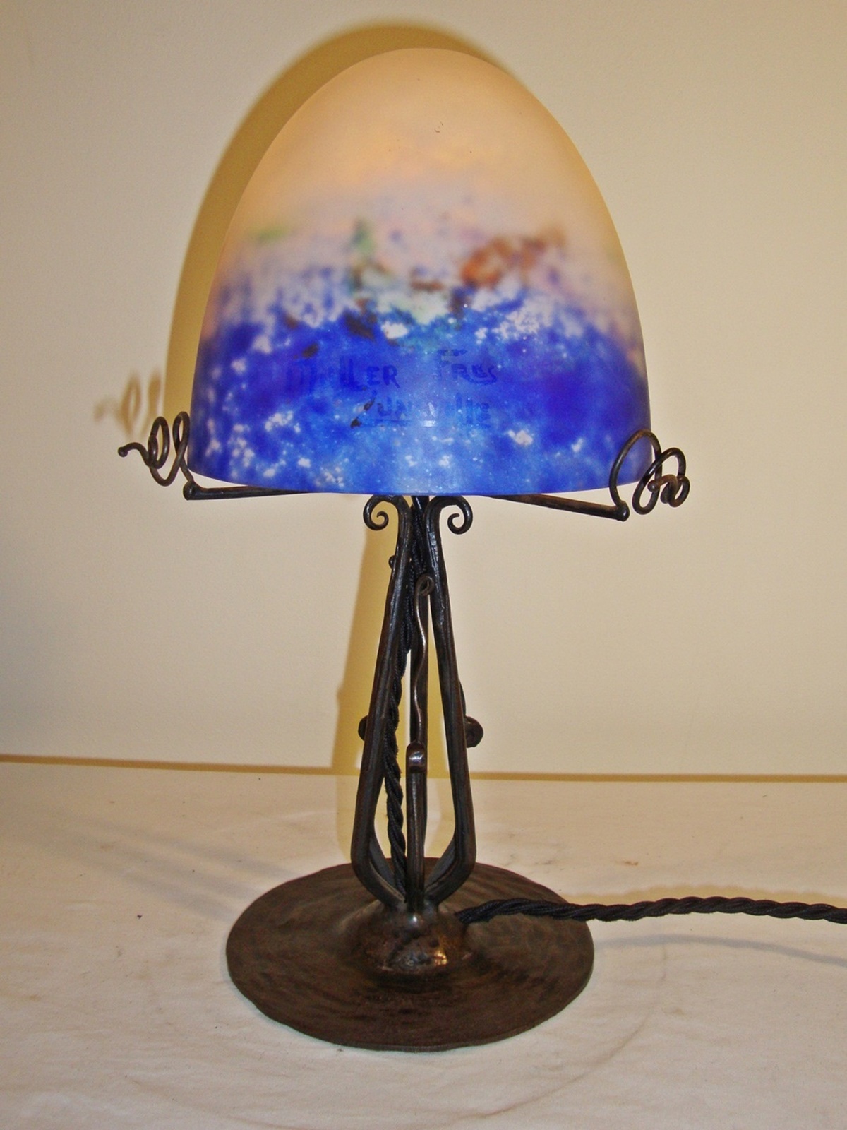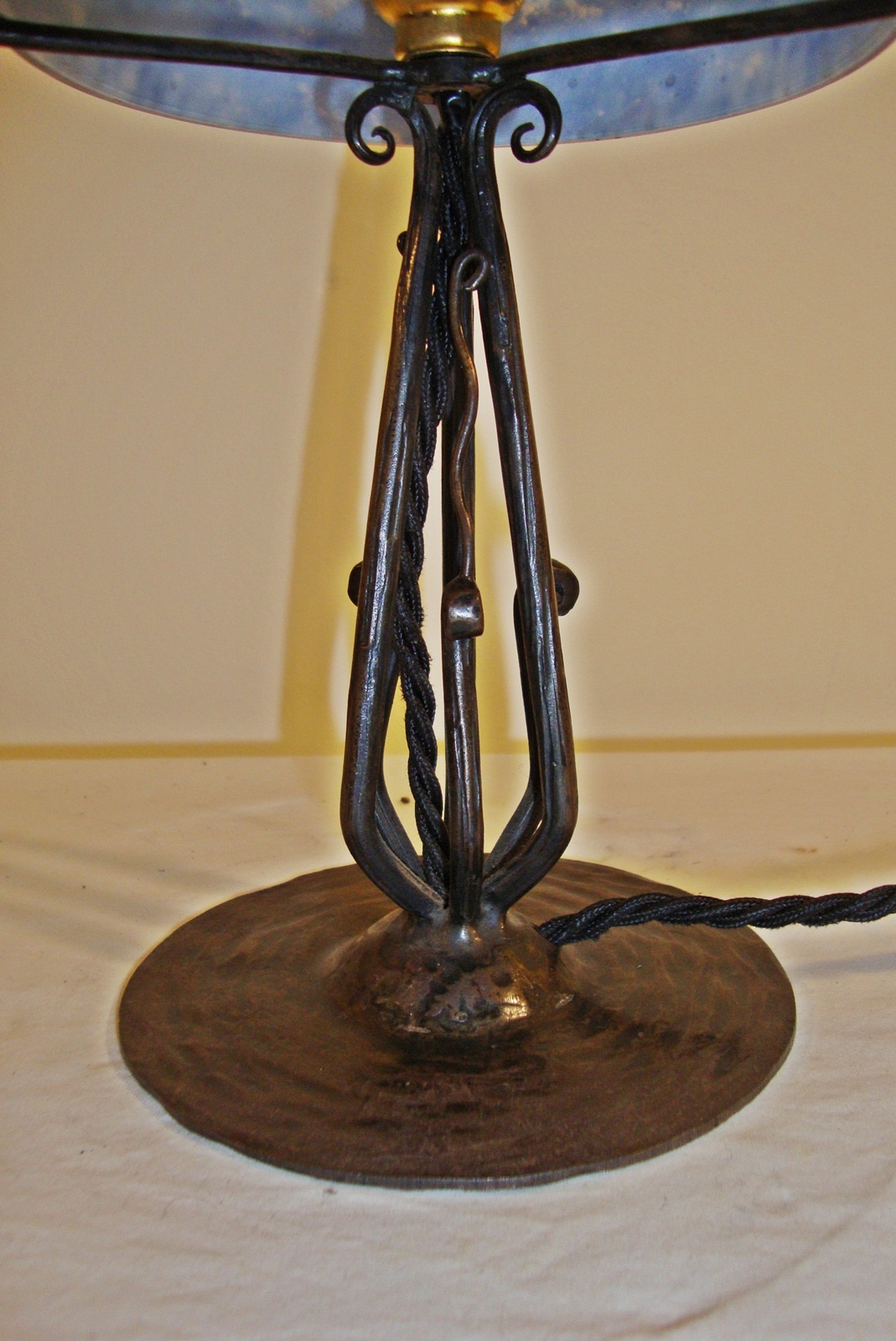 A wrought-iron “mushroom” table lamp with “pate-de-verre” glass shade signed “Muller Fres, Luneville”. France c1930