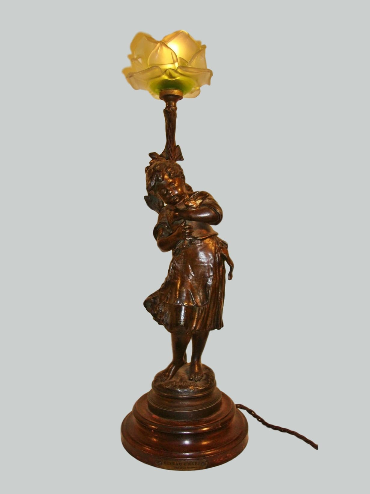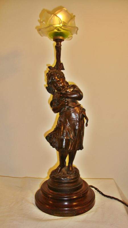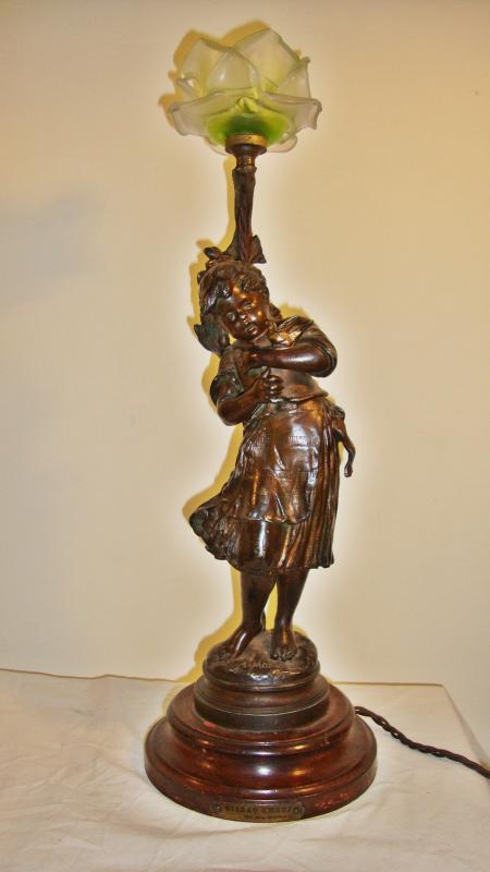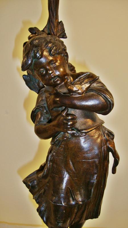 Product Code: JAL0319A bronzed-spelter figural lamp of a small girl holding a bird in her arms, a tree trunk behind her supports a coloured rose-petal lampshade, all set on a rouge-marble base with original brass plaque engraved “Oiseau Cheri par Aug. Moreau”. France, c.1900.