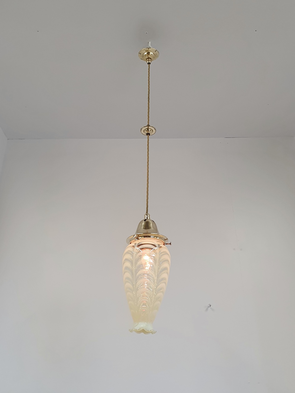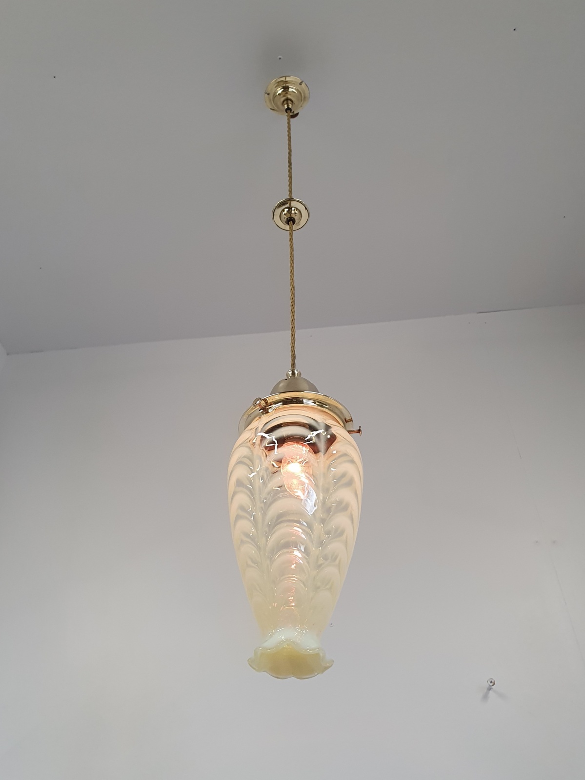 Product Code: JAL1087An Impressive vaseline glass pendant lampshade possibly by Thomas Webb due to the “cascade pattern. The shade comes with its original solid bronze/brass gallery and flex spacer to complement. England c.1900