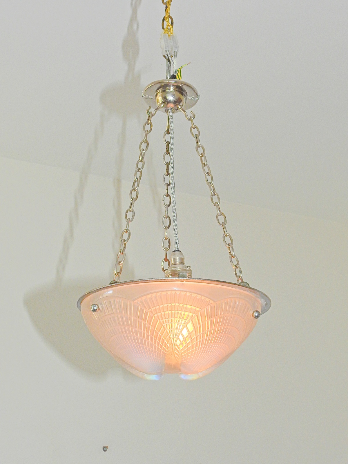 Product Code: LG469A small “Vase Coquilles” opalescent-glass plafonnier designed and signed by René Lalique designed with shells. This bijou ceiling lamp comes with the the original chain and a replacement, but sympathetic, ceiling rose for suspension.