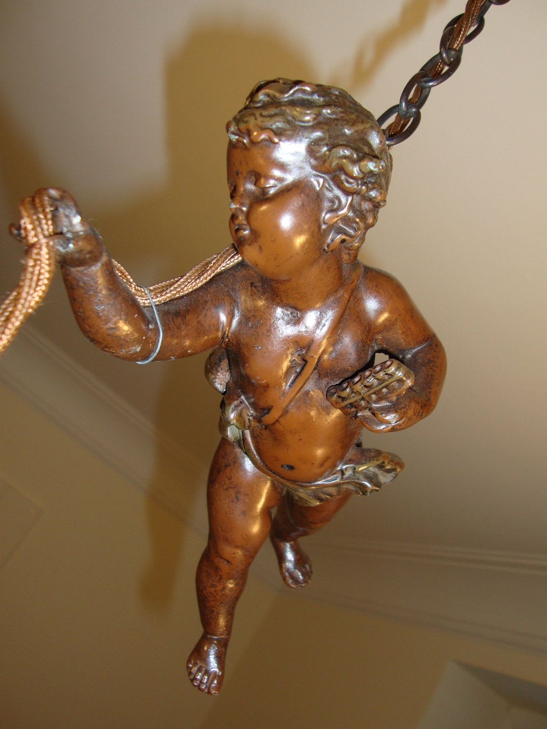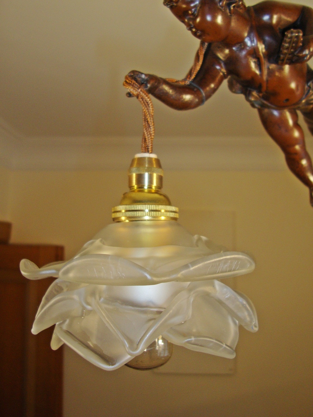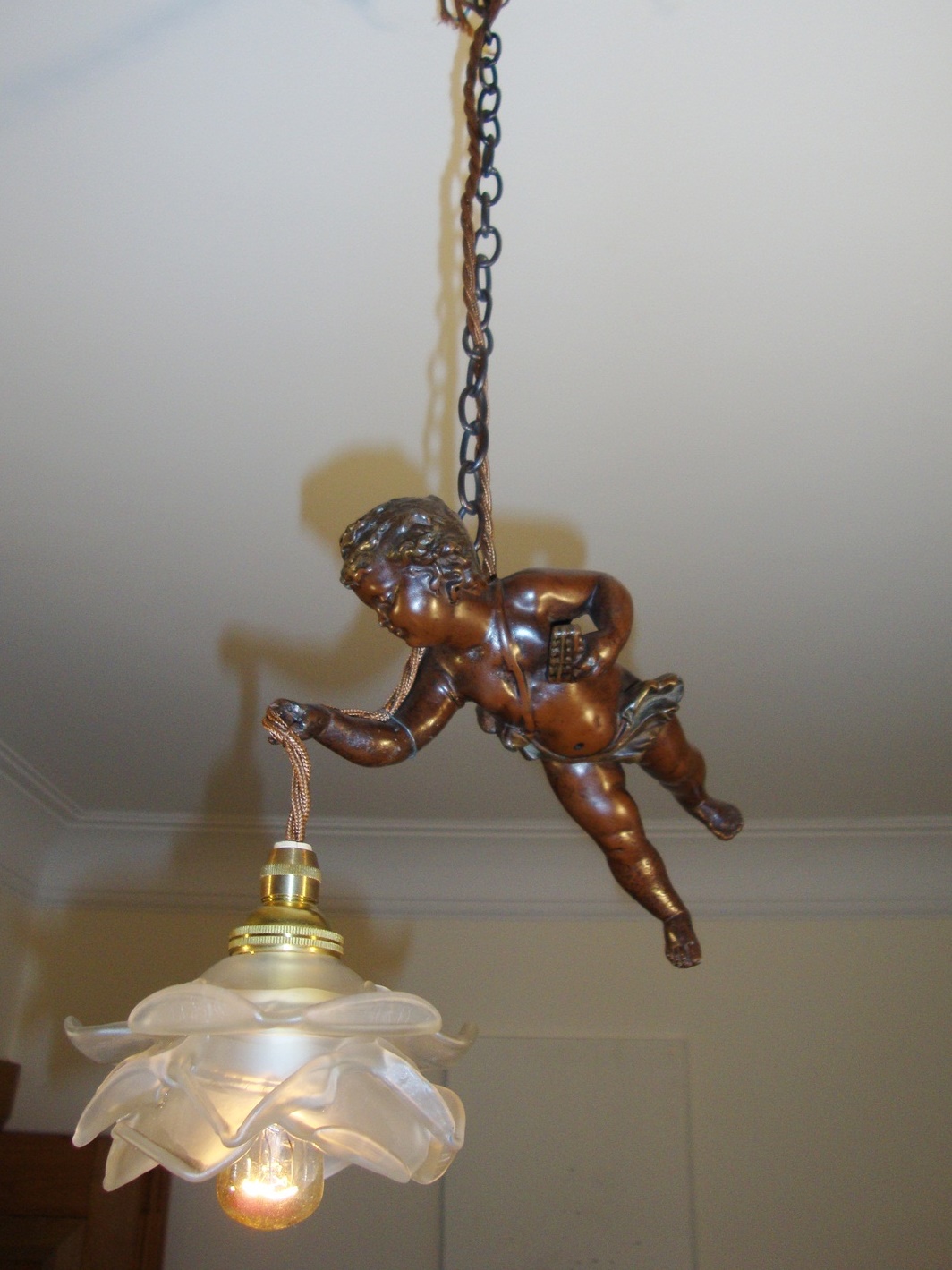 A spelter hanging cherub lamp with good bronze patination, supporting pendant a “rose-petal” lampshade. France c1910.