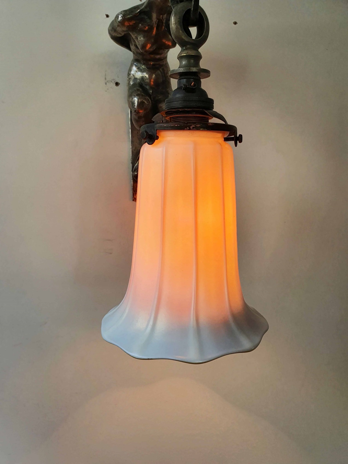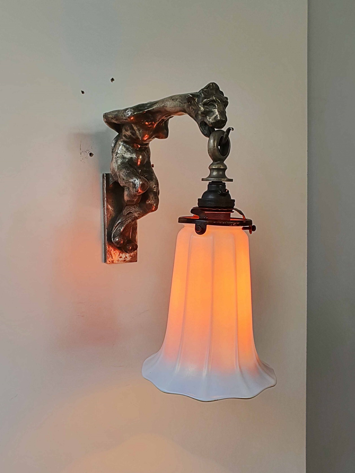 Product Code: LG636A highly unusual silvered-bronze art nouveau wall light, possibly French, designed as a naked woman with the head of a lioness and supporting an irridescent glass Aurene lampshade by Steuben U.S.A. C.1905