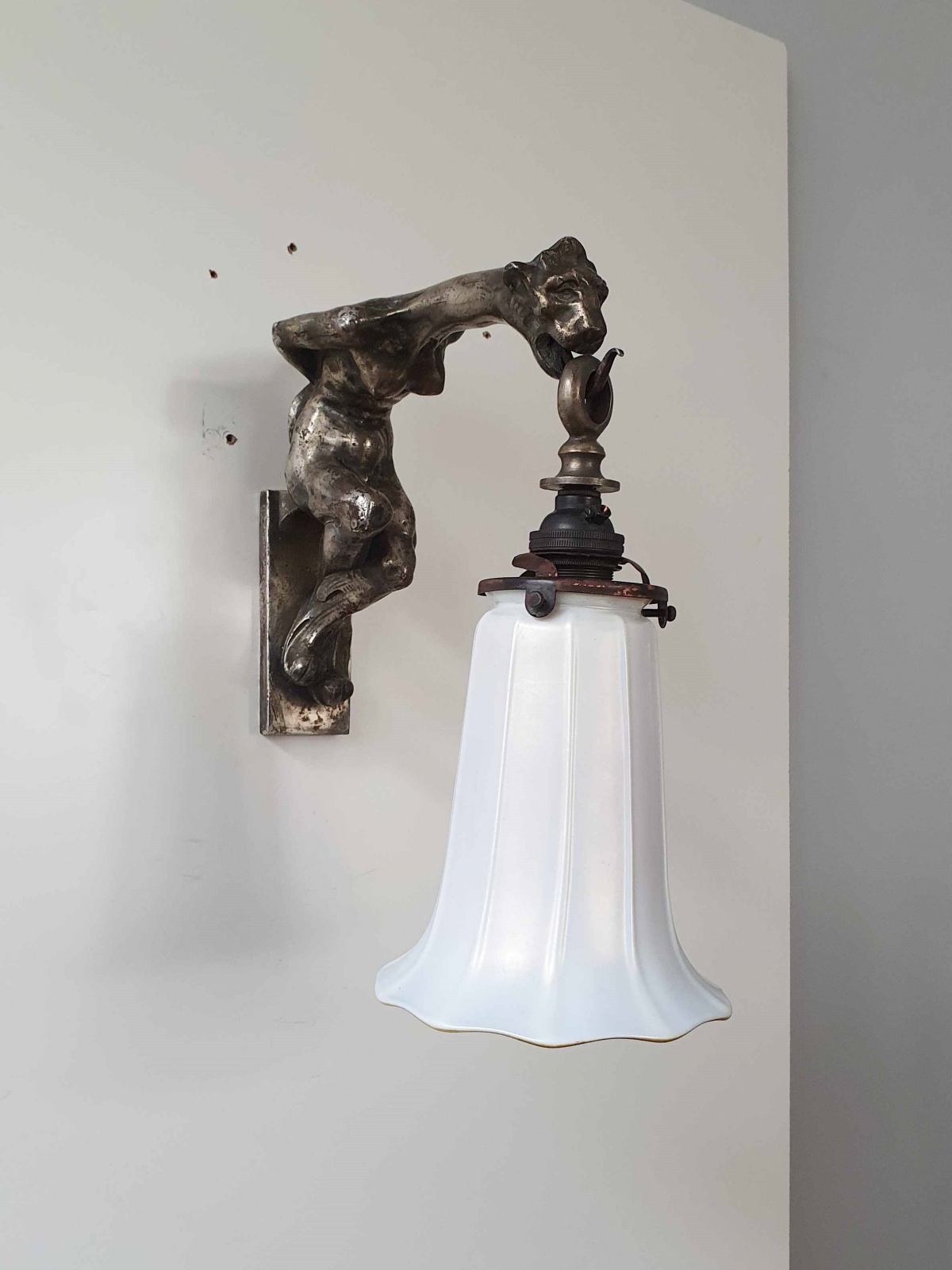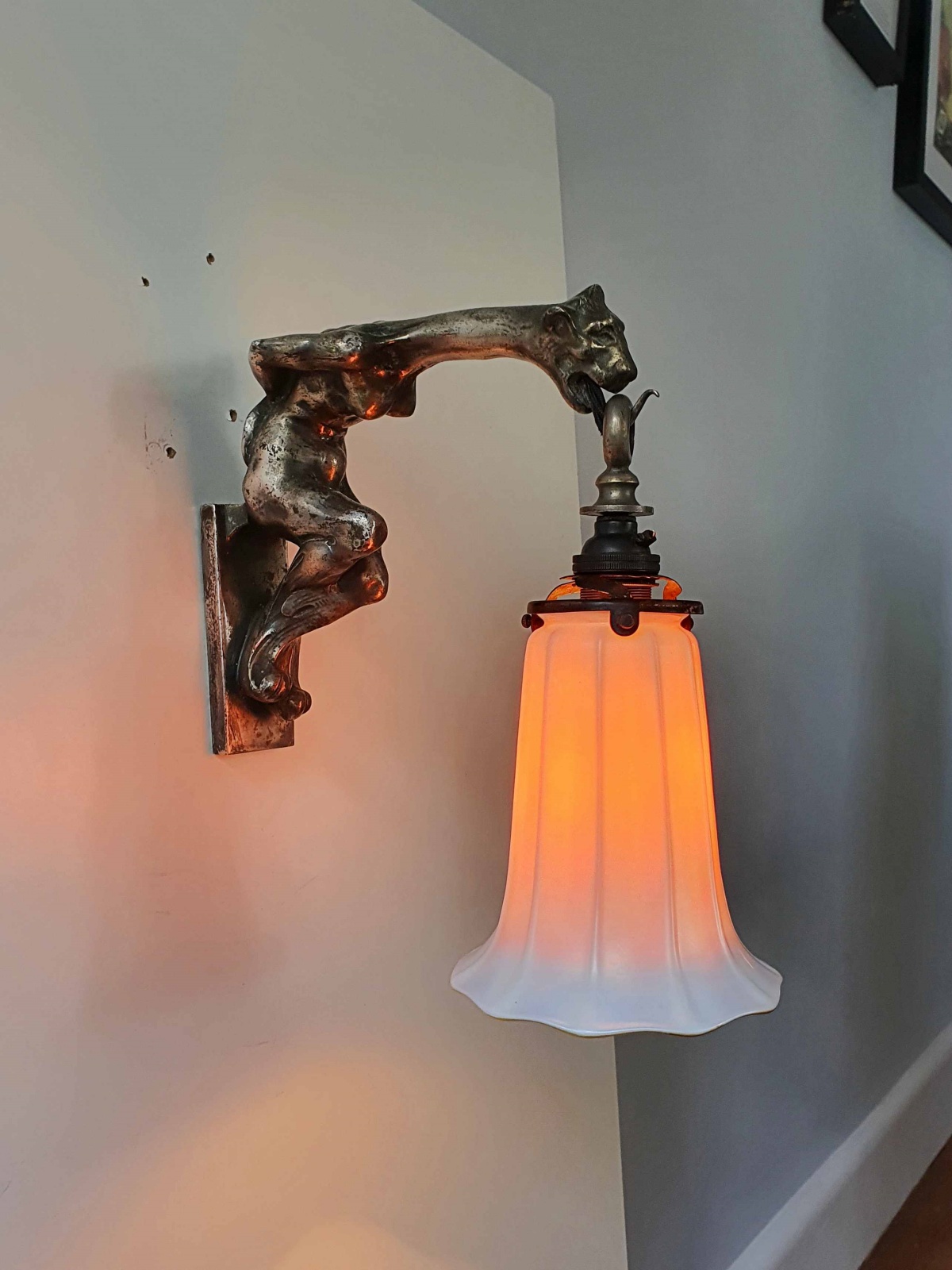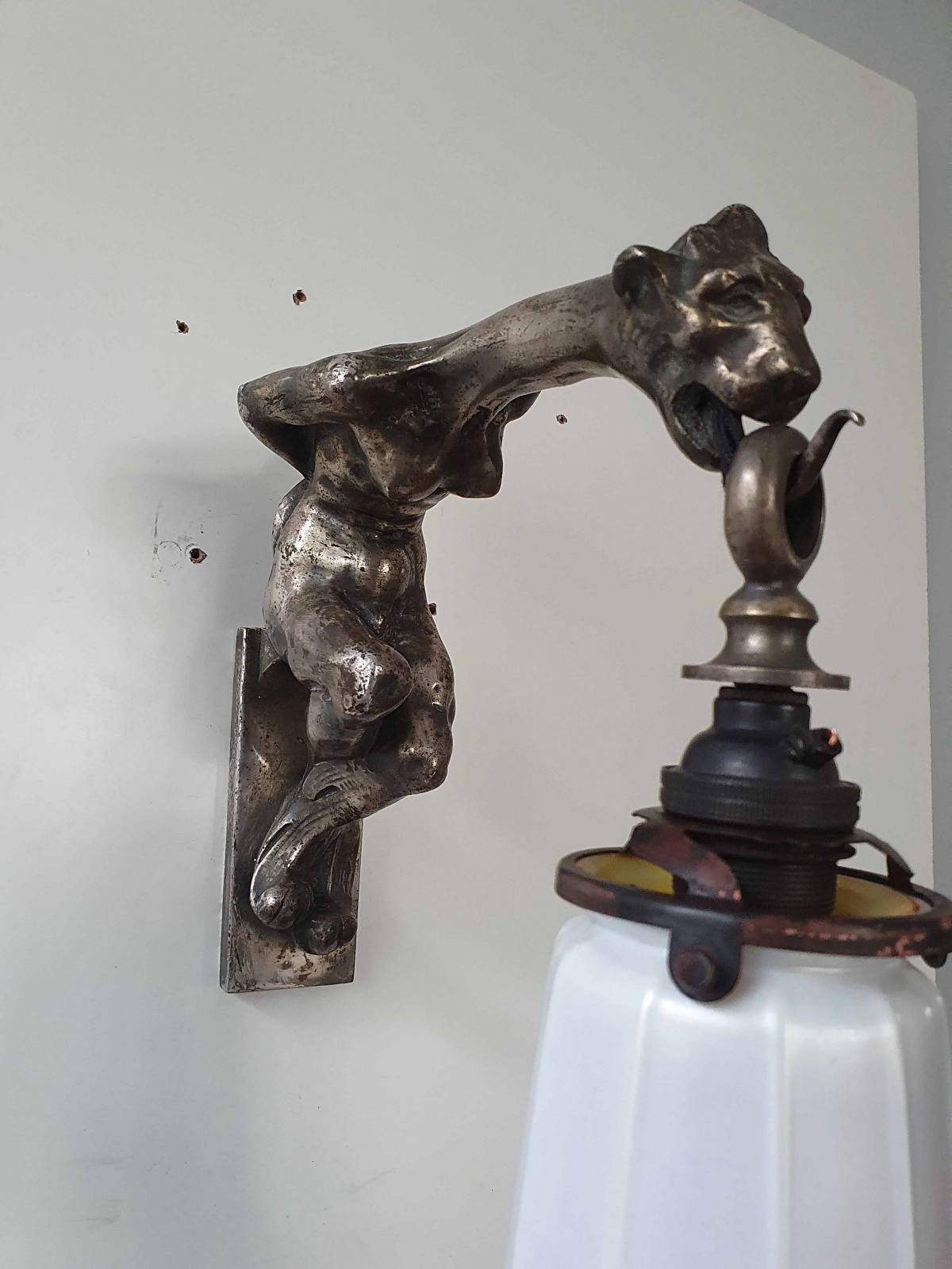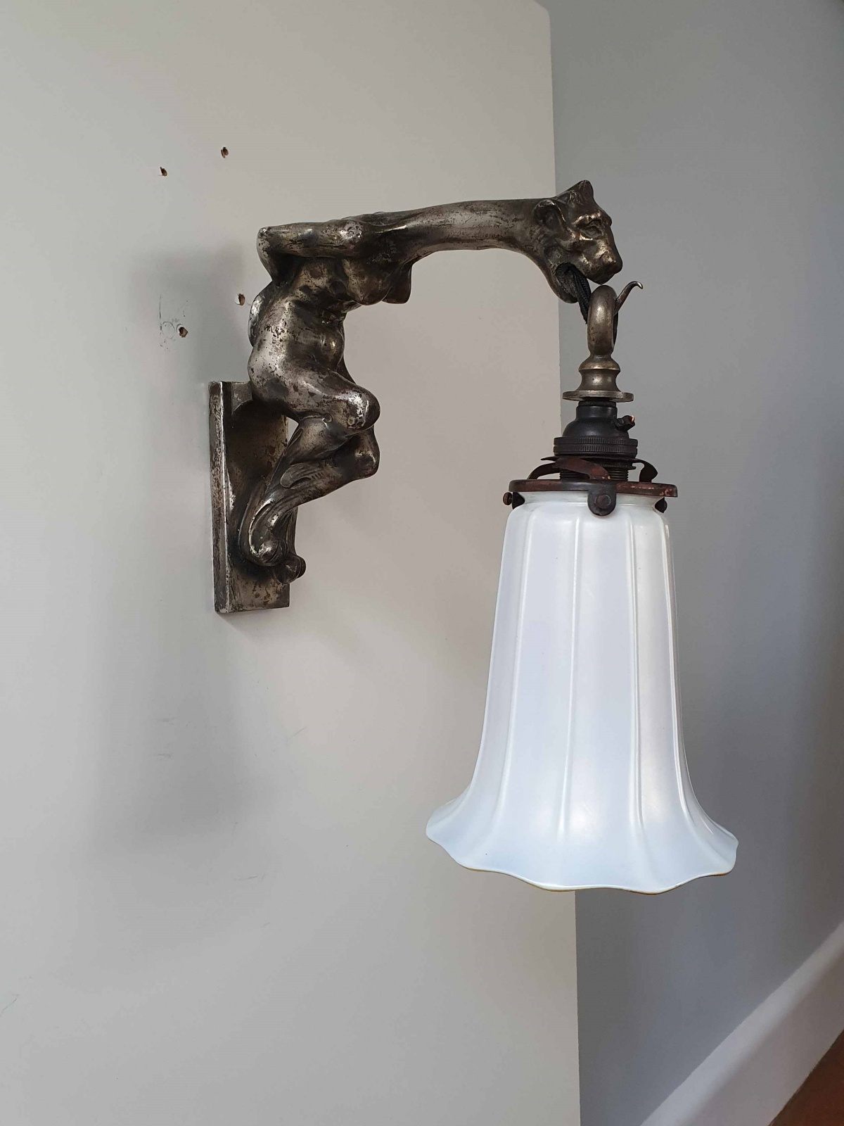 Product Code: LG636A highly unusual silvered-bronze art nouveau wall light, possibly French, designed as a naked woman with the head of a lioness and supporting an irridescent glass Aurene lampshade by Steuben U.S.A. C.1905