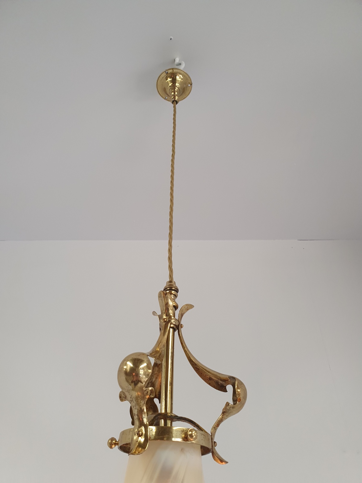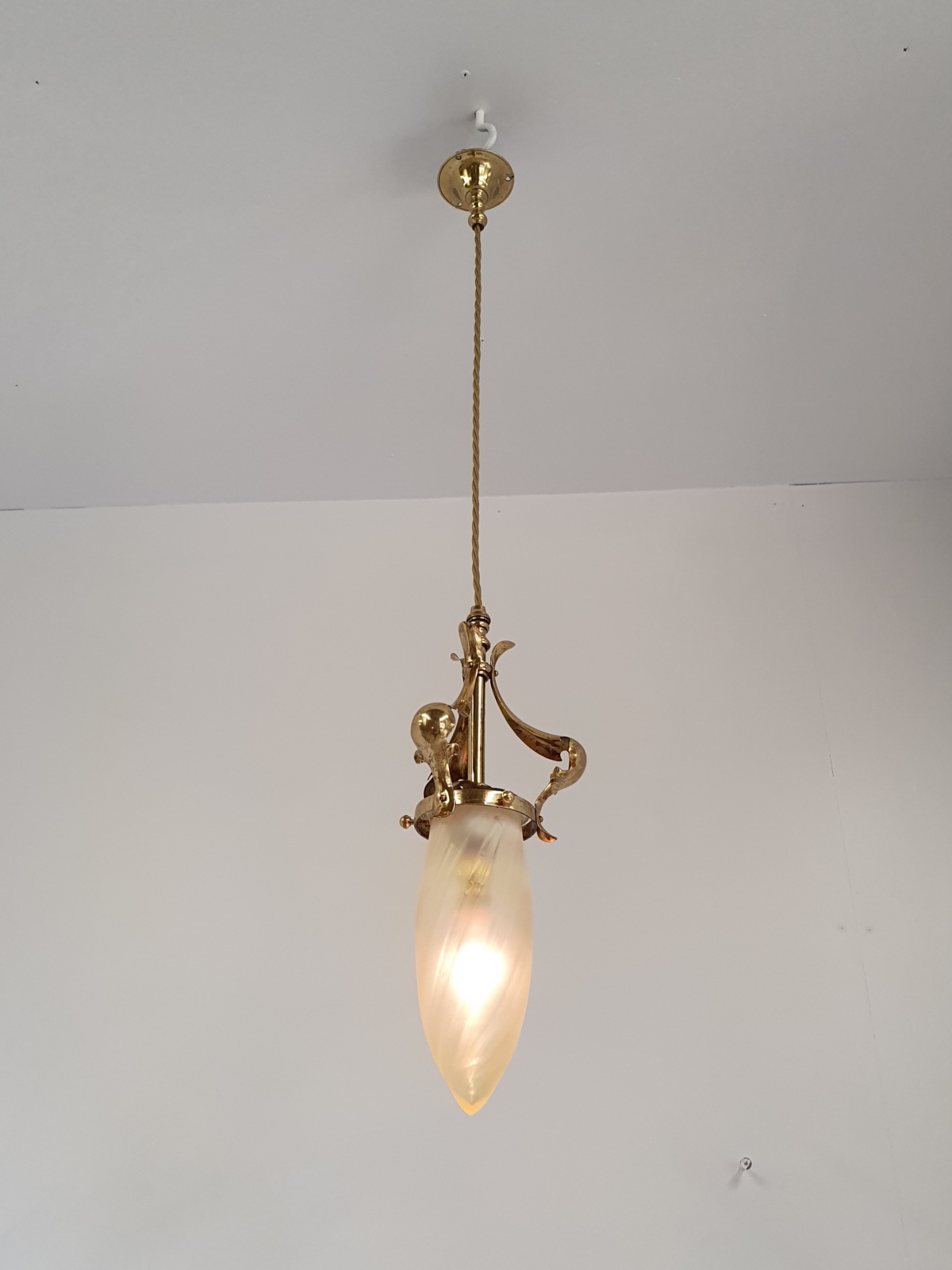 Product Code: JAL1098A good quality vaseline-glass pendant lampshade almost certainly produced at Stourbridge, Birmingham complimented with its original arts & crafts gallery and ceiling rose. England, c1905.