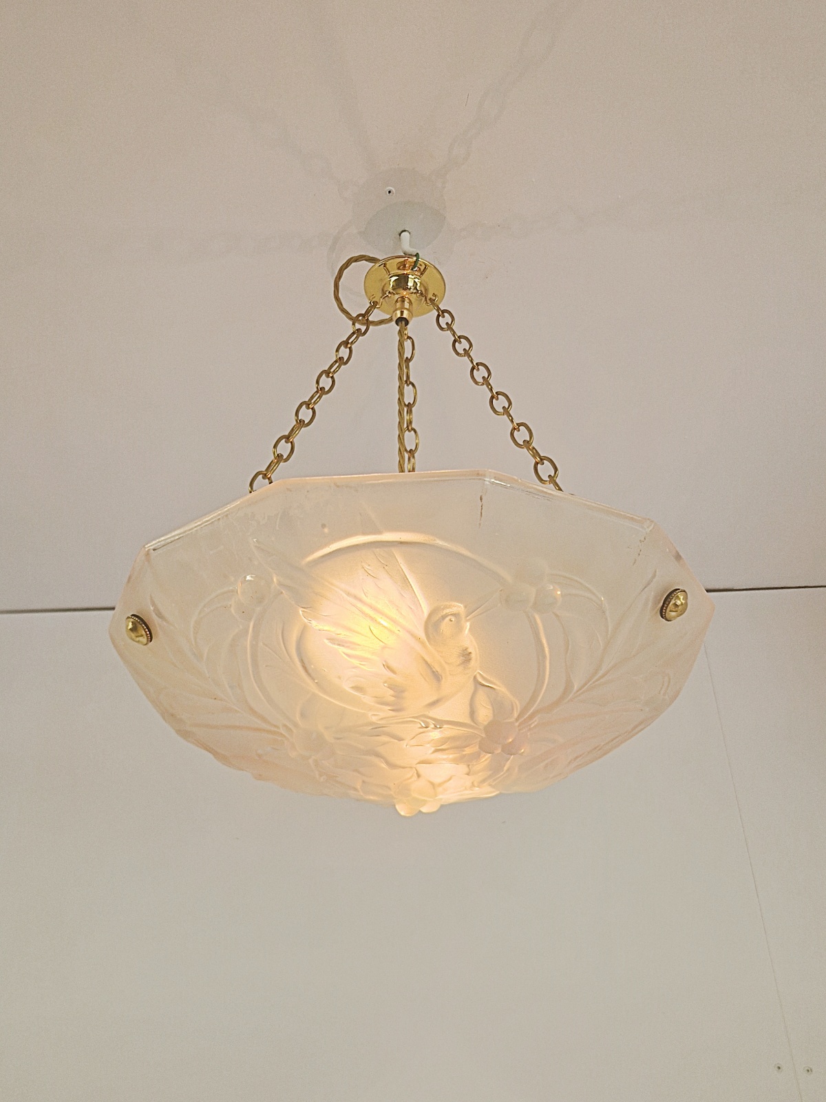 Product Code: LG745An 8 sided opalescent glass plafonnier with birds and cherry branches in the style of Ernst marius Sabino but by an unknown designer. Displayed with replacement brass fitments for suspension but also available to buy with bronze or nickel fitments. France c.1930