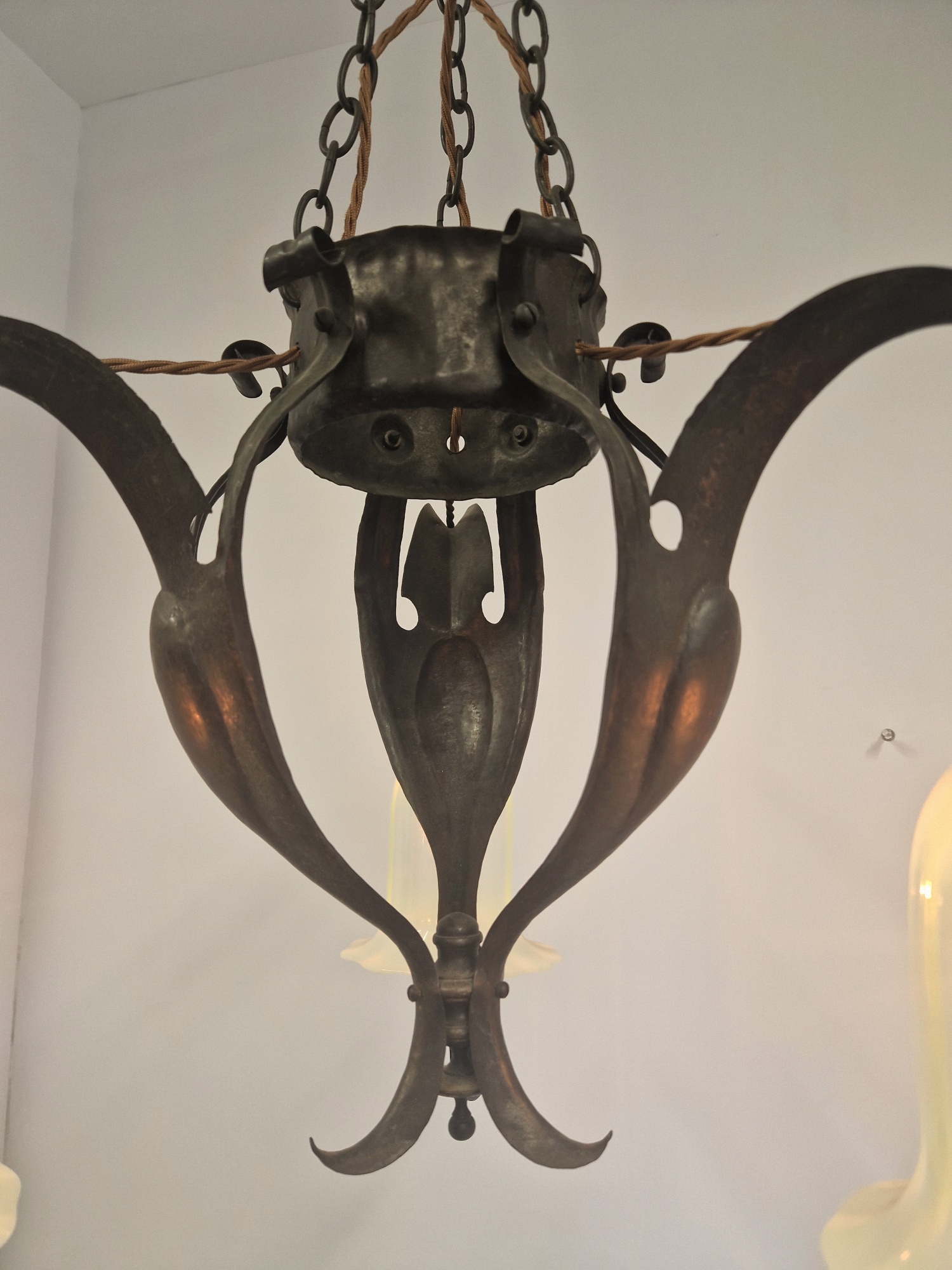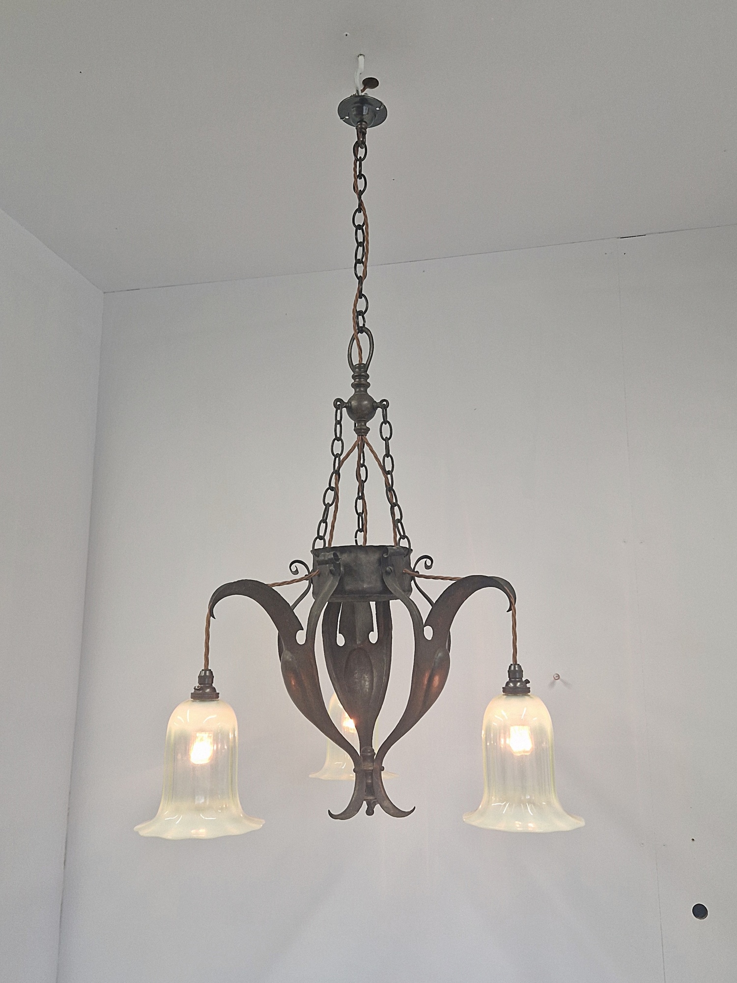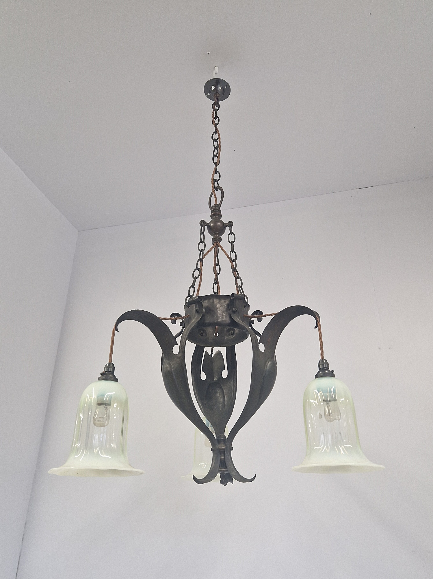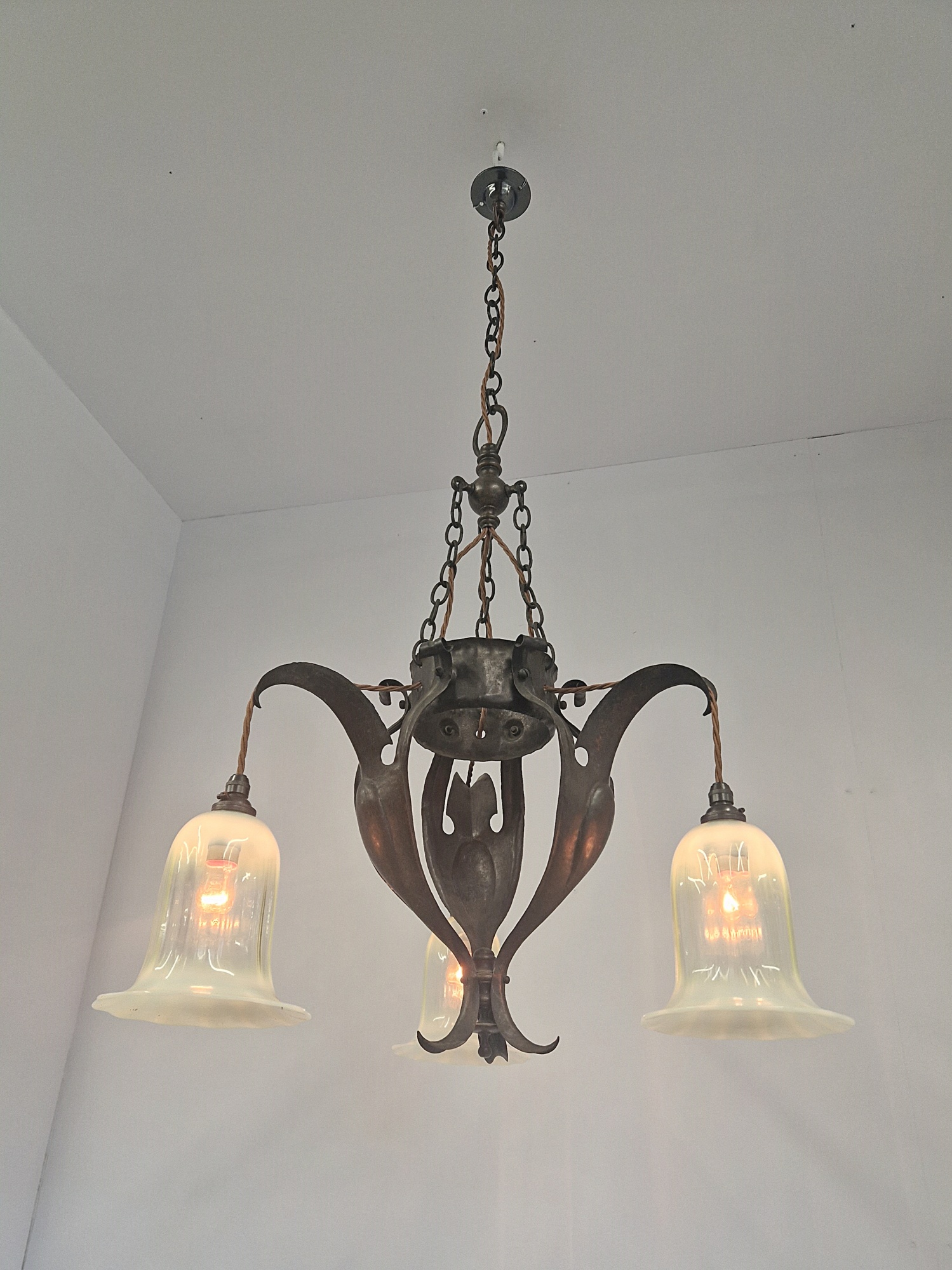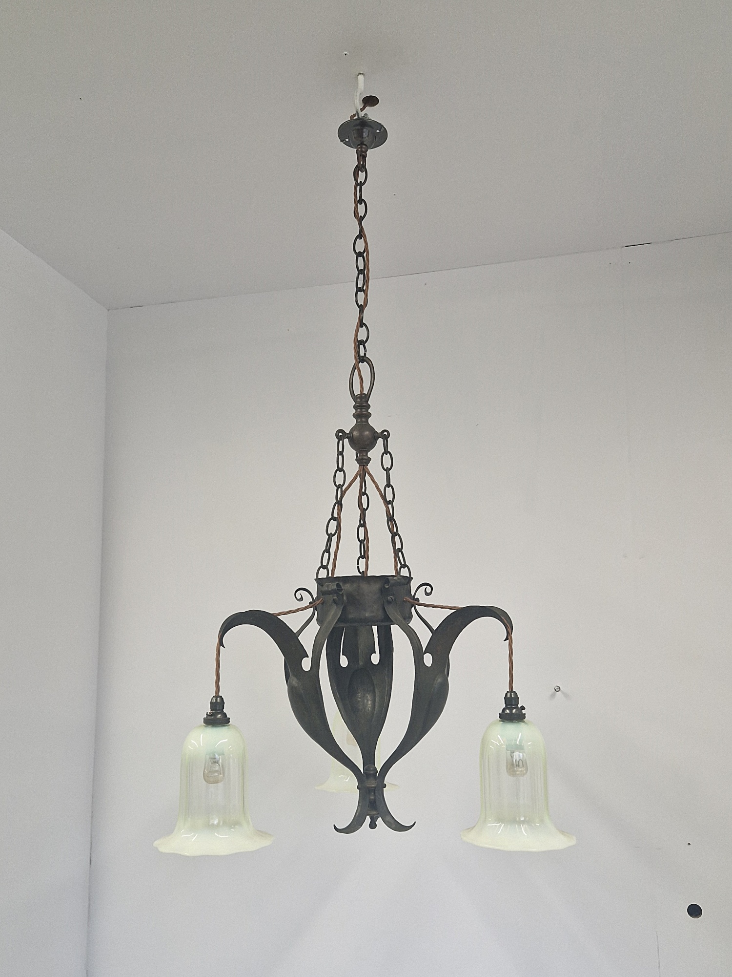 Product Code: JAL1139NS001A very attractive hammered and oxidised-copper arts and crafts hanging lamp in the style of Jesson, Birkett & Co. Each arm supporting pendant a modern vaseline-glass lampshade blown here in the UK. England, c.1900