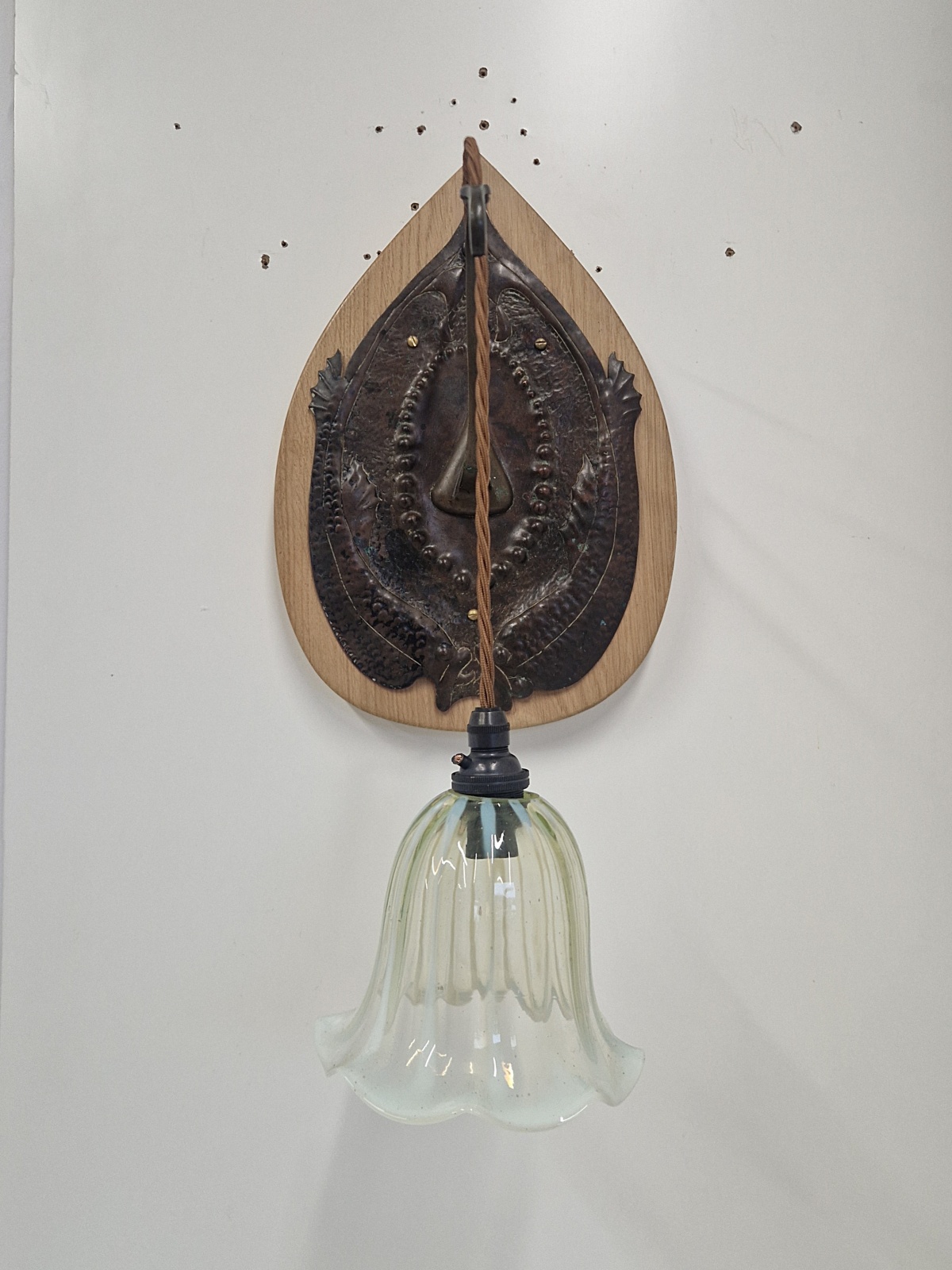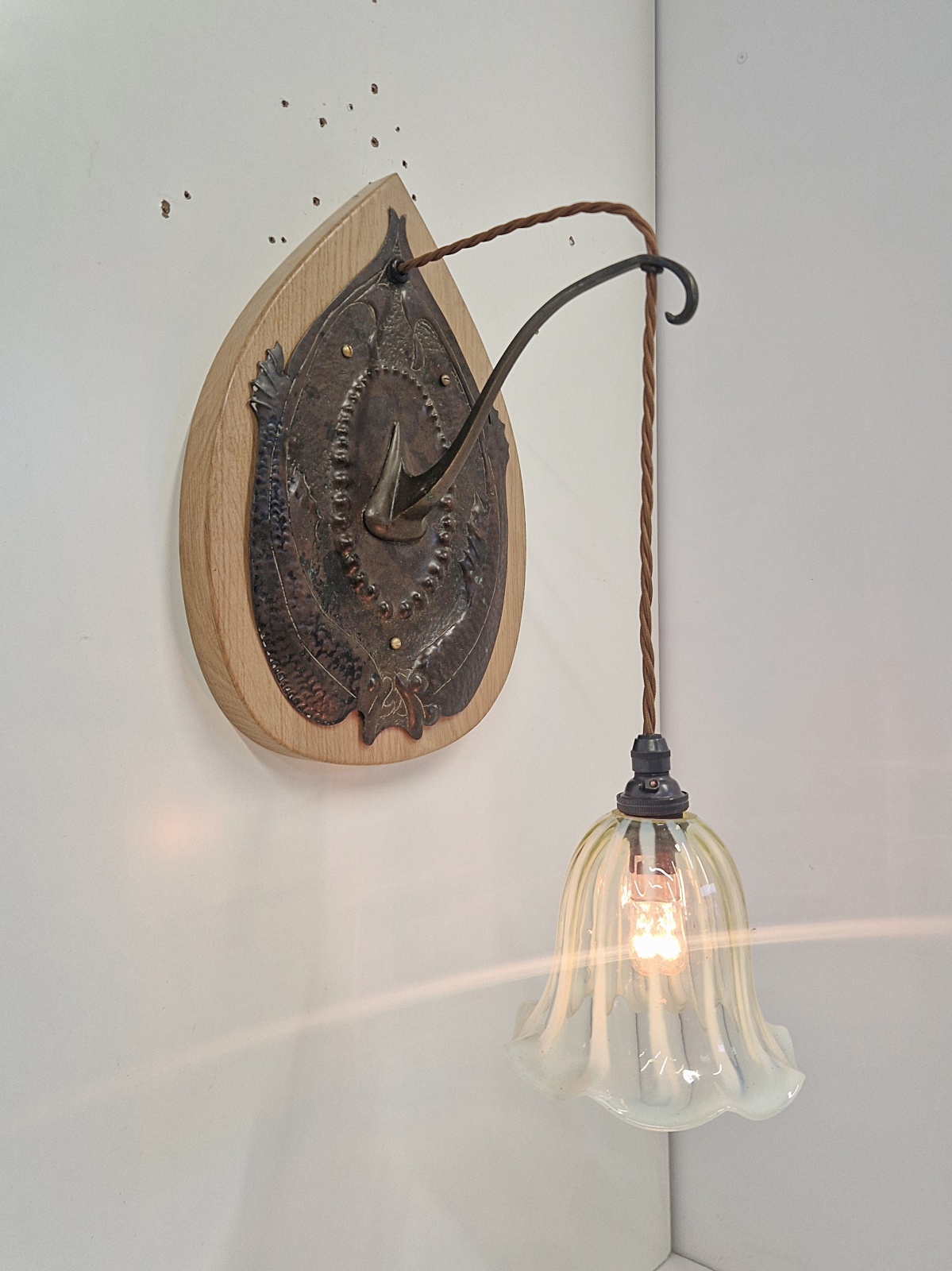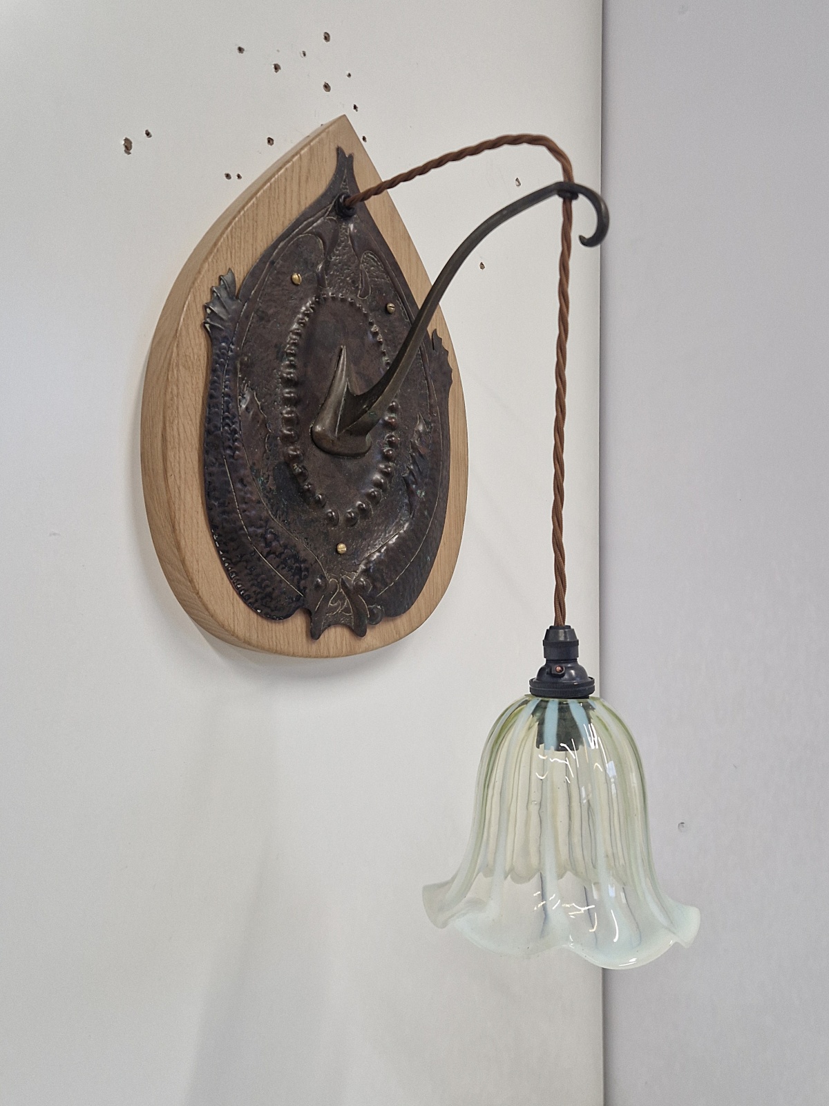 A pair of very rare and important bronzed-copper arts and crafts wall light in the style of John Pearson possibly for The Guild of Handicraft. The delicate & intricate designed sconces in a fish pattern and mounted on replacement oak back-plates . The wall lights now complemented with replacement vaseline-glass lampshades hand blown here by a UK based artisan. England c.1905