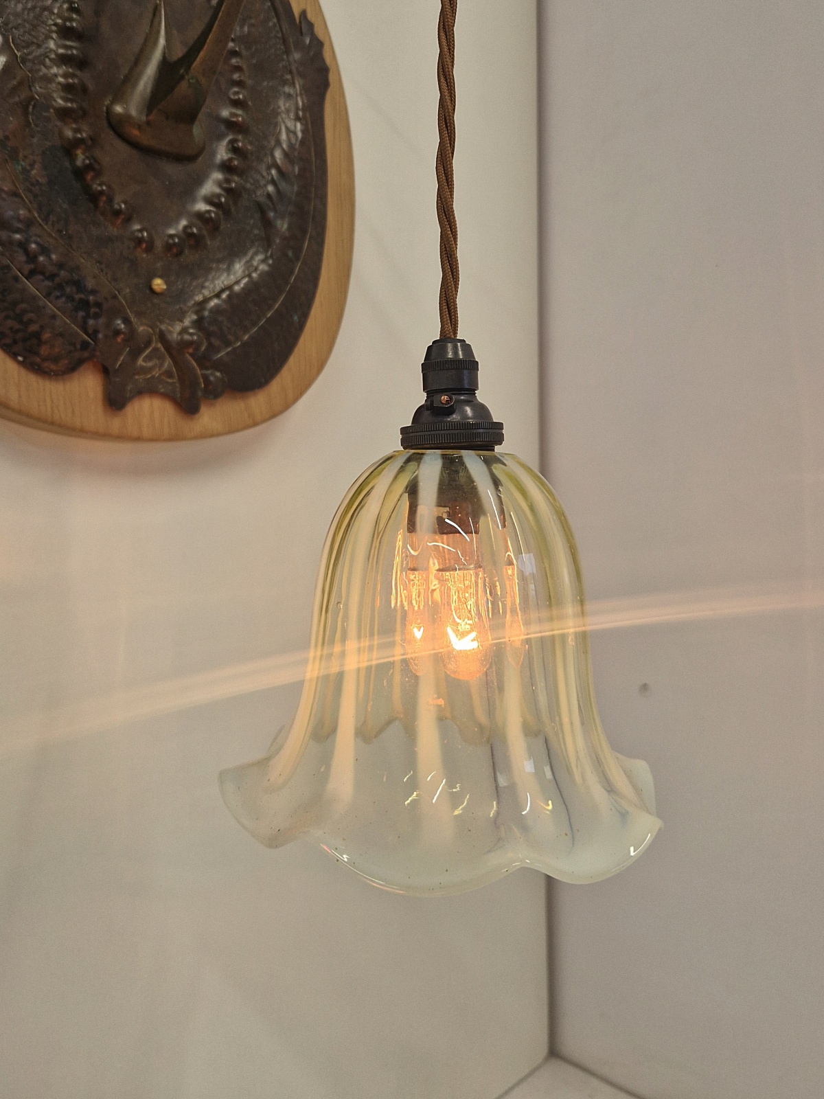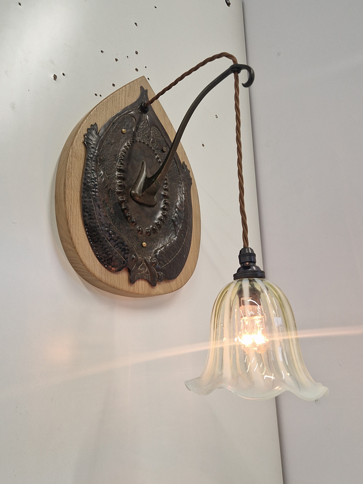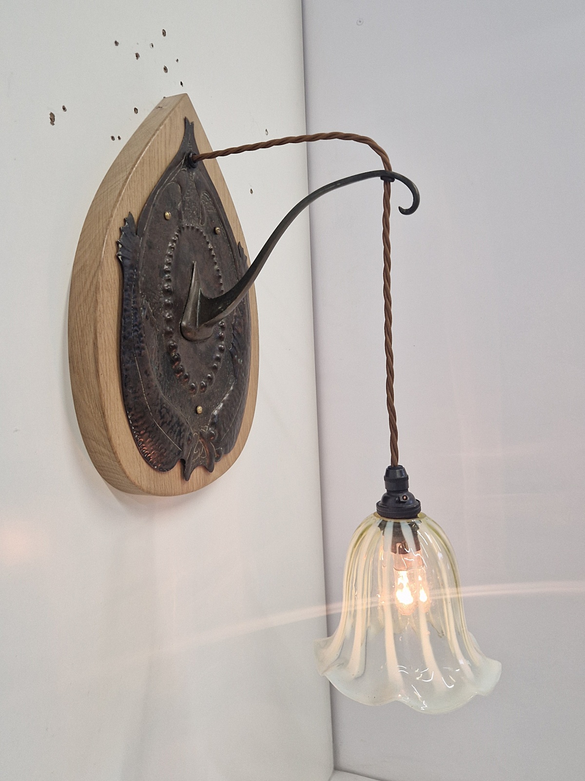 A pair of very rare and important bronzed-copper arts and crafts wall light in the style of John Pearson possibly for The Guild of Handicraft. The delicate & intricate designed sconces in a fish pattern and mounted on replacement oak back-plates . The wall lights now complemented with replacement vaseline-glass lampshades hand blown here by a UK based artisan. England c.1905