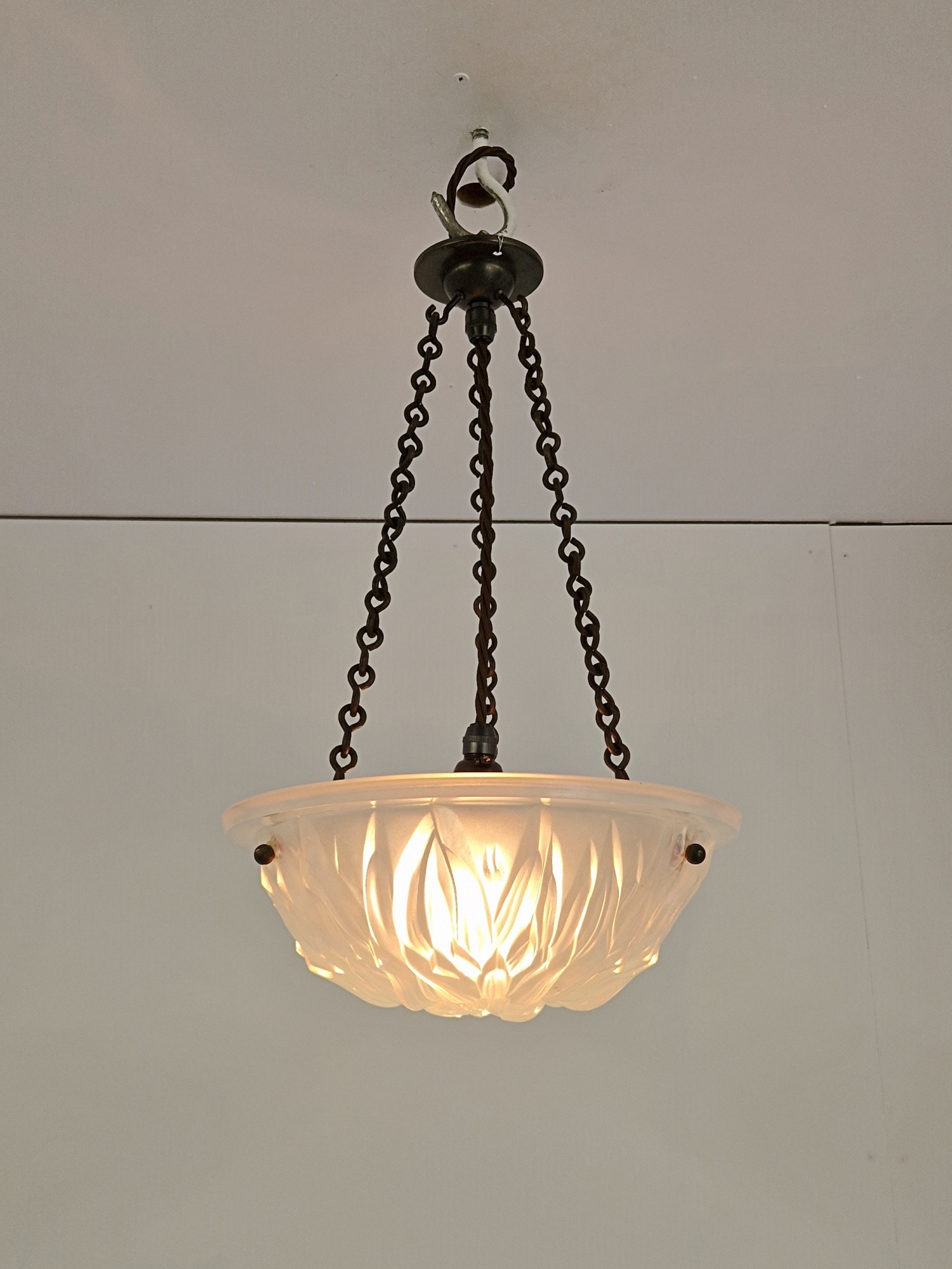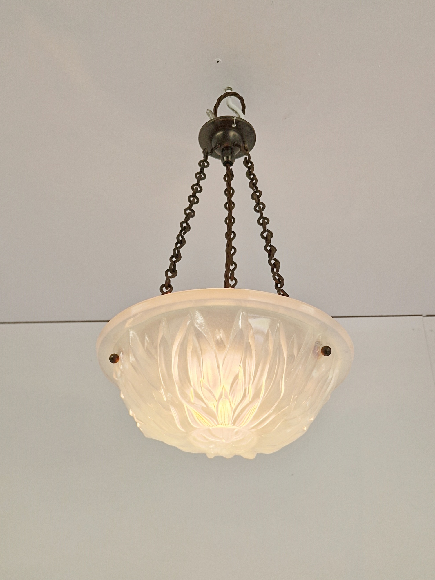 Product Code: LG693A small “Sunflower” opalescent-glass plafonnier in the style of René Lalique by an unknown designer. This bijou light comes with original chain and a replacement, but sympathetic, ceiling rose for suspension.