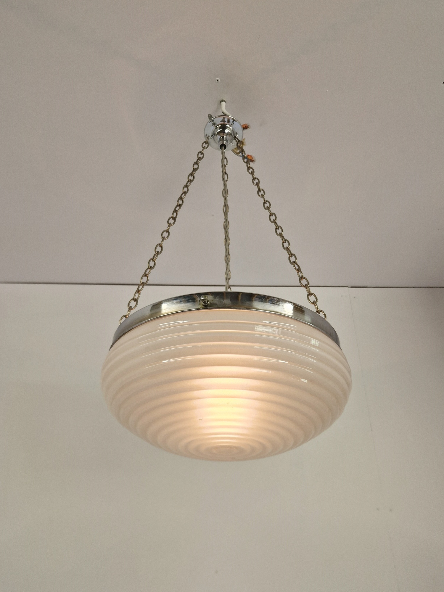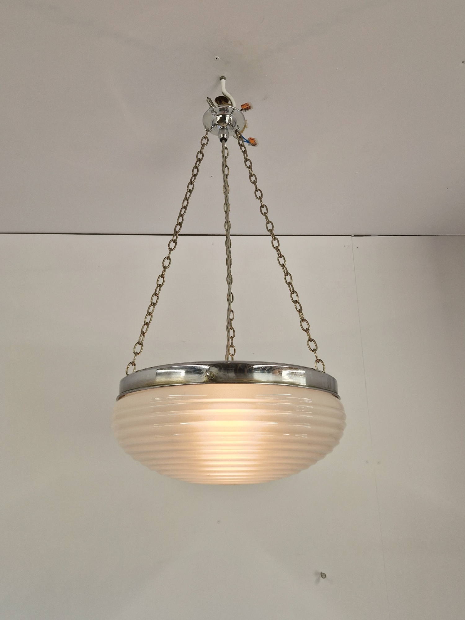 A moulded and polished glass art deco plafonnier of geometric design in the style of Sabino set into its original chromed frame with replacements chain and ceiling hook for suspension. France c.1930.