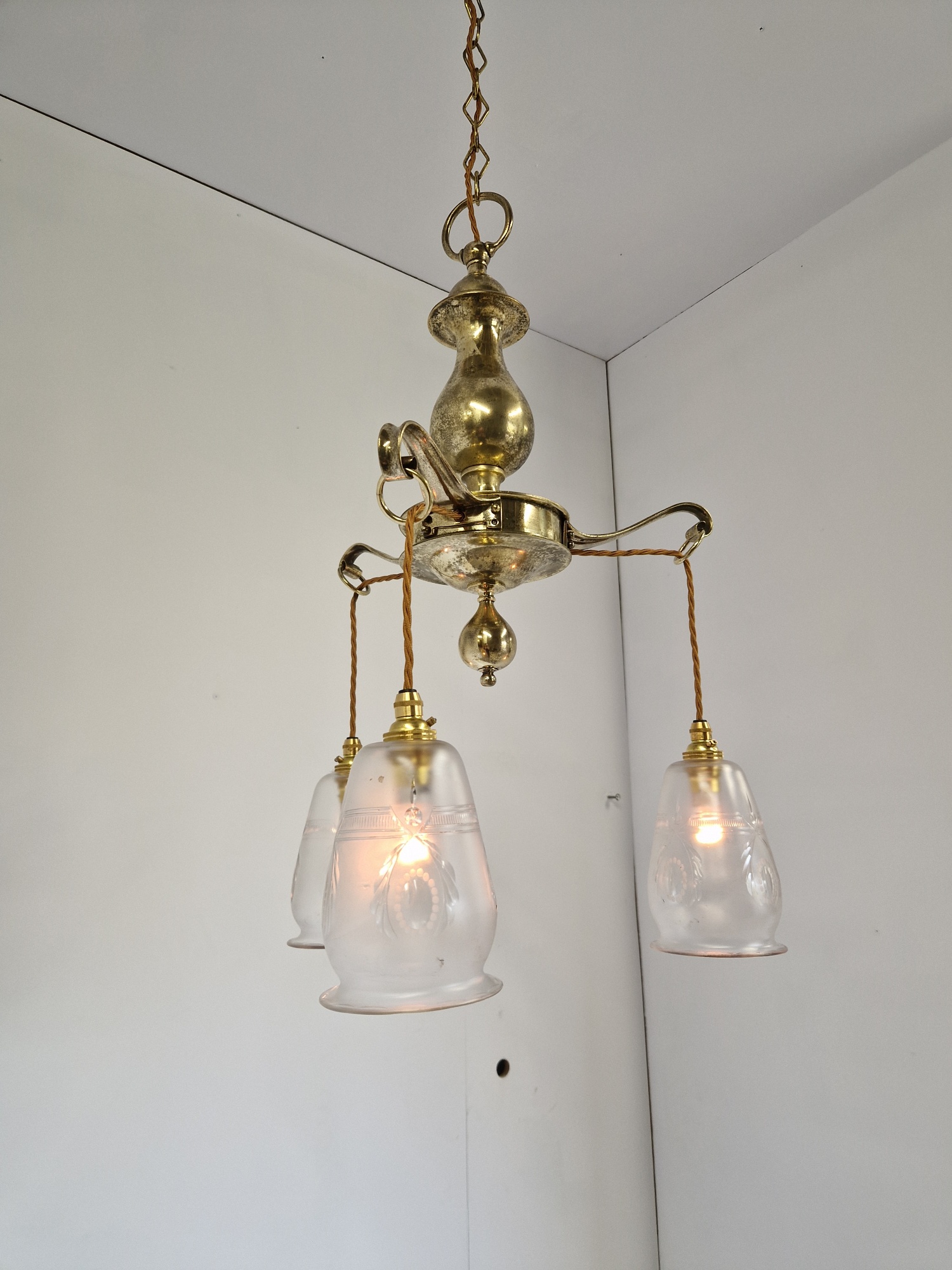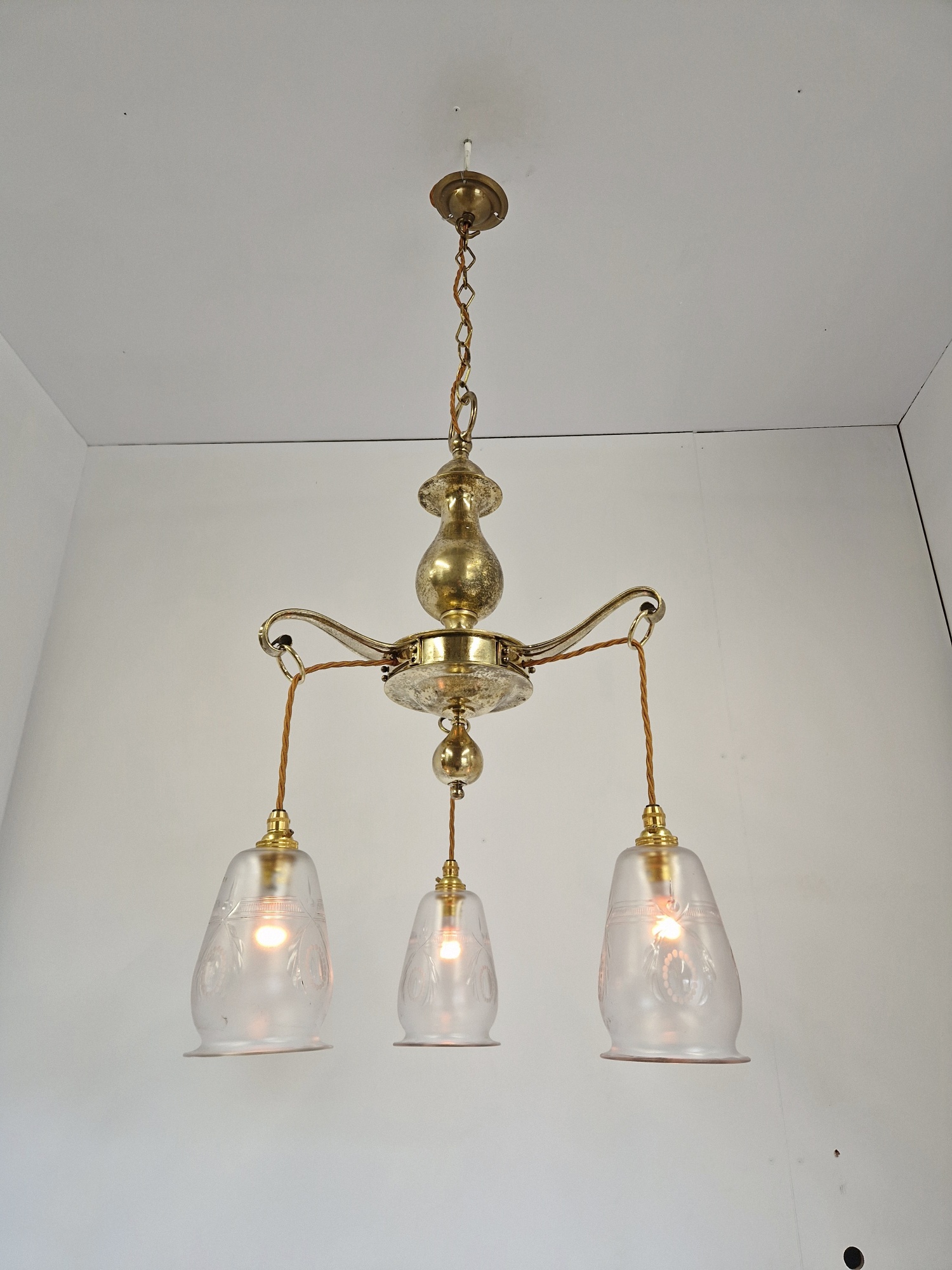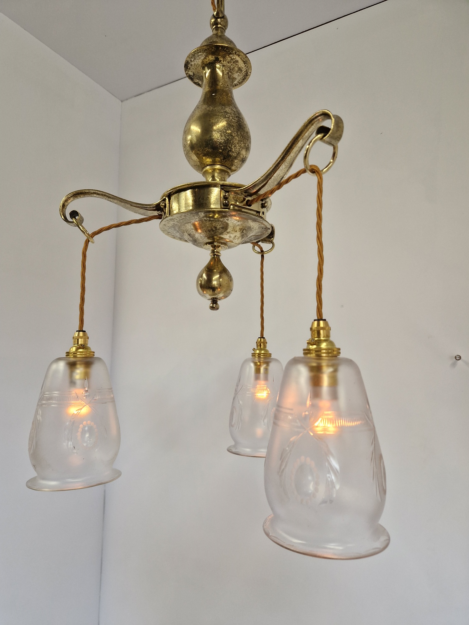 Product Code: LG687SA005A brass 3 branch electrolier very much in the robust style of The Birmingham Guild of Handicraft with flex rings to each arm commonly used by the company when designing their lights. The metalwork heavily pitted and distressed and most probably a design feature (see pictures). The light now hangs pendant 3 original satin & acid-etched lampshades. England c.1900
