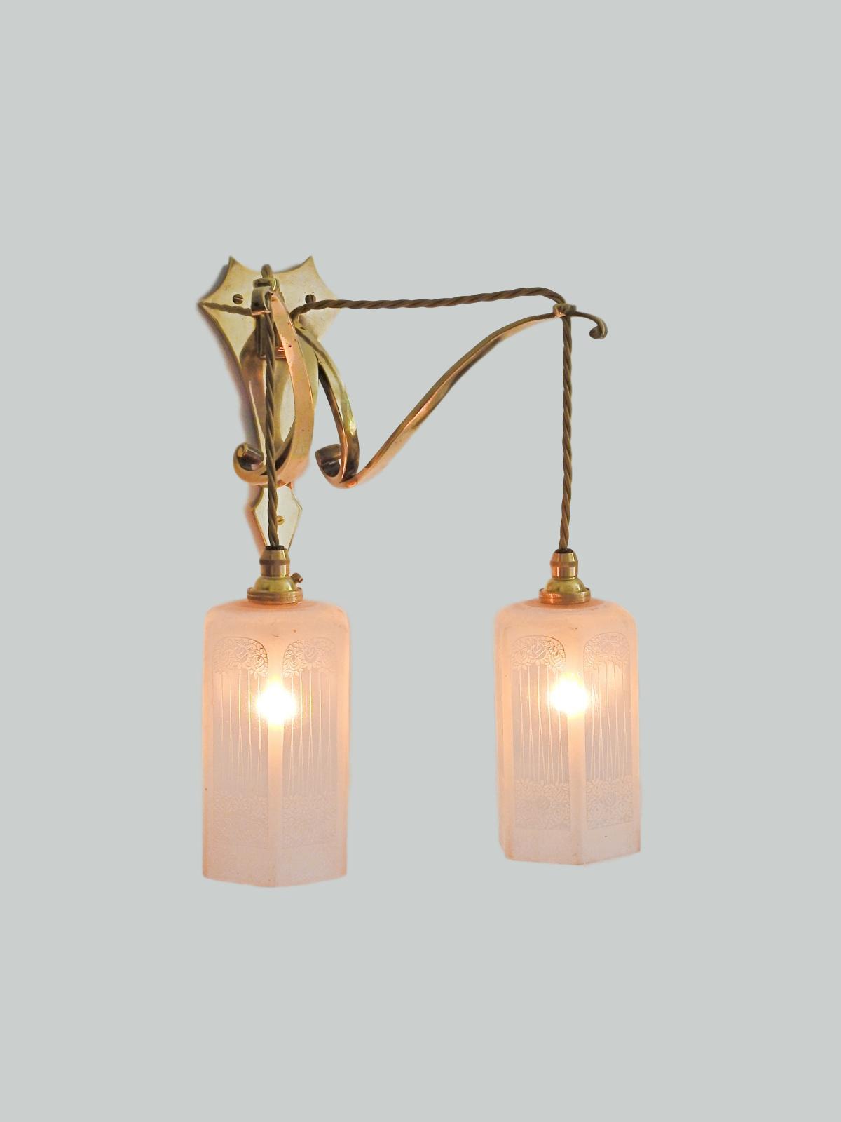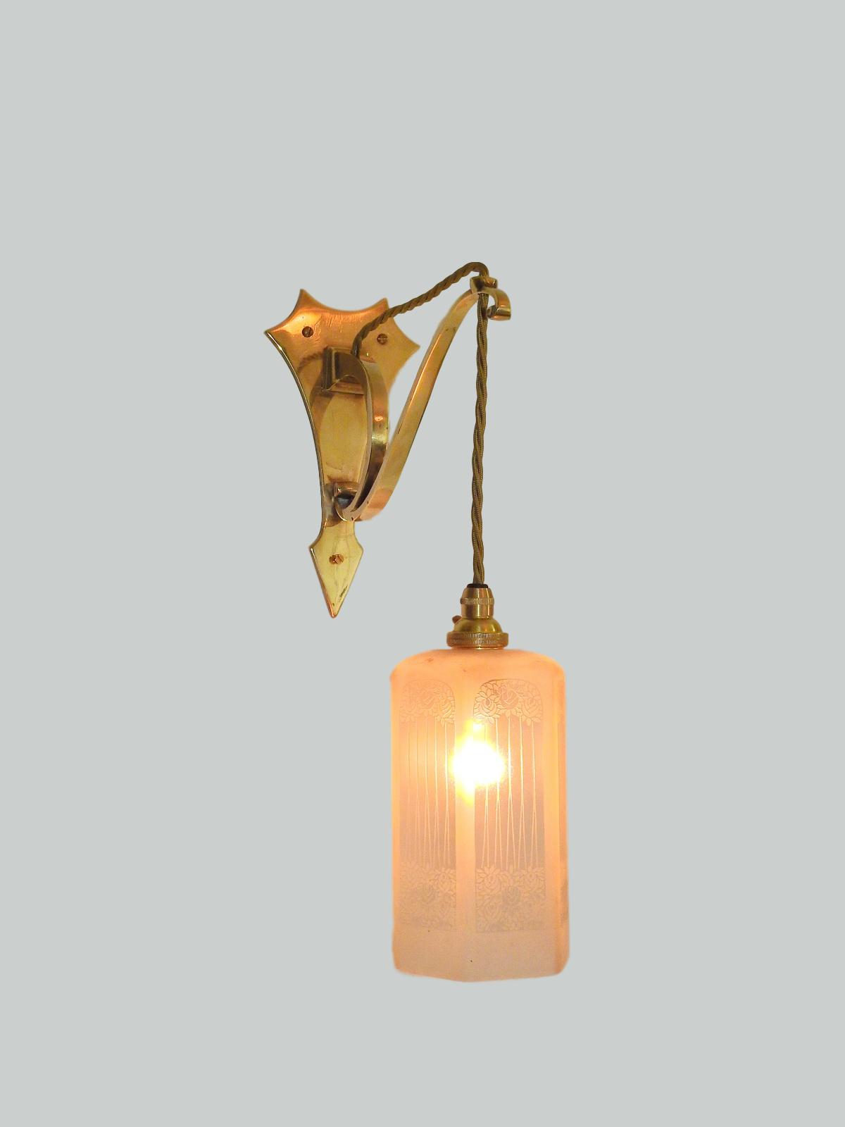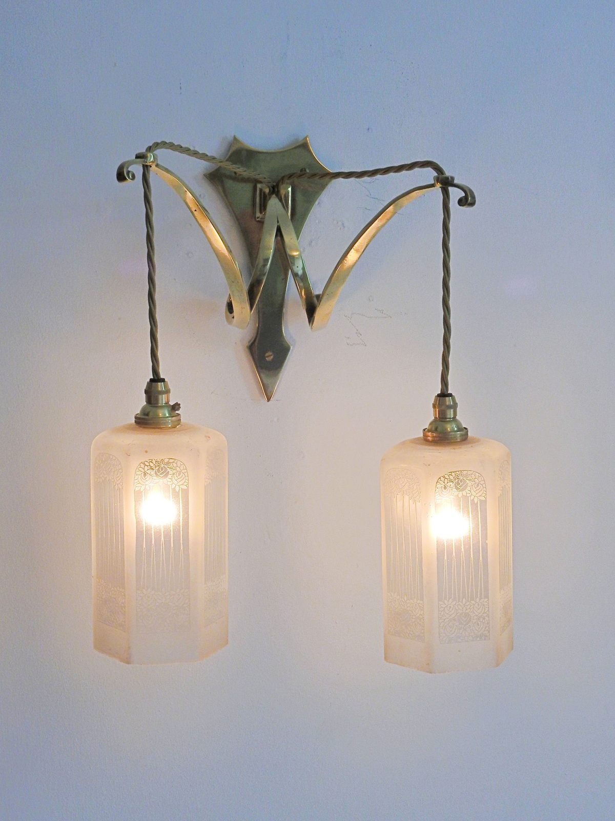 Product Code: LG466A set of 3 ensuite cast brass wall lights, comprising of 2 x single-arm and 1 x twin-arm fittings designed and signed by the General Electric Company. Each arm supporting pendant a frosted and engraved lampshade designed with stylised roses in the manner of The Glasgow School. England c.1905