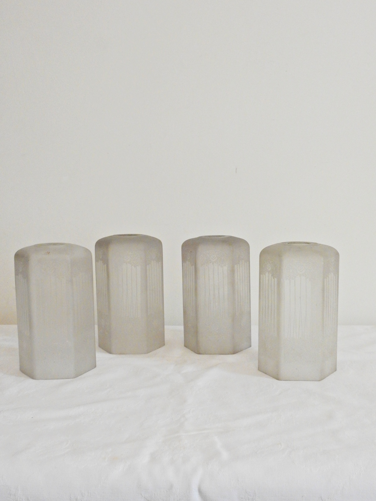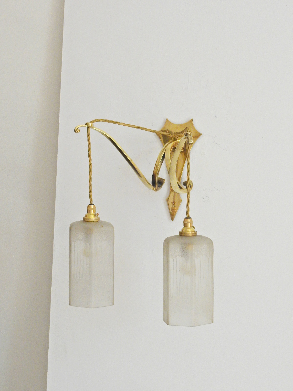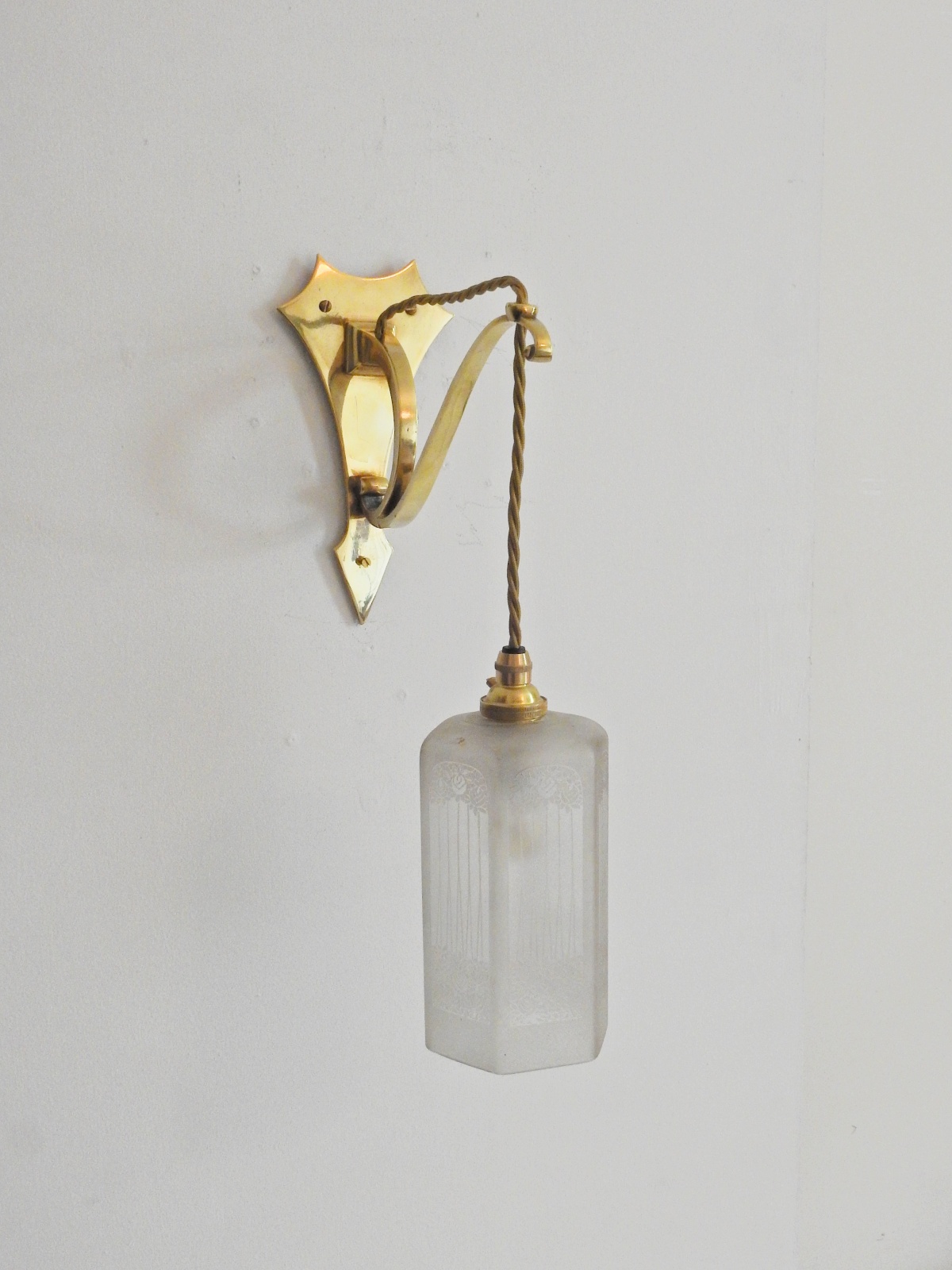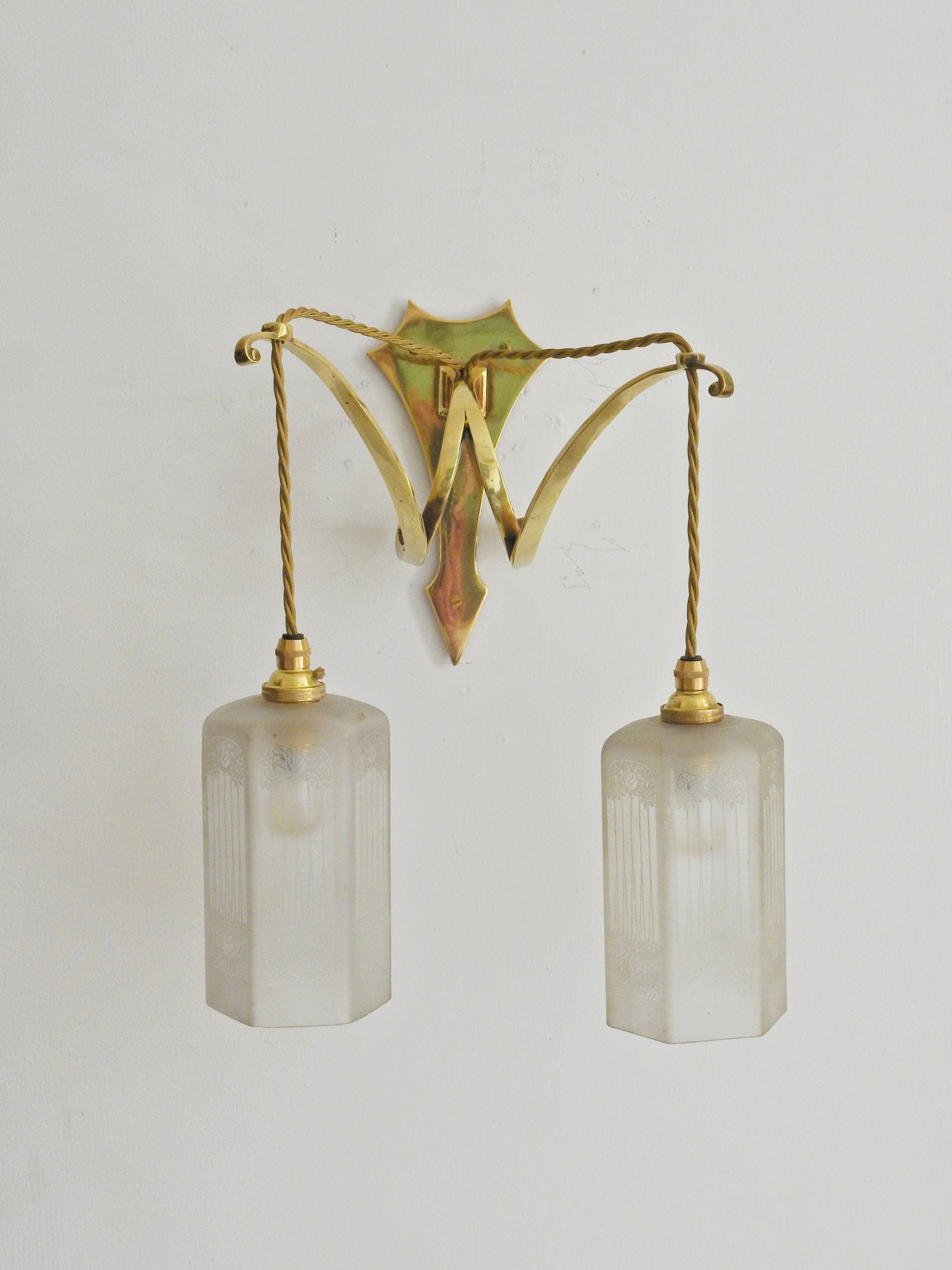 Product Code: LG466A set of 3 ensuite cast brass wall lights, comprising of 2 x single-arm and 1 x twin-arm fittings designed and signed by the General Electric Company. Each arm supporting pendant a frosted and engraved lampshade designed with stylised roses in the manner of The Glasgow School. England c.1905
