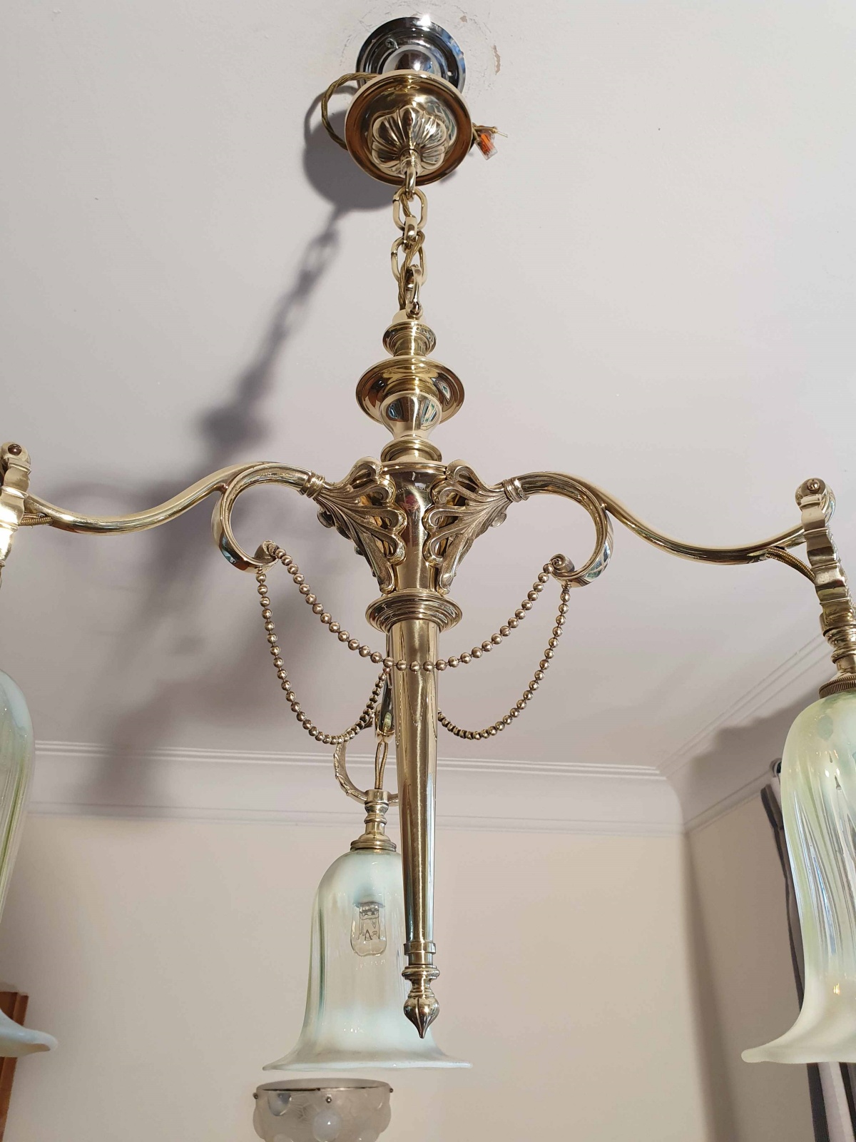 Product Code: JAL1050VAS086A good quality 3-branch electrolier by The General Electric Company in a soft classical style and apparently unsigned. The cast brass lamp complimented with 3 reproduction vaseline glass lampshades. England c.1925