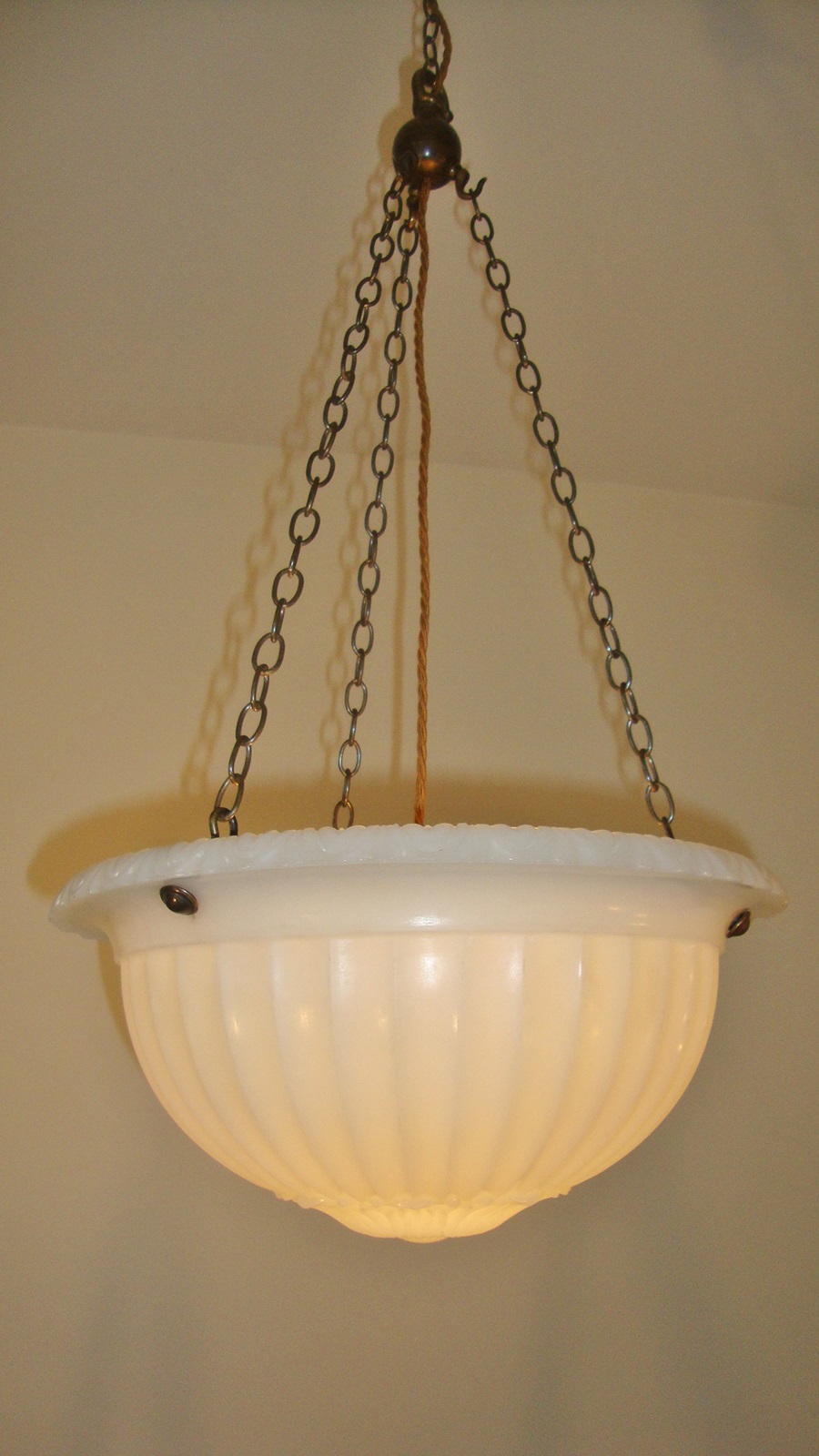Product Code: JAL0971Elegant white Opaline glass “moonstone” hanging lampshades by The General Electric Company of moulded ribbed form with bronzed metal fitments for suspension. England c.1925.
