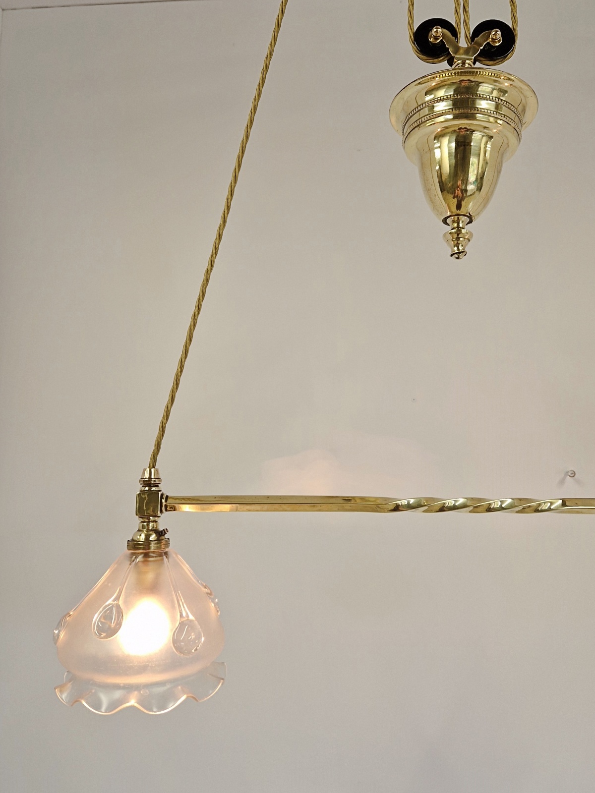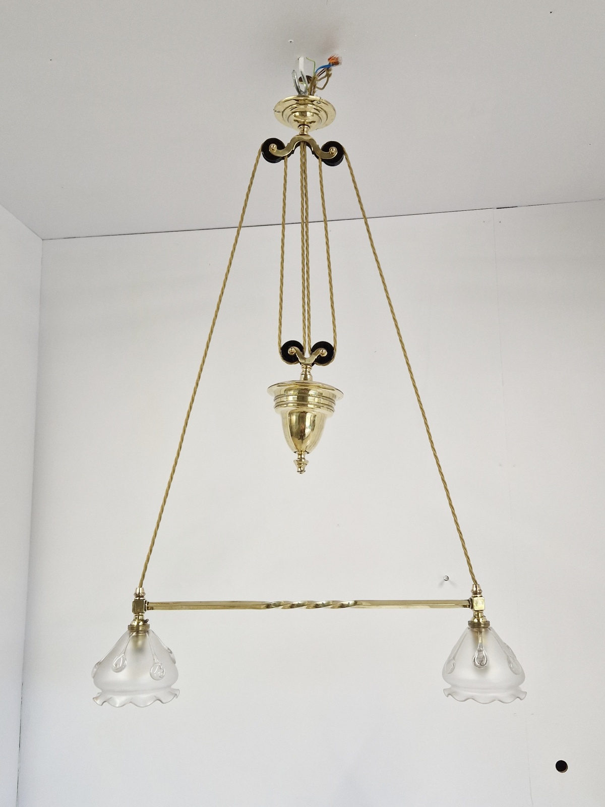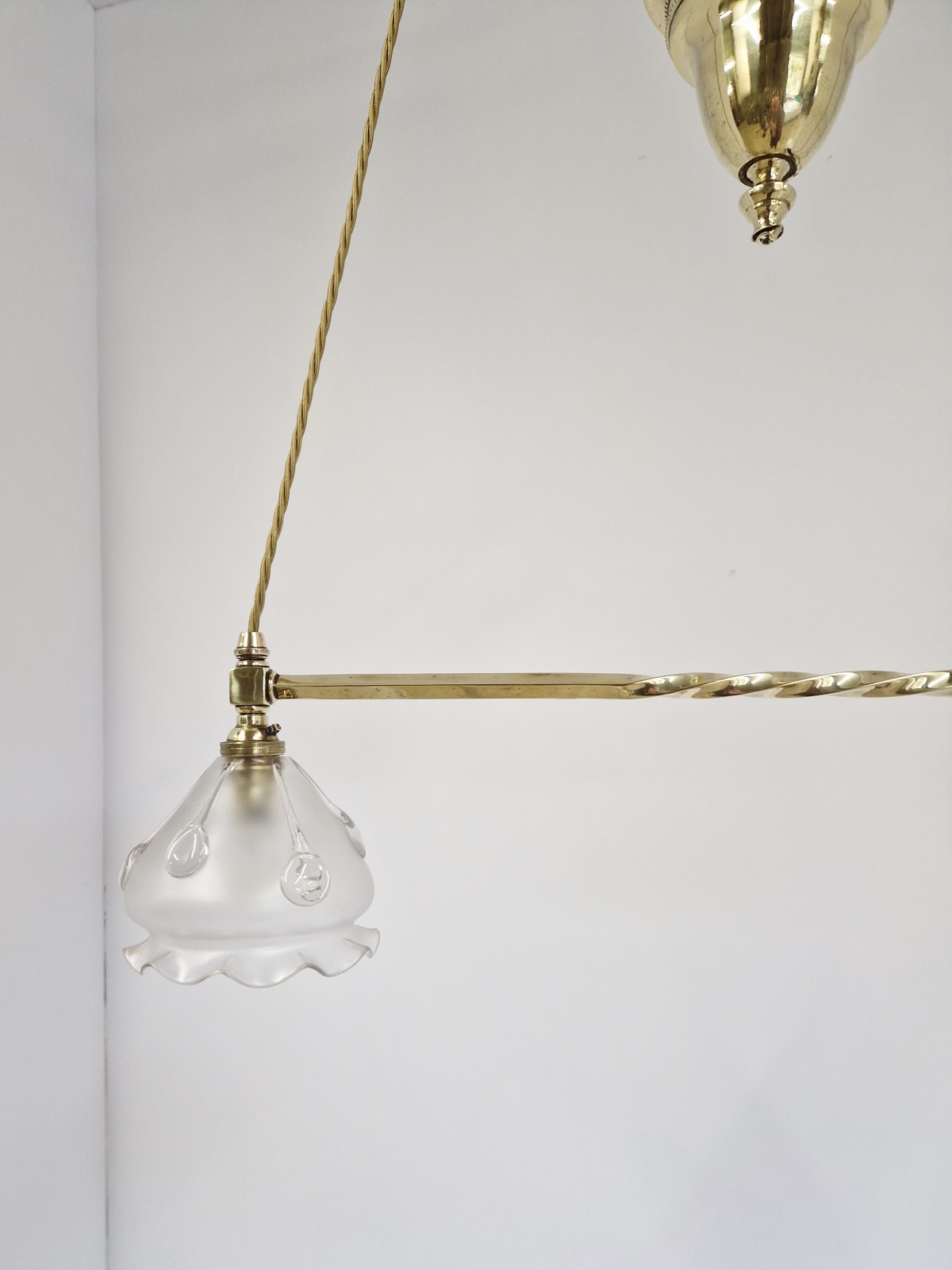 Product Code: JAL1116SA14A brass two arm “rise and fall” Edwardian hanging light by The General Electric Company (G.E.C) complimented with a pair of satin-glass “teardrop” lampshades probably by Stuart & Sons. England, c.1905.