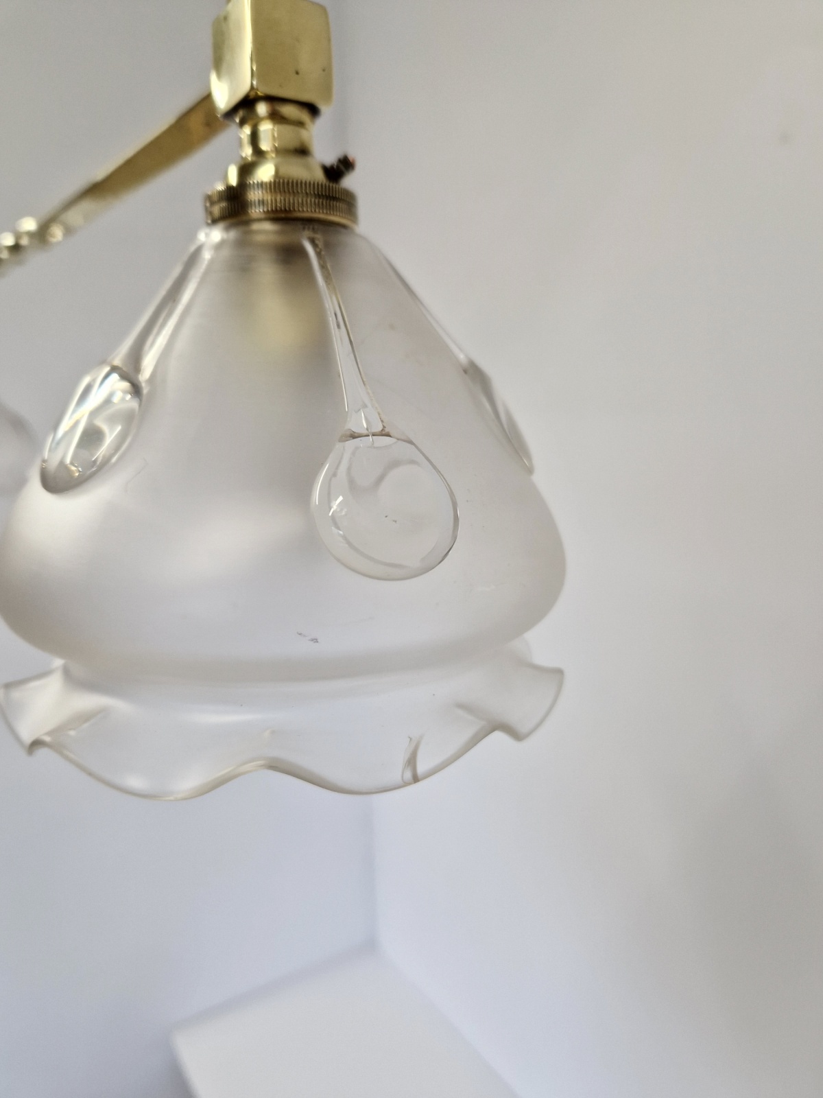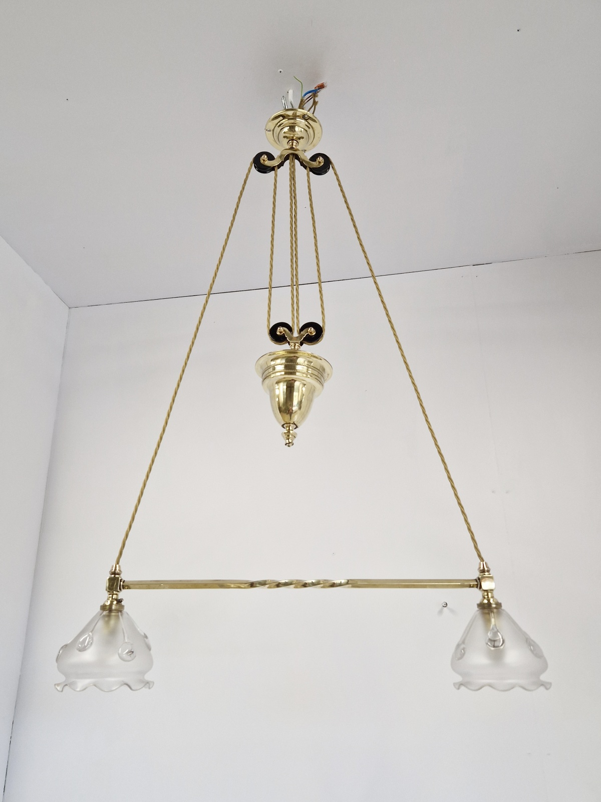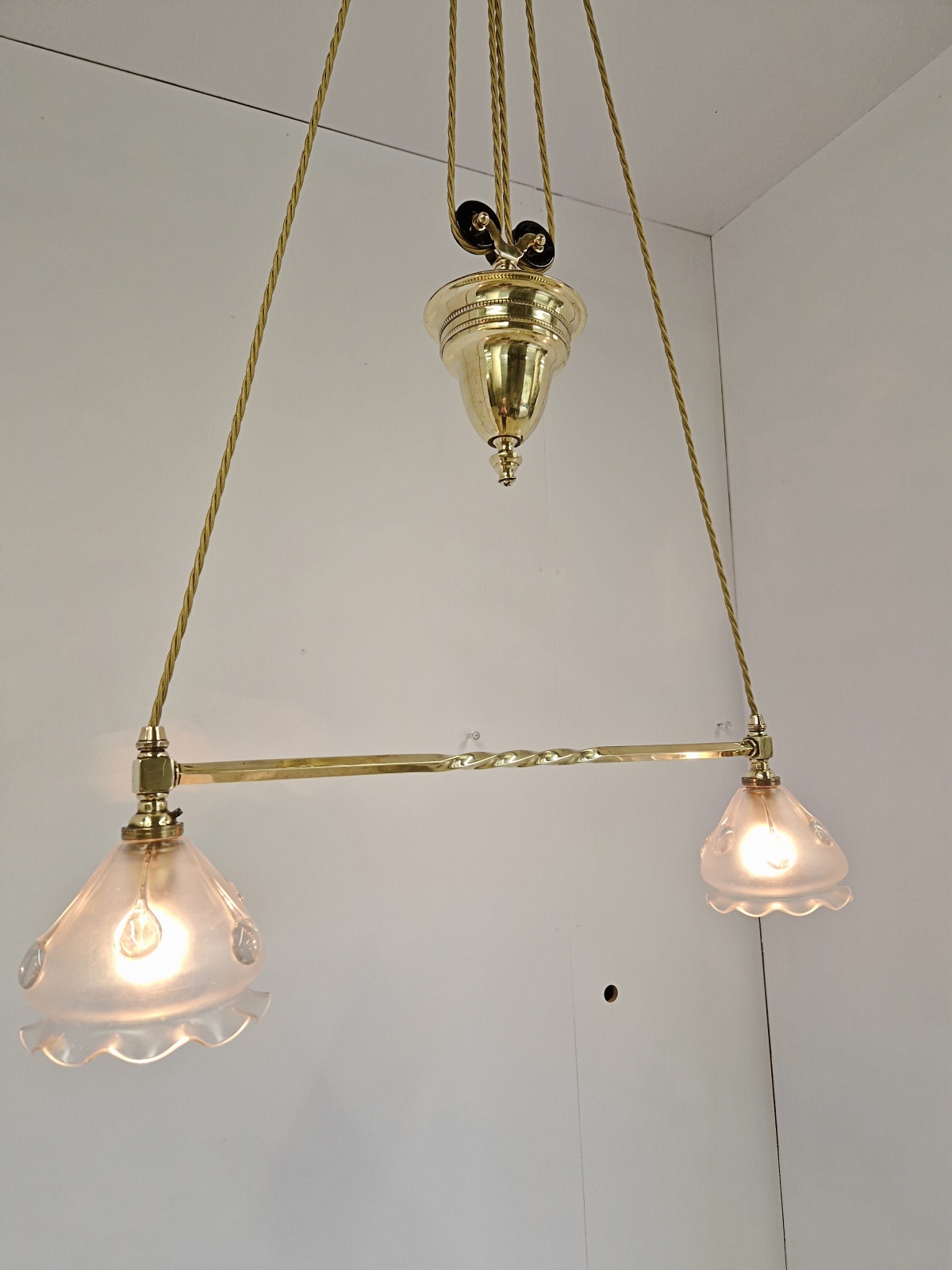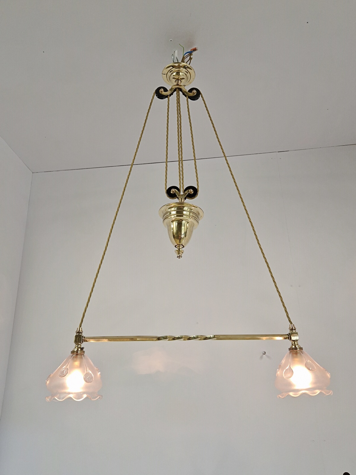 Product Code: JAL1116SA14A brass two arm “rise and fall” Edwardian hanging light by The General Electric Company (G.E.C) complimented with a pair of satin-glass “teardrop” lampshades probably by Stuart & Sons. England, c.1905.