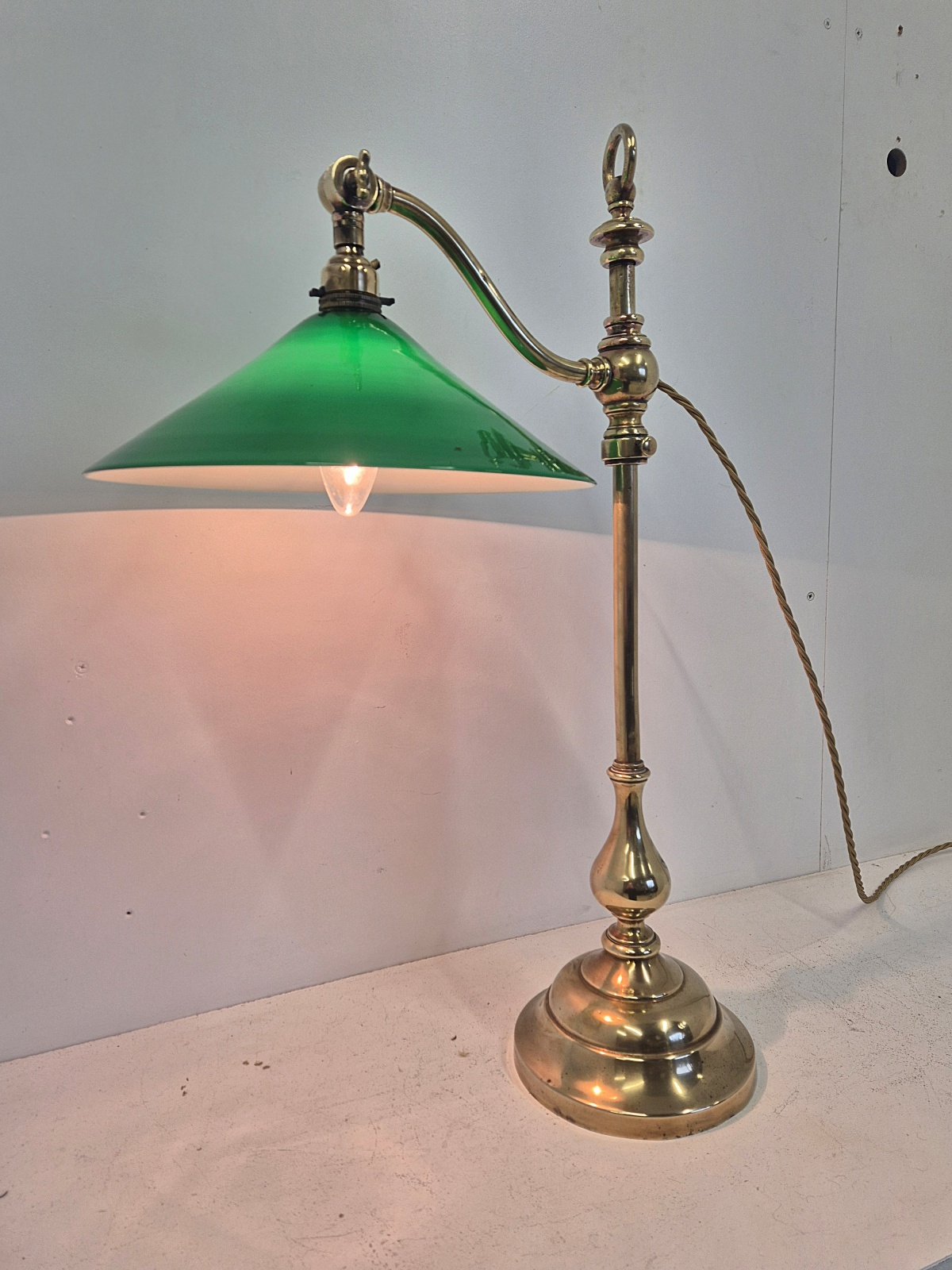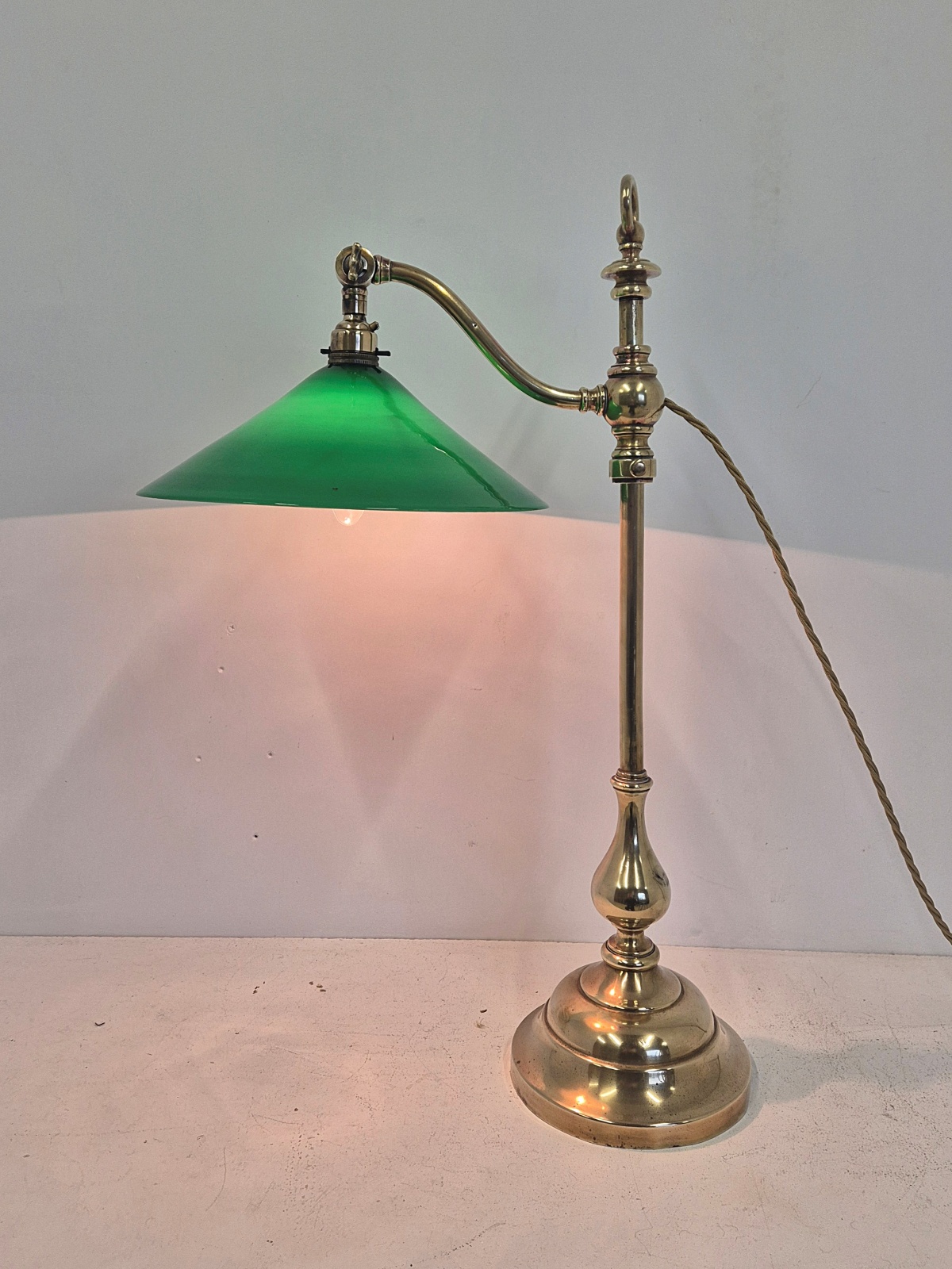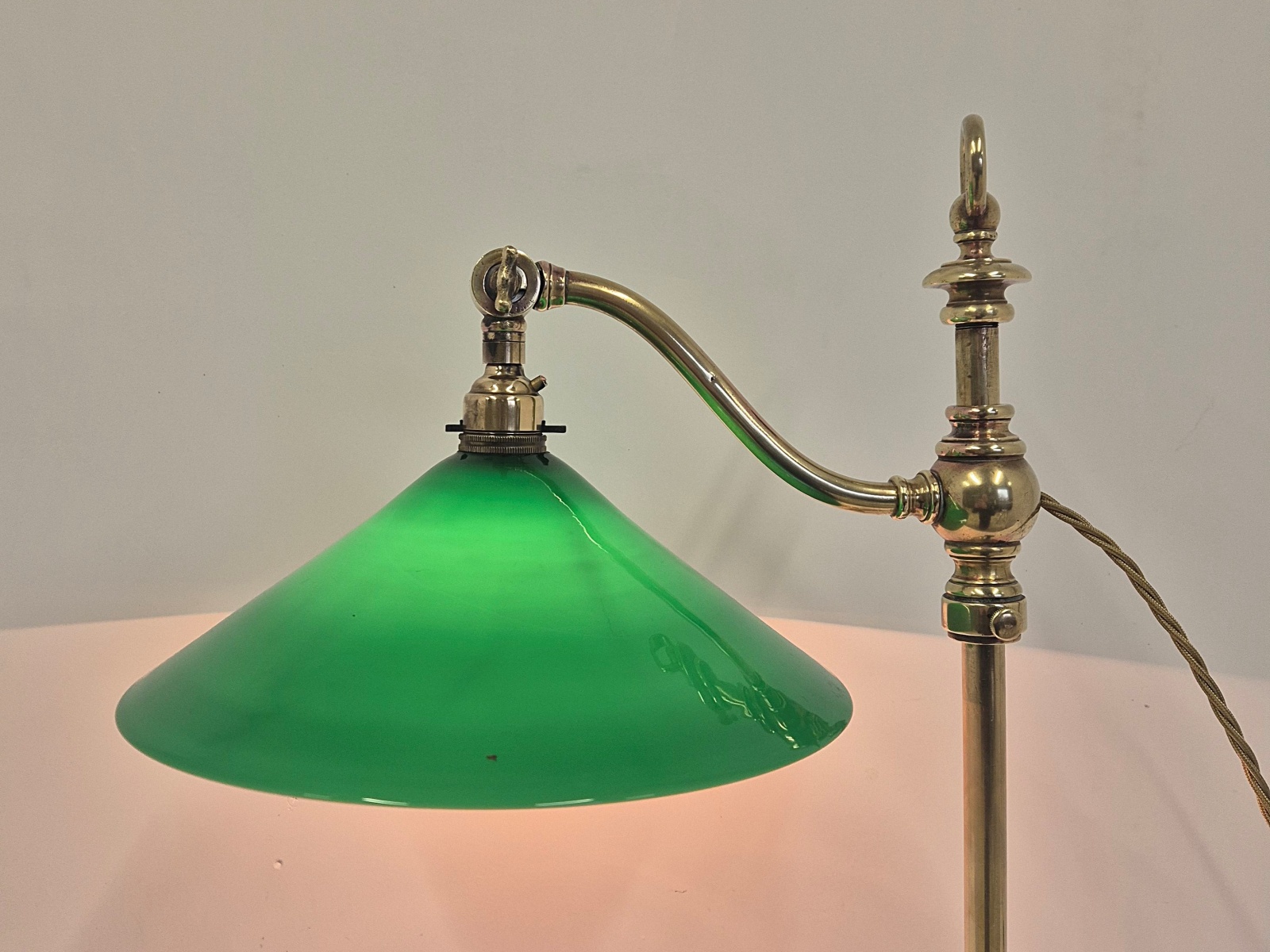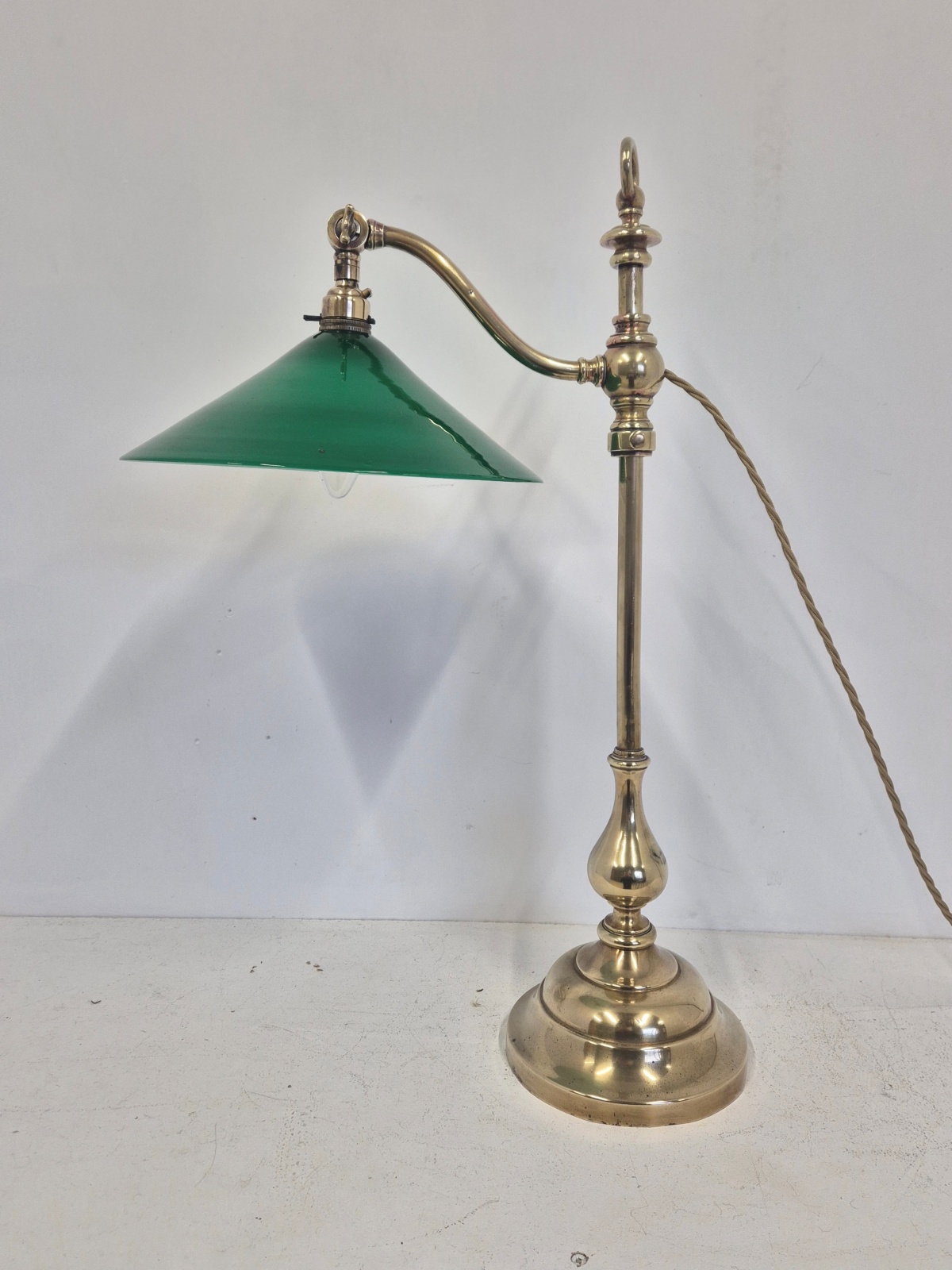 Product Code: JAL0606.1165An adjustable brass student’s desk lamp signed GEC for The Generel Electric Company with green coolie lampshade as seen in the catalogue photos of 1905. England early c.20th